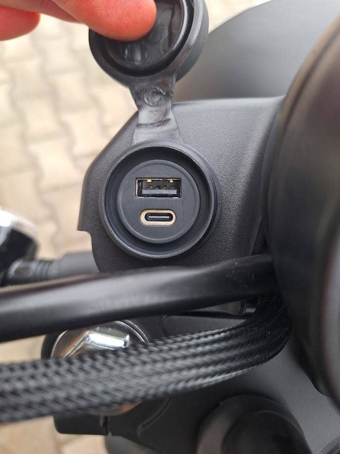V kokpitu je hned vedle LCD panelu integrována zásuvka USB-A a USB-C! Můžete skrz ně nabíjet například mobilní telefon, nebo zapojit navigaci. USB zásuvky mají samozřejmě voděodolnolu gumovou krytku
