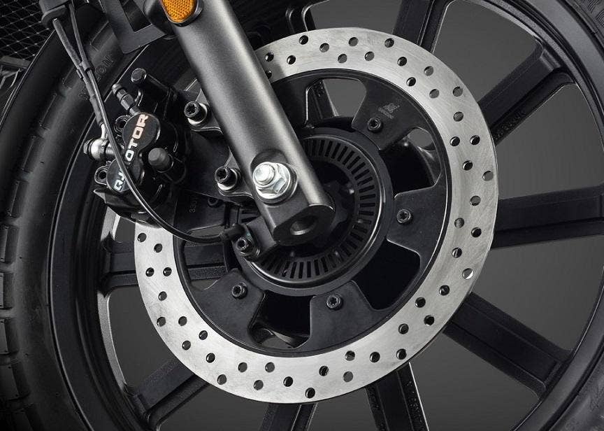 Brzdový systém SRV 125 je osazený systémem ABS a spolu s kotoučovými brzdami vpředu i vzadu nabízí bezpečné zastavení v každé jízdní situaci. Přední brzdový třmen, spolu s kotoučem o průměru solidních 280 mm zajišťuje přesně dávkovanou brzdnou sílu.