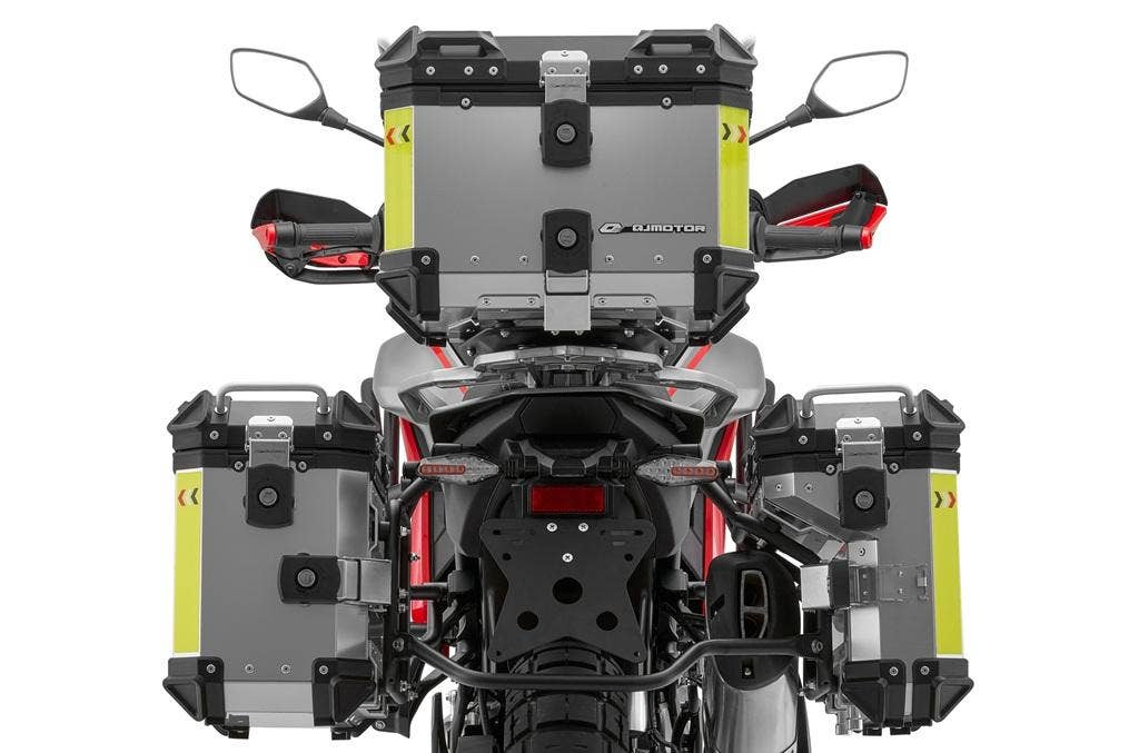 K SRT 450 RX dostanete zdarma též kvalitní originální sadu uzamykatelných hliníkových kufrů QJMOTOR. Horní kufr a boční kufry lze sejmout v několika jednoduchých krocích a nabízí velký úložný prostor pro každé dobrodružství. Horní kufr s úložným prostorem 45 litrů a dva boční kufry o objemu 37 a 30 litrů nabízejí dostatek místa pro Vaše cestovní vybavení. Kufry jsou uvnitř polstrované a mají praktické vniřní kapsy.