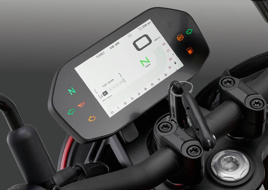 Digitální přístrojová deska SRK 800 je vizuálním a technickým srdcem kokpitu. Tento velký barevný TFT displej zobrazuje velké množství informací, je snadno čitelný ve dne i v noci a umožňuje Vám snadno upravit si motocykl přesně pro sebe. Kromě toho má schopnost propojit se s mobilním telefonem jezdce, s možností zobrazení navigace, která zobrazuje i aktuální provoz, nebo také umožňuje zrcadlit obrazovku Vašeho mobilního telefonu. Dále přístrojový panel umožňuje spravovat a prohlížet si příchozí hovory.