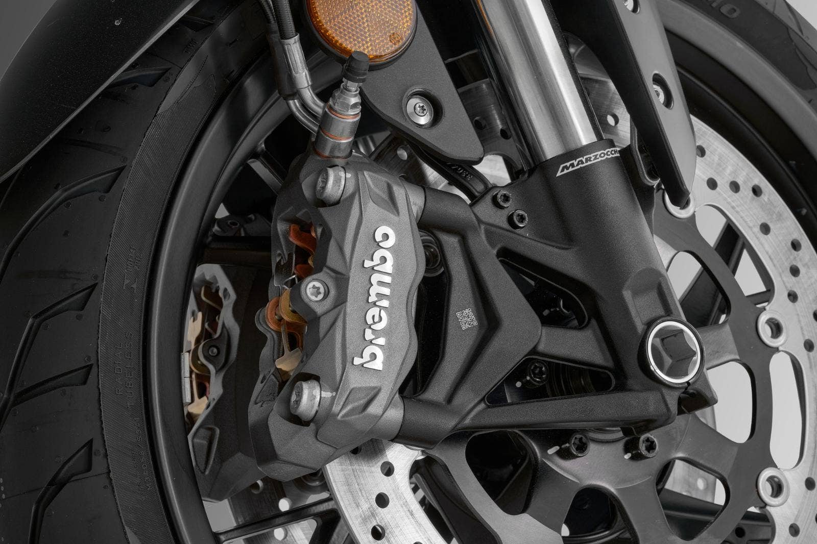 Opravdu výkonný brzdový systém SRK 800 je vybavený dvouokruhovým systémem ABS a kotoučovými brzdami BREMBO s kotouči o velkém průměru vpředu i vzadu. Nabízí bezpečné zastavení v každé jízdní situaci, ať už na silnici a nebo na závodním okruhu. Přední dvoukotoučová brzda s kotouči o průměru 320 mm a s radiálně uloženými čtyřpístkovými brzdovými třmeny a radiální brzdovou pumpou zajišťují silnou, avšak přesně dávkovanou brzdnou sílu. To vše skvěle doplňuje zadní brzda s kotoučem o průměru 260 mm a s dvoupístkovým třmenem.