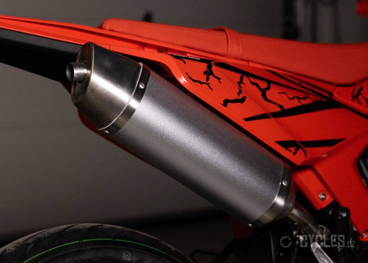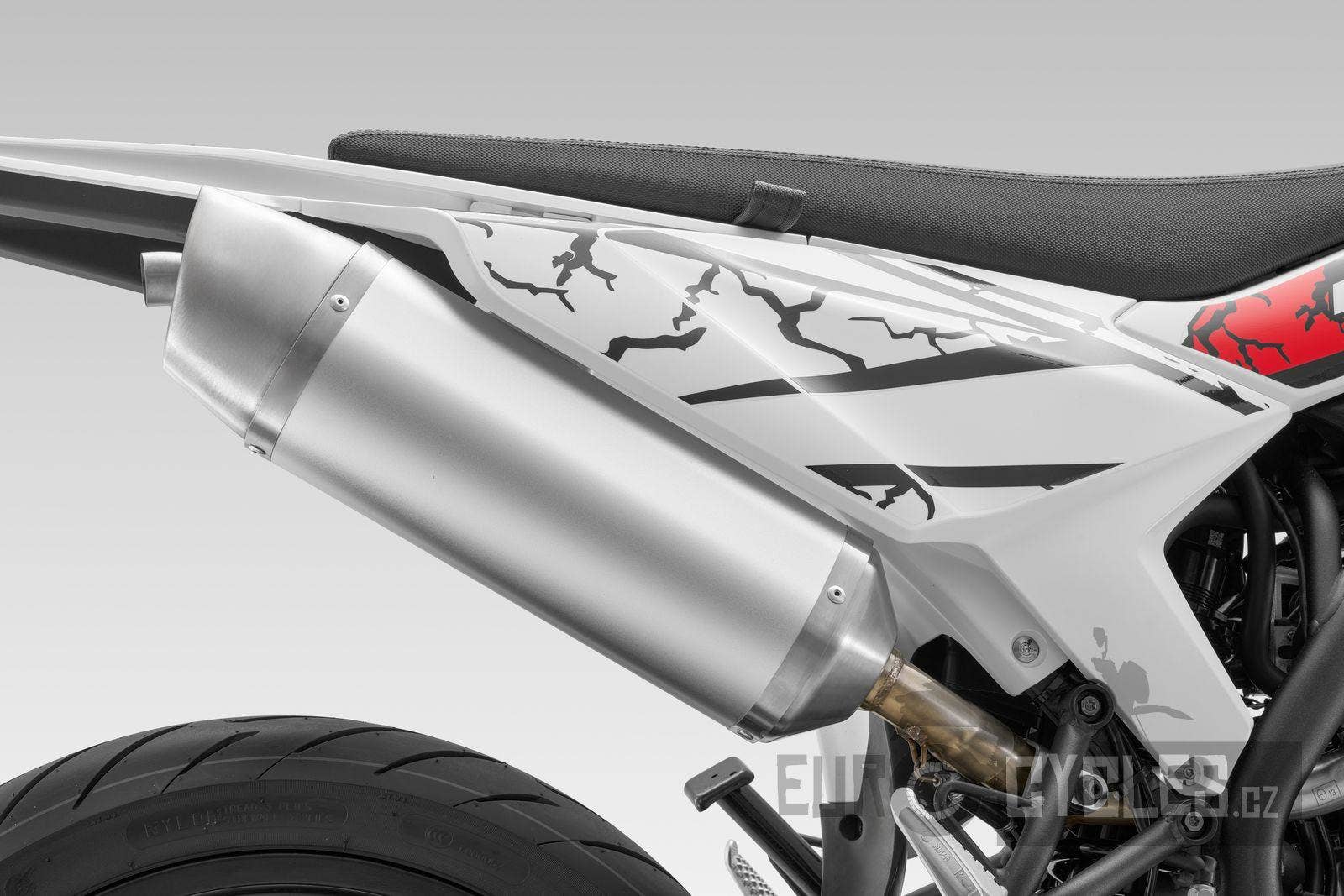 Stejně jako každý opravdový motard je i COV 125 vybaven lehkým, vysoko umístěným tlumičem MX, úhledně schovaným mezi bočním panelem podsedlové kapotáže a zadním blatníkem. Tento výfuk je navíc hodnotný svým zvukem, který je naprosto kultivovaný a dodá Vám hrdost z COV 125.