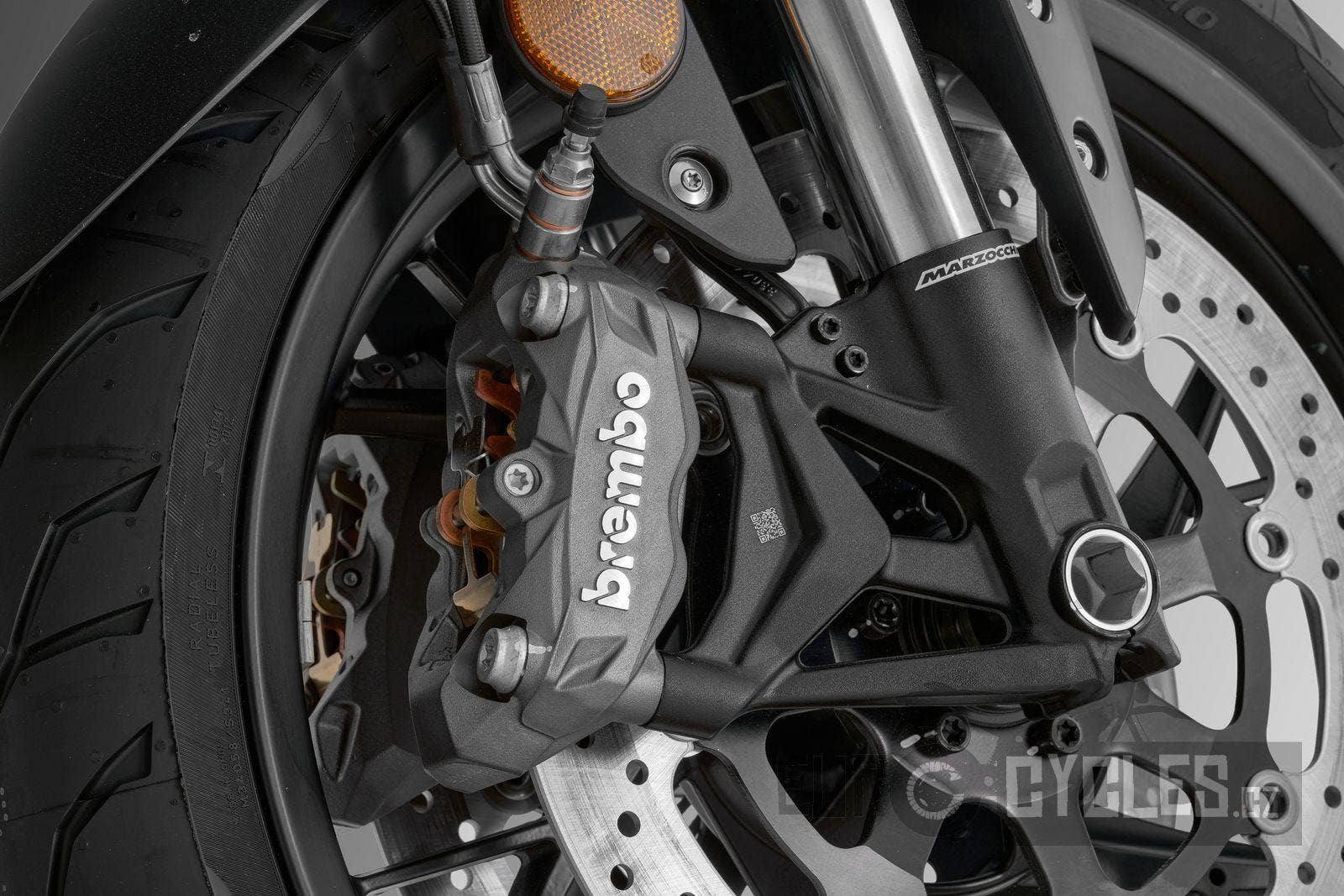 Celý brzdový systém SRK 800 se skládá z opravdu kvalitních komponentů. Radiální brzdové třmeny Brembo skvěle doplňuje i radiální brzdová pumpa. Hlavní rozdíl mezi radiální a axiální pumpou je směr pohybu pístku. Radiální pístek se pohybuje ve stejném směru jako brzdová páčka, tedy kolmo (nebo velmi blízko kolmému směru) k řídítku. Je tedy pochopitelné, že získáte lepší cit při brzdění, když se páčka pohybuje ve stejném směru jako pístek. To je hlavní výhoda radiální konstrukce. Brzdění je tak citlivější a lépe dávkovatelné. Samozřejmostí jsou i nastavitelné páčky spojky a brzdy pro co nejlepší ovladatelnost SRK 800.