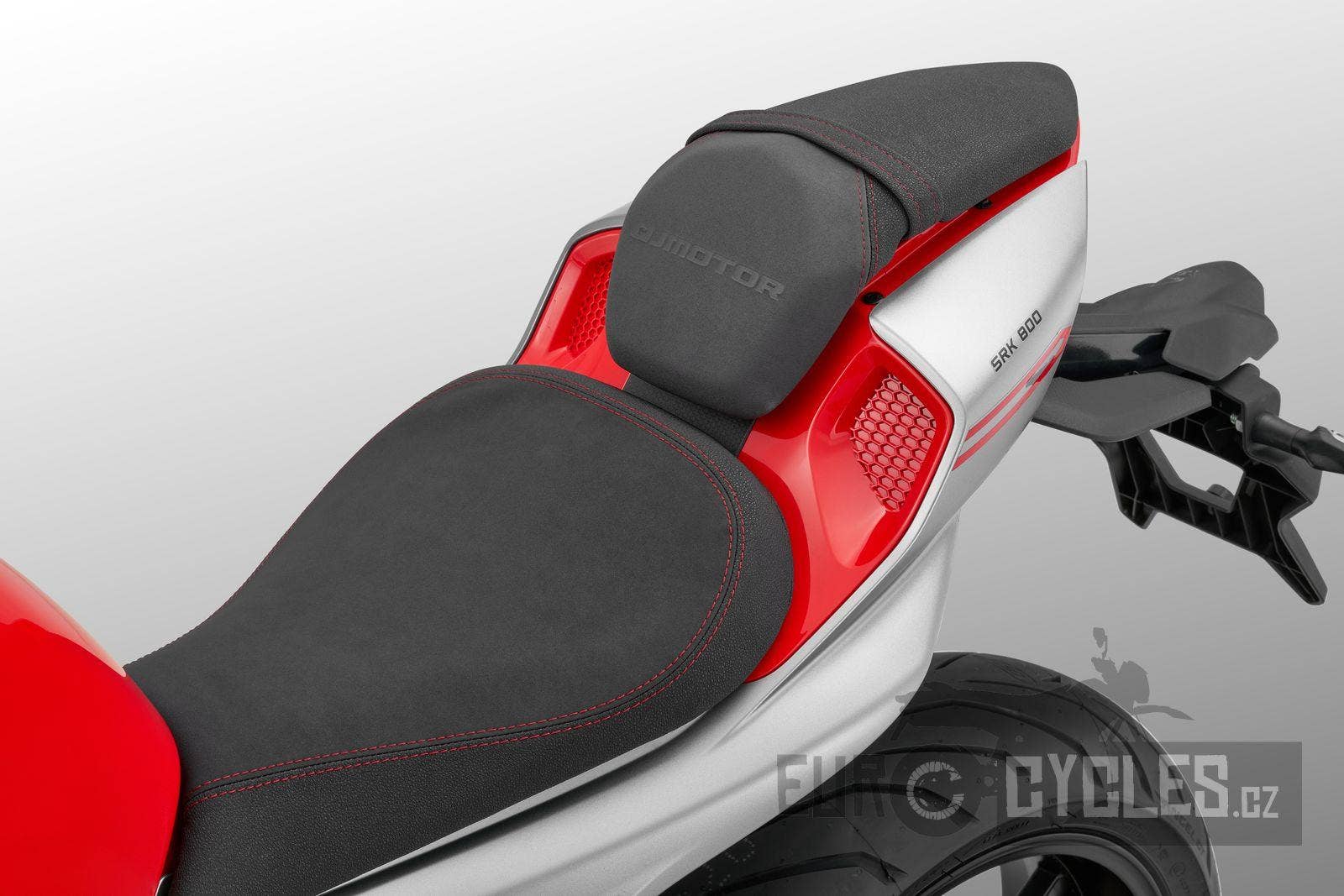 Dvoudílná sedadla s krásně červeně prošívaným sedadlem řidiče i spolujezdce nabízí velký jízdní komfort i na delších výletech. Jeho jedinečný design a autentický minimalistický styl podsedlovky dodává SRK 800 ten správný šmrc.