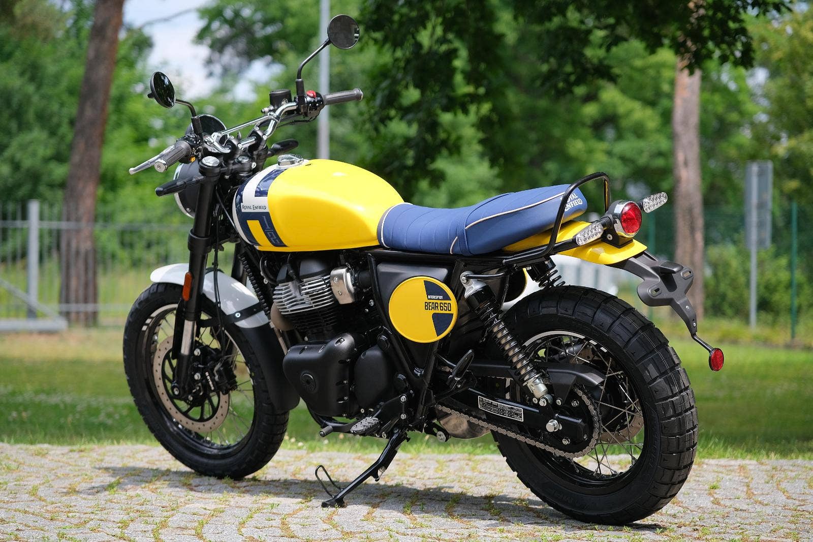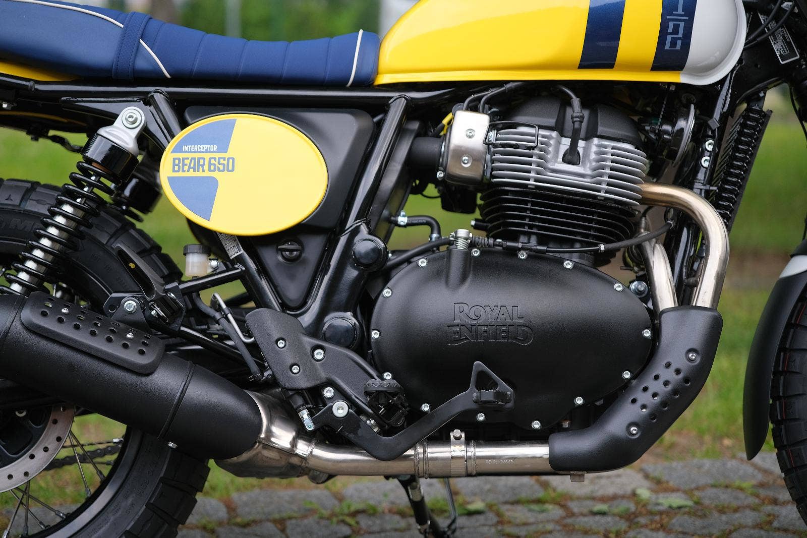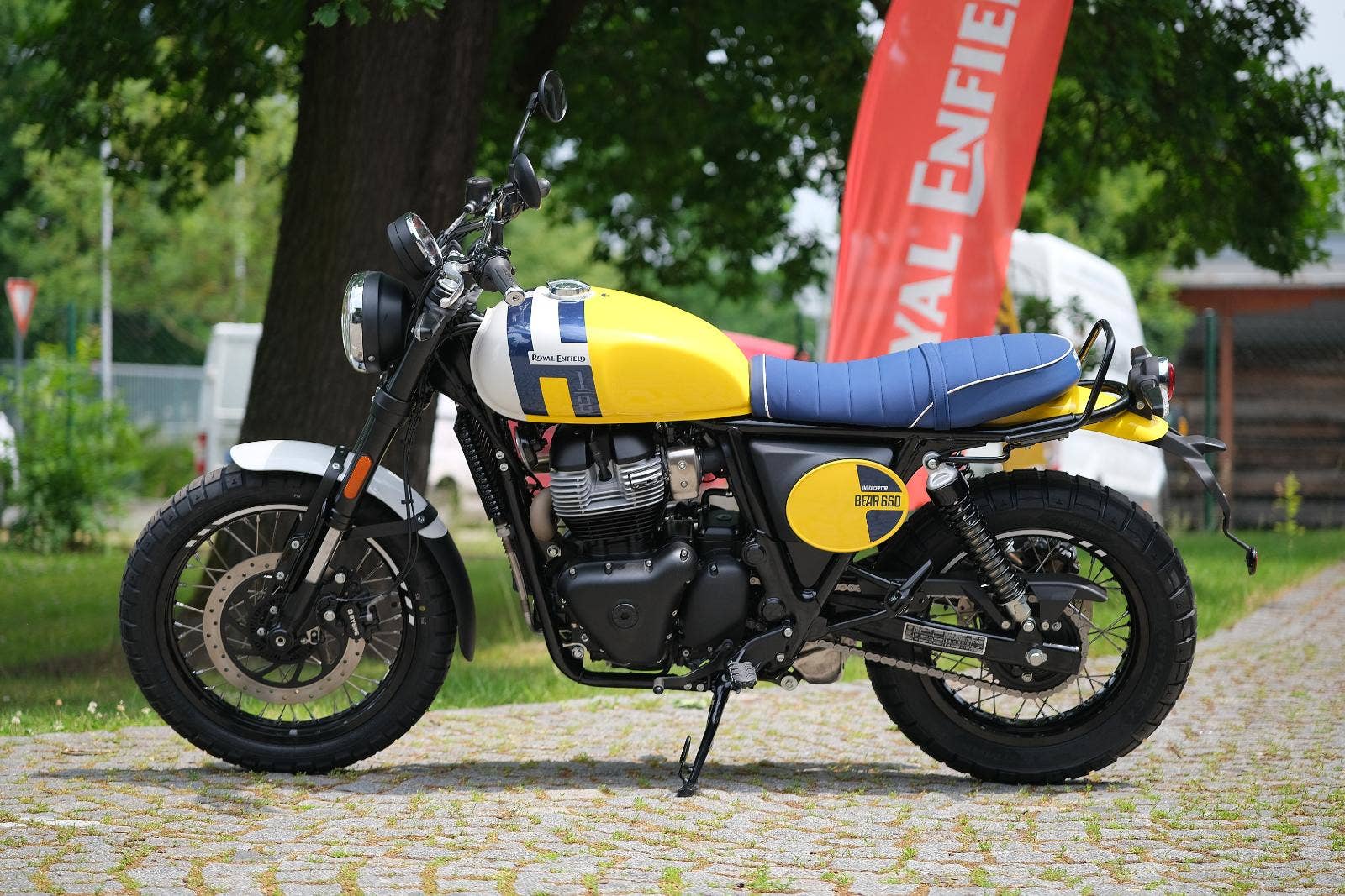 Stylový scrambler s duší 60. let založený na Interceptoru 650 a inspirovaný historickým vítězstvím Eddieho Muldera na Big Bear Run v roce 1960. Poháněný citem a sílou opěvovaným650cc paralelním dvouválcem Royal Enfield. Bear 650 kombinuje autentický styl scrambleru s drsným a nekompromisním duchem. Kombinace předního a zadního kola19”/17” s robustními pneumatikami pro nezpevněné povrchy, sedadlo ve stylu scrambleru, zvednutý podsedlový rám a 184mm světlá výška z něj dělají dokonalého společníka pro jezdce, kteří hledají styl a oldschool pohled na věc.