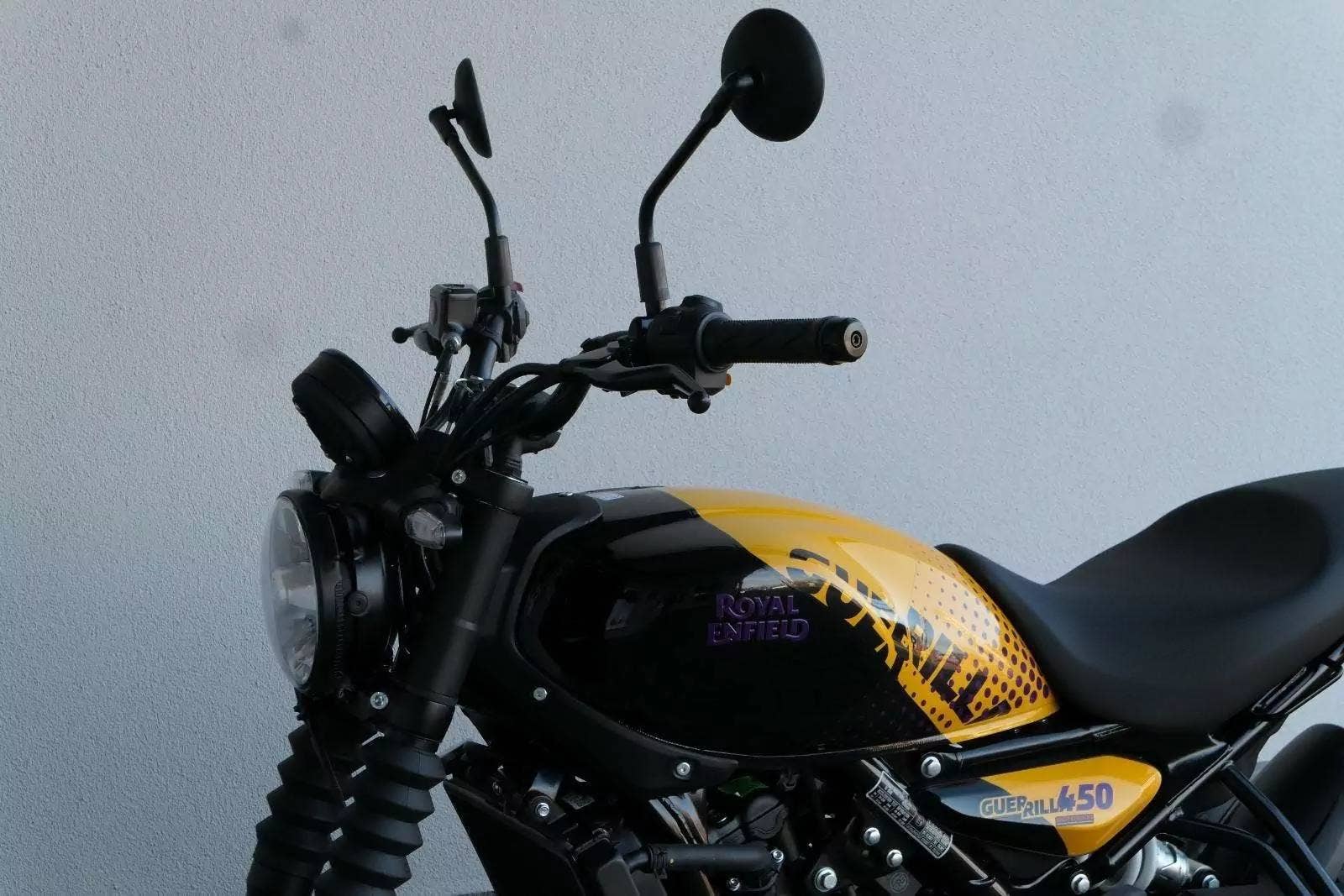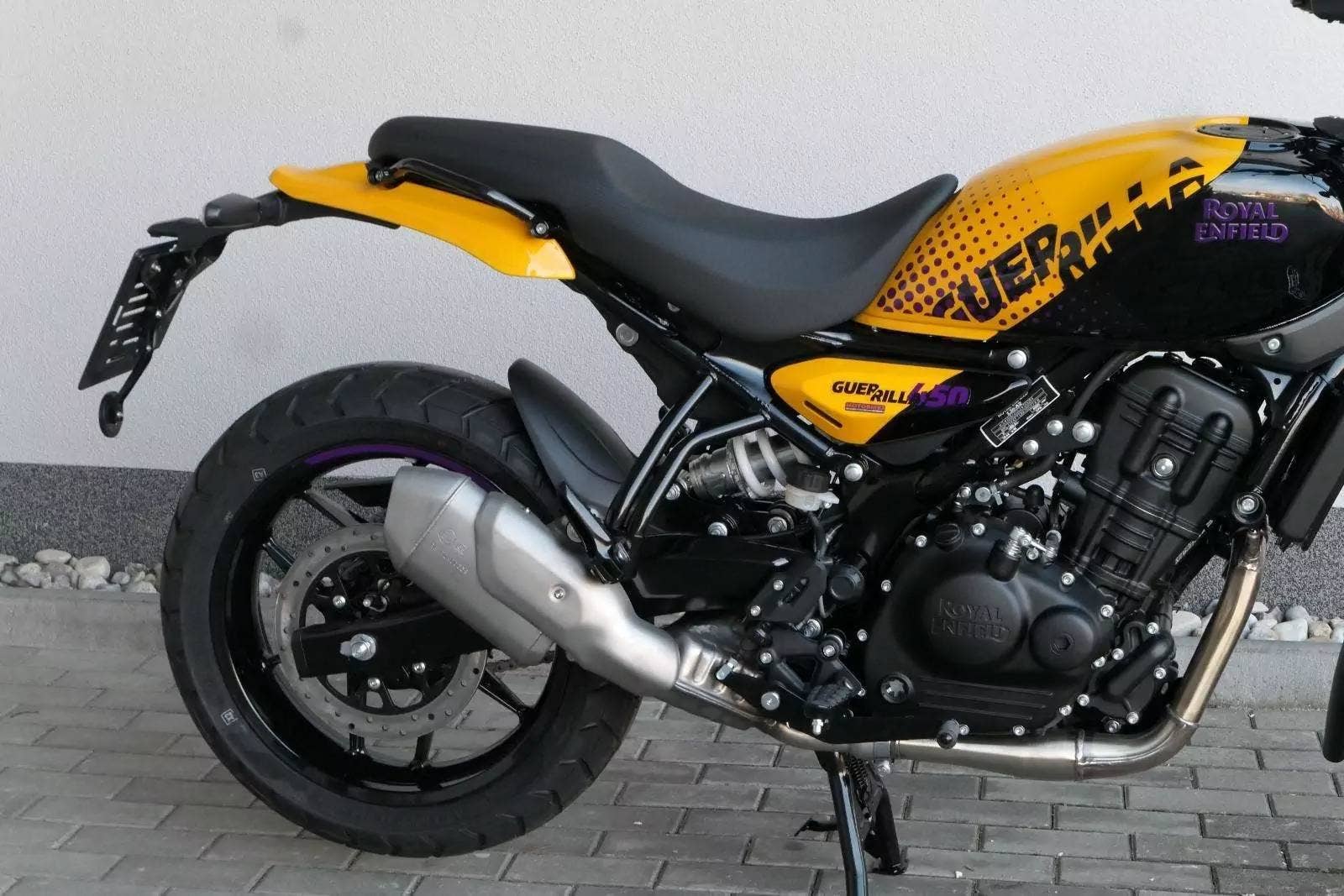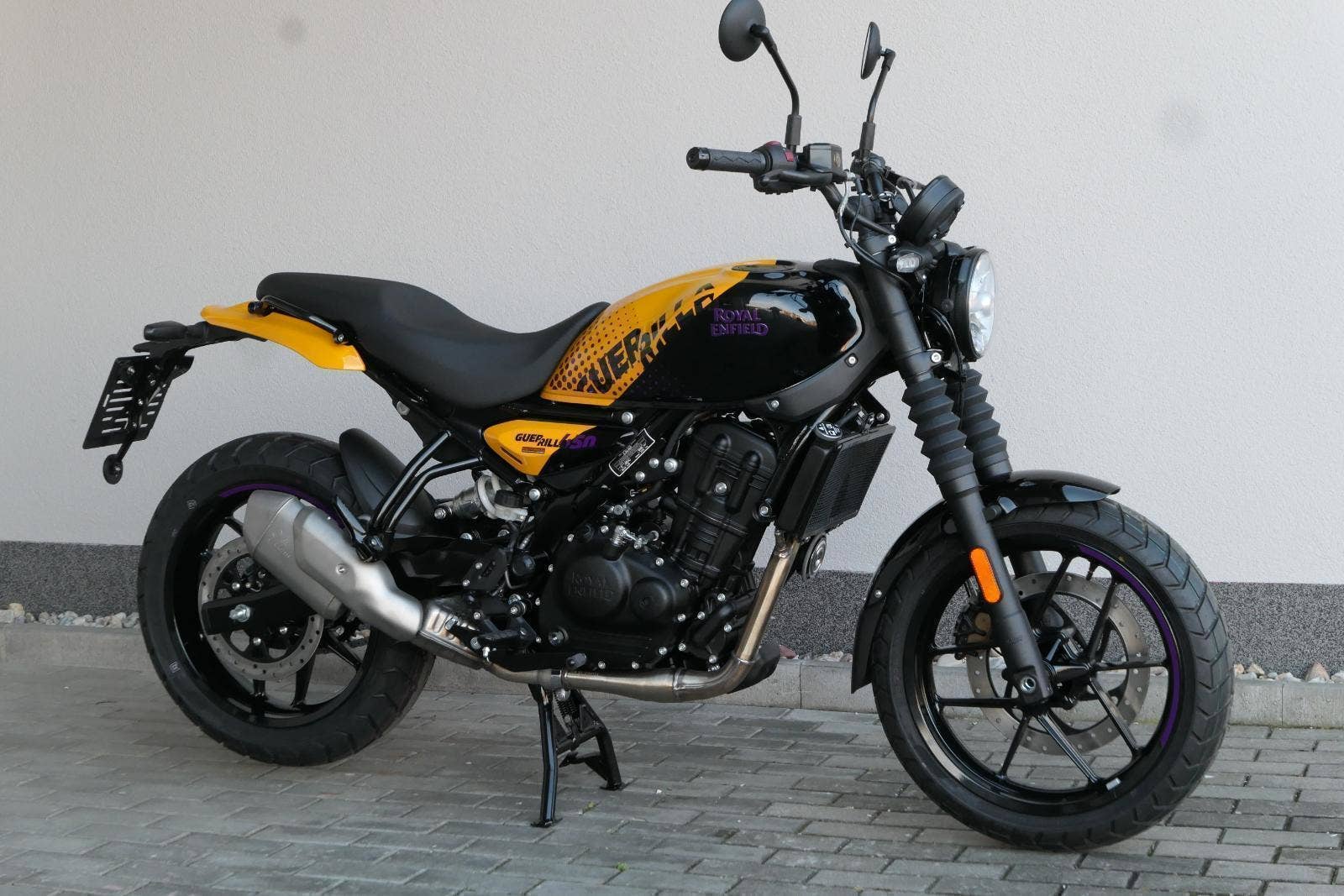 Z dosavadní modelové řady má Guerilla nejblíž Hunteru, působí ale moderněji a má i výrazně modernější techniku. Tak jako u aktuálního silnějšího Himalayanu 450 tvoří základ motorky trubkový páteřový rám, a v něm jako nosný prvek kapalinou chlazený jednoválec Sherpa o objemu 452 cm3. Relativně nový čtyřventil je mnohem výkonnější jednotkou než starší a menší vzduchem chlazené agregáty. Konkrétně nabídne rovných 40 koní v 8 000 otáčkách, a aby se to dobře pamatovalo tak i 40 Nm, které vrcholí v 5 500 otáčkách. Motor už má elektronický plyn a díky tomu i volitelné jízdní režimy – je ale poměrně jasné, který z dvojice „Eco“ a „Performance“ drtivá většina jezdců zvolí.