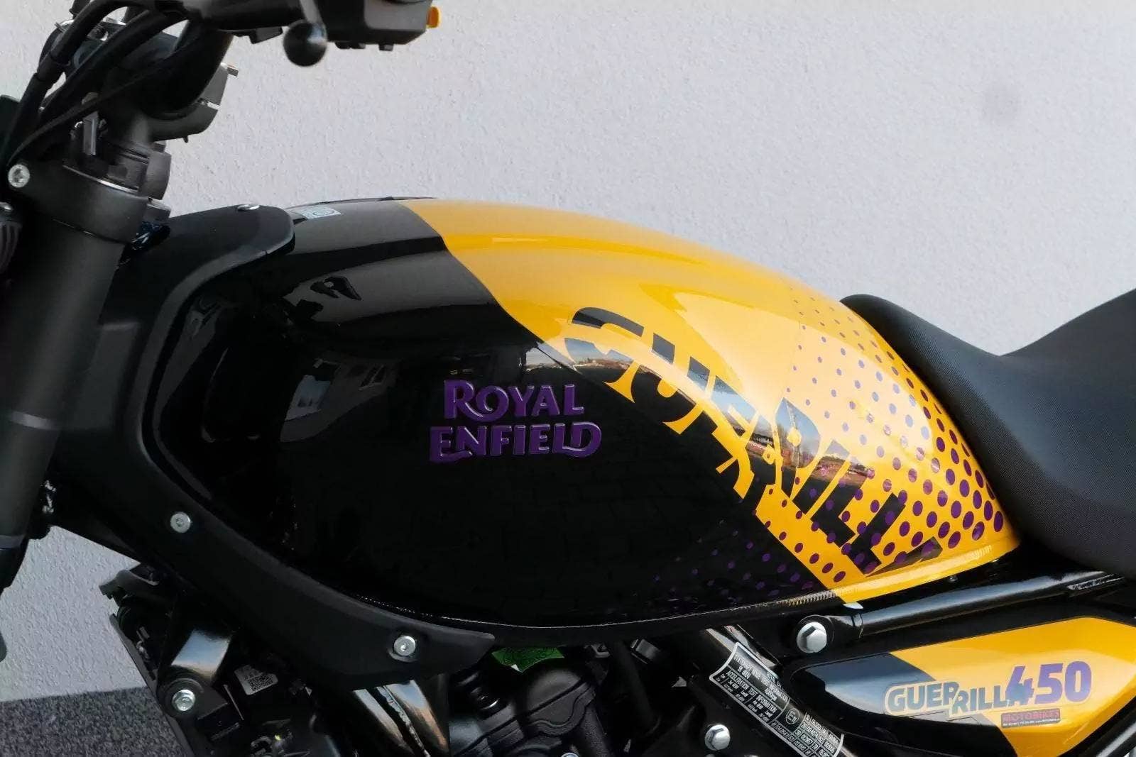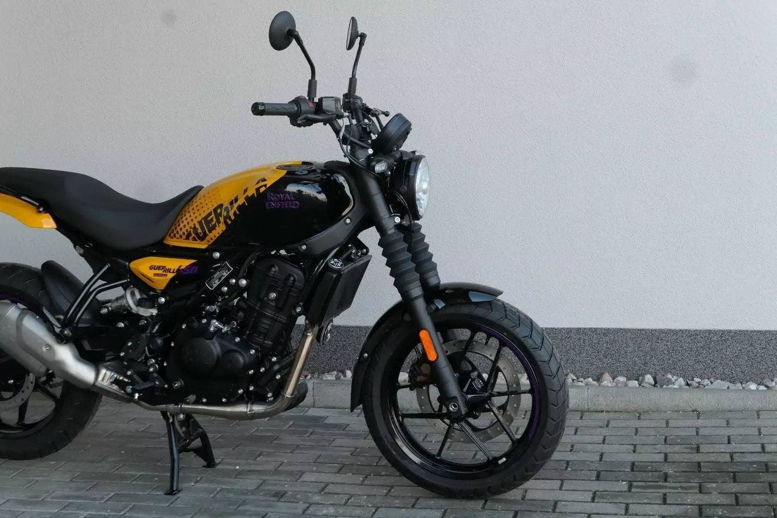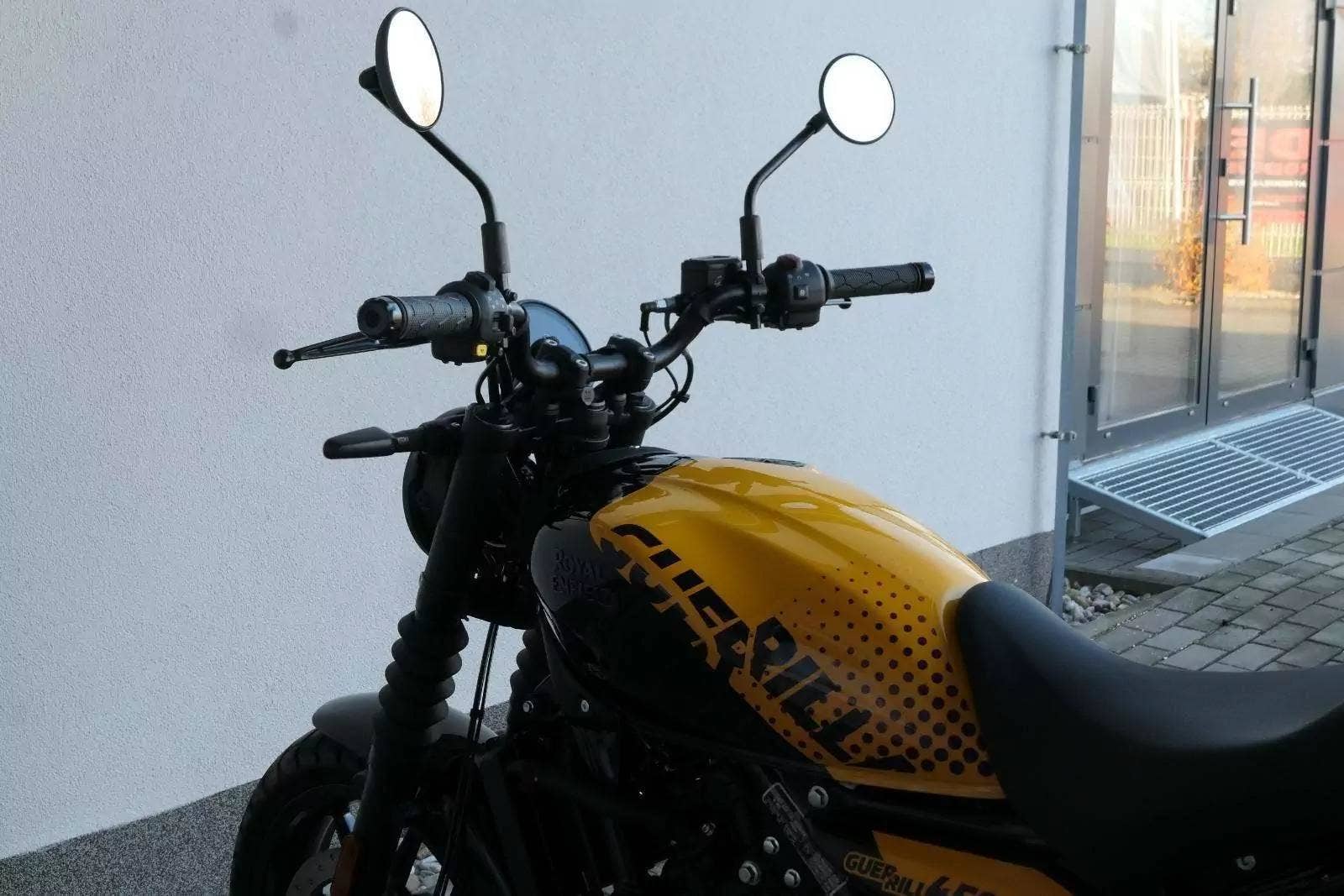 Z dosavadní modelové řady má Guerilla nejblíž Hunteru, působí ale moderněji a má i výrazně modernější techniku. Tak jako u aktuálního silnějšího Himalayanu 450 tvoří základ motorky trubkový páteřový rám, a v něm jako nosný prvek kapalinou chlazený jednoválec Sherpa o objemu 452 cm3. Relativně nový čtyřventil je mnohem výkonnější jednotkou než starší a menší vzduchem chlazené agregáty. Konkrétně nabídne rovných 40 koní v 8 000 otáčkách, a aby se to dobře pamatovalo tak i 40 Nm, které vrcholí v 5 500 otáčkách. Motor už má elektronický plyn a díky tomu i volitelné jízdní režimy – je ale poměrně jasné, který z dvojice „Eco“ a „Performance“ drtivá většina jezdců zvolí.