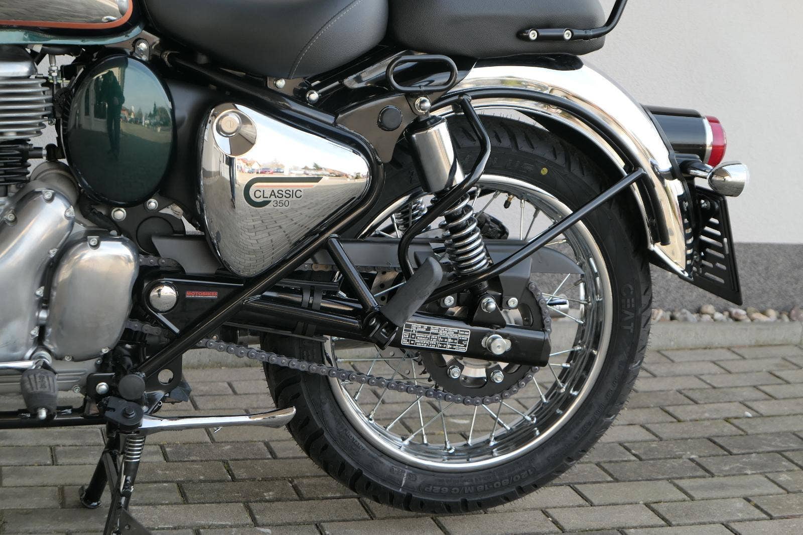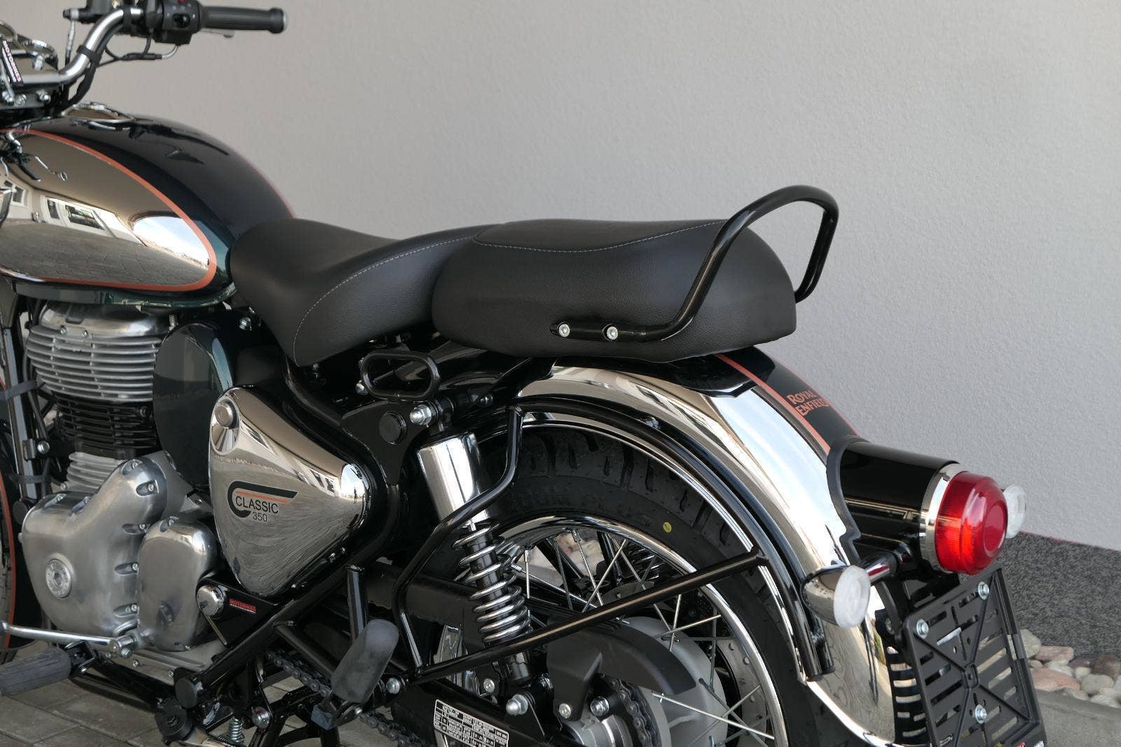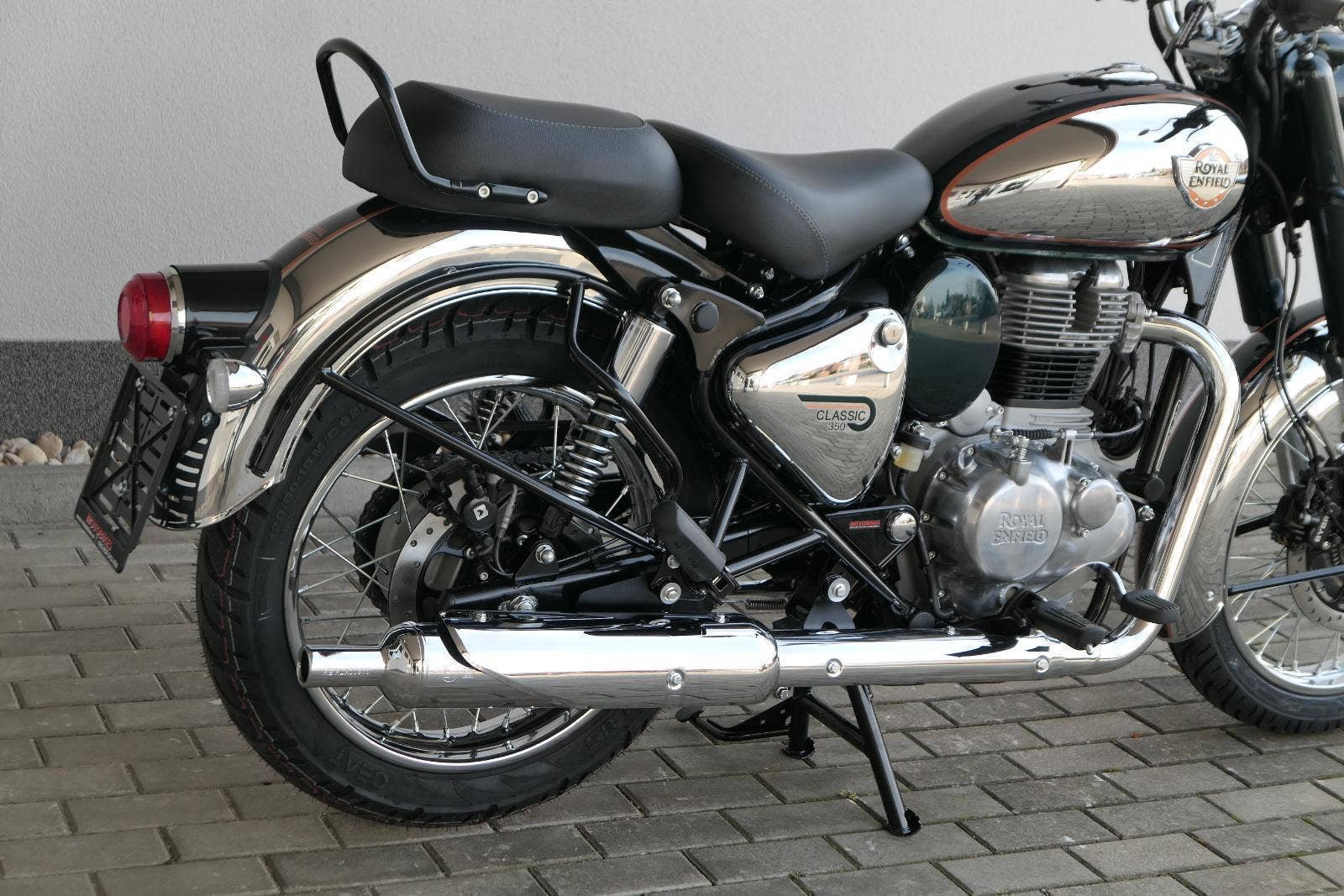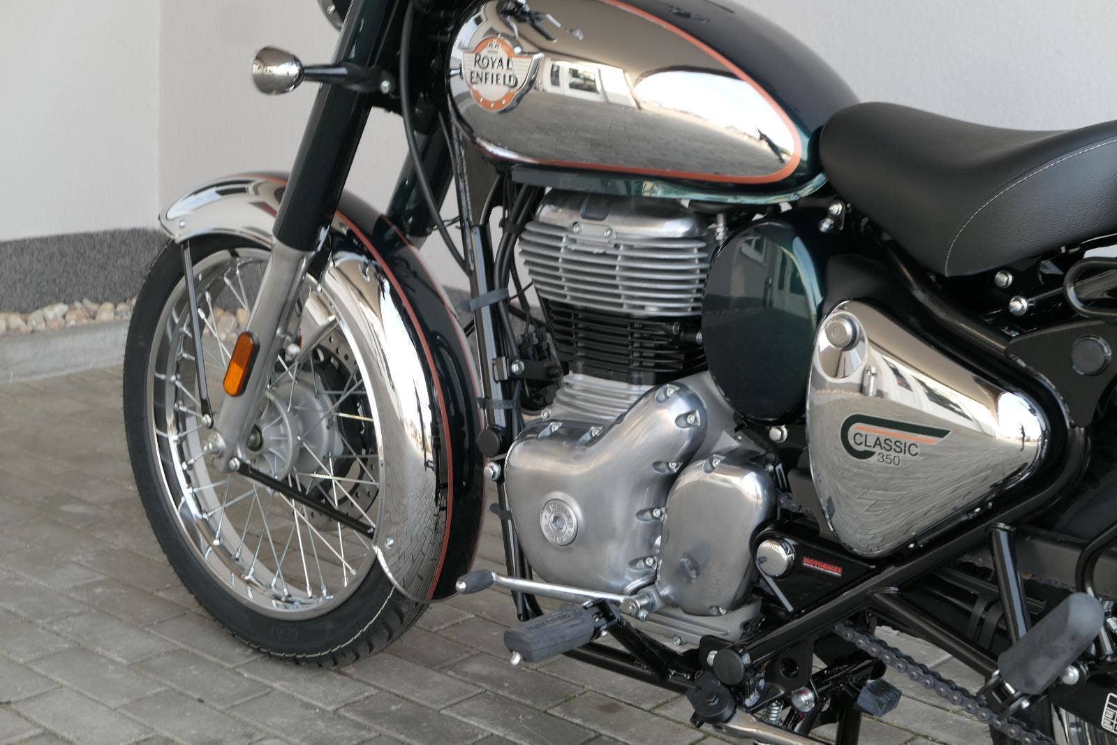 Ústředním prvkem nového Classic 350 je zcela nové srdce, které bije do jedinečného rytmu Royal Enfield. Ve spojení s novým rámem se dvěma spodními trubkami, který jezdí pevně a věrně, solidní a spolehlivou kvalitou konstrukce, je Classic vaším spojencem, ať už je váš cíl kdekoliv. Vzpřímená jízdní poloha dává jezdci Classicu vynikající vzhled na silnici, zatímco brzdy s větším průměrem zvyšují jeho brzdnou sílu. Ale silnější neznamená jen schopný a odolný, Classic je obdařen také pohodlím, s vylepšeným širším sedlem, které zpříjemňuje jízdu.