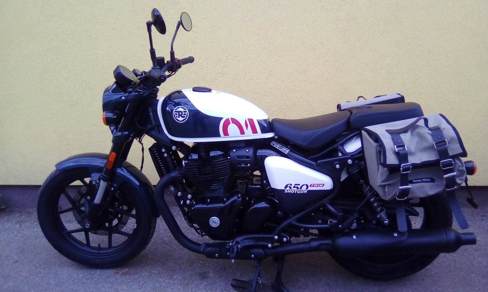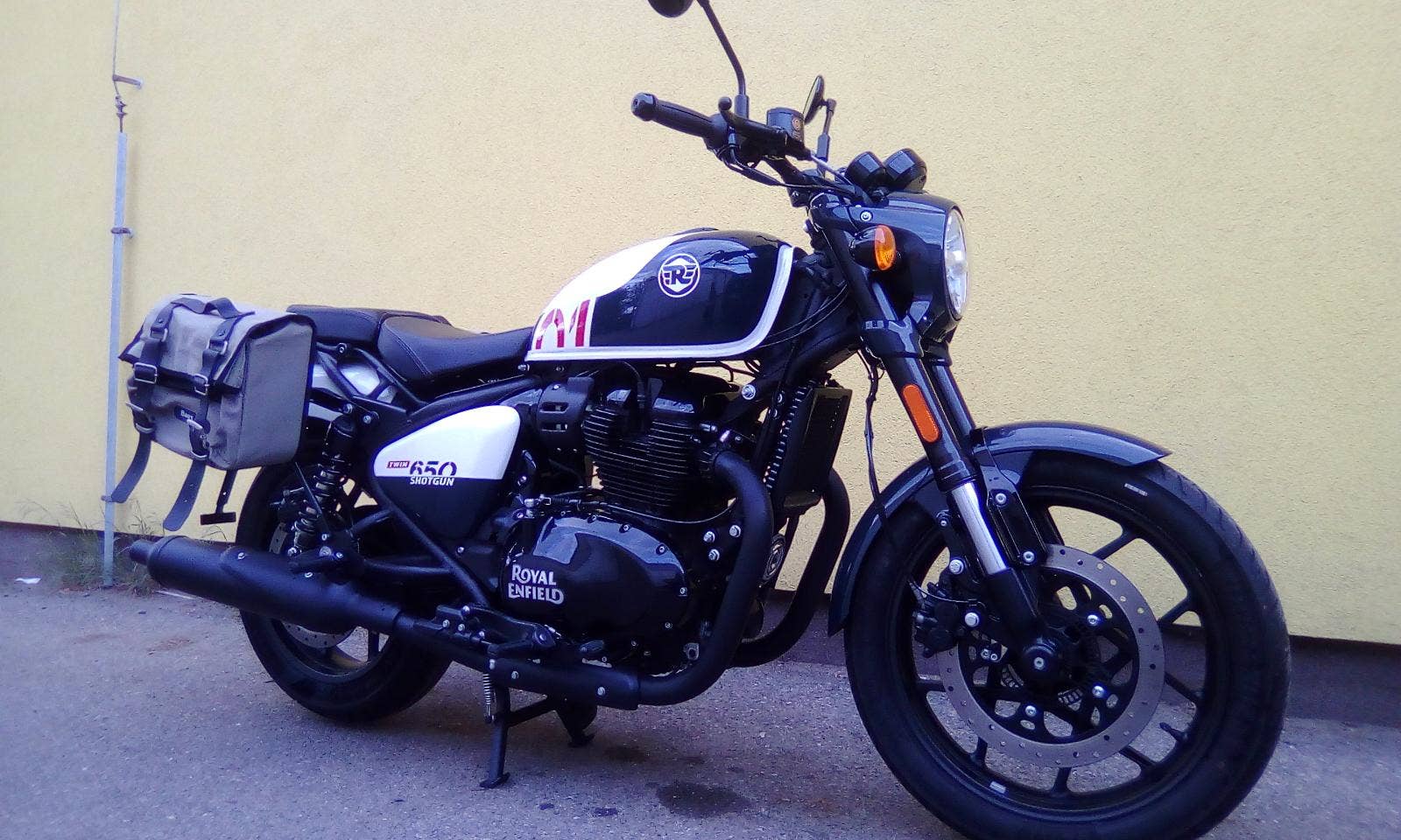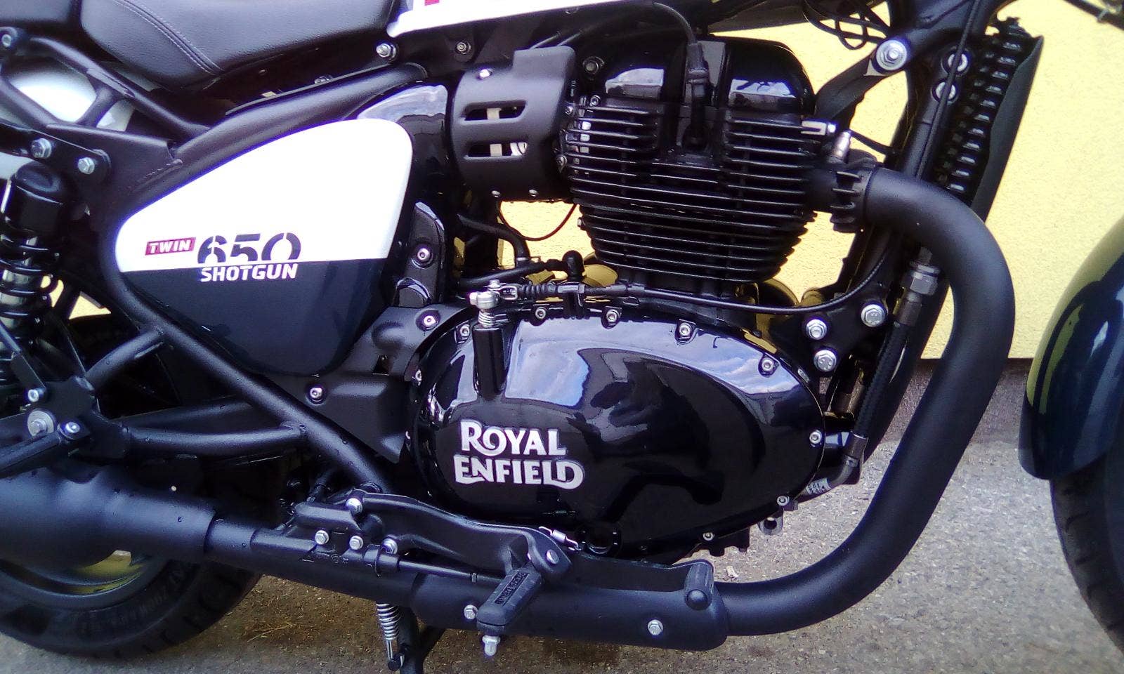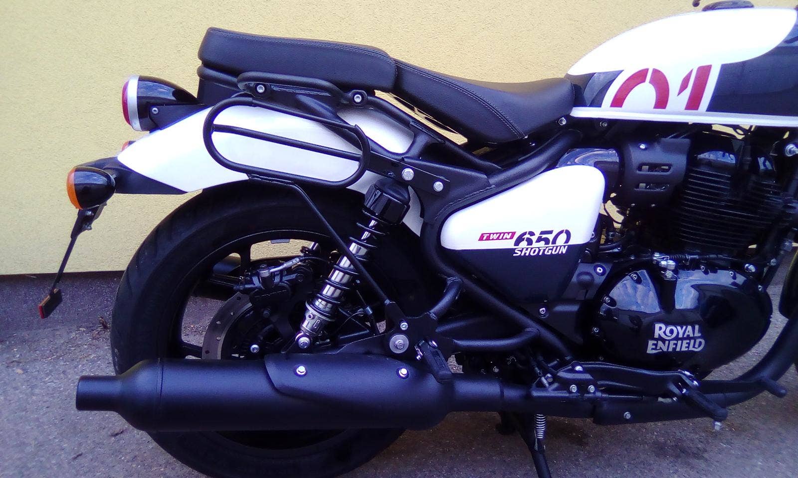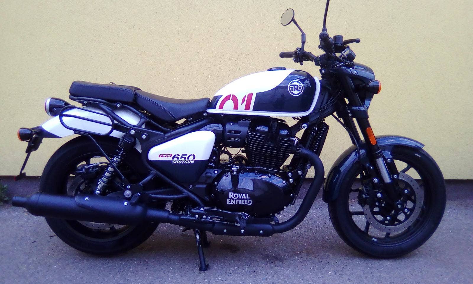 Royal Enfield 650 Shotgun ve stavu nového motocyklu, navíc asi v nejhezčí barevné kombinaci.