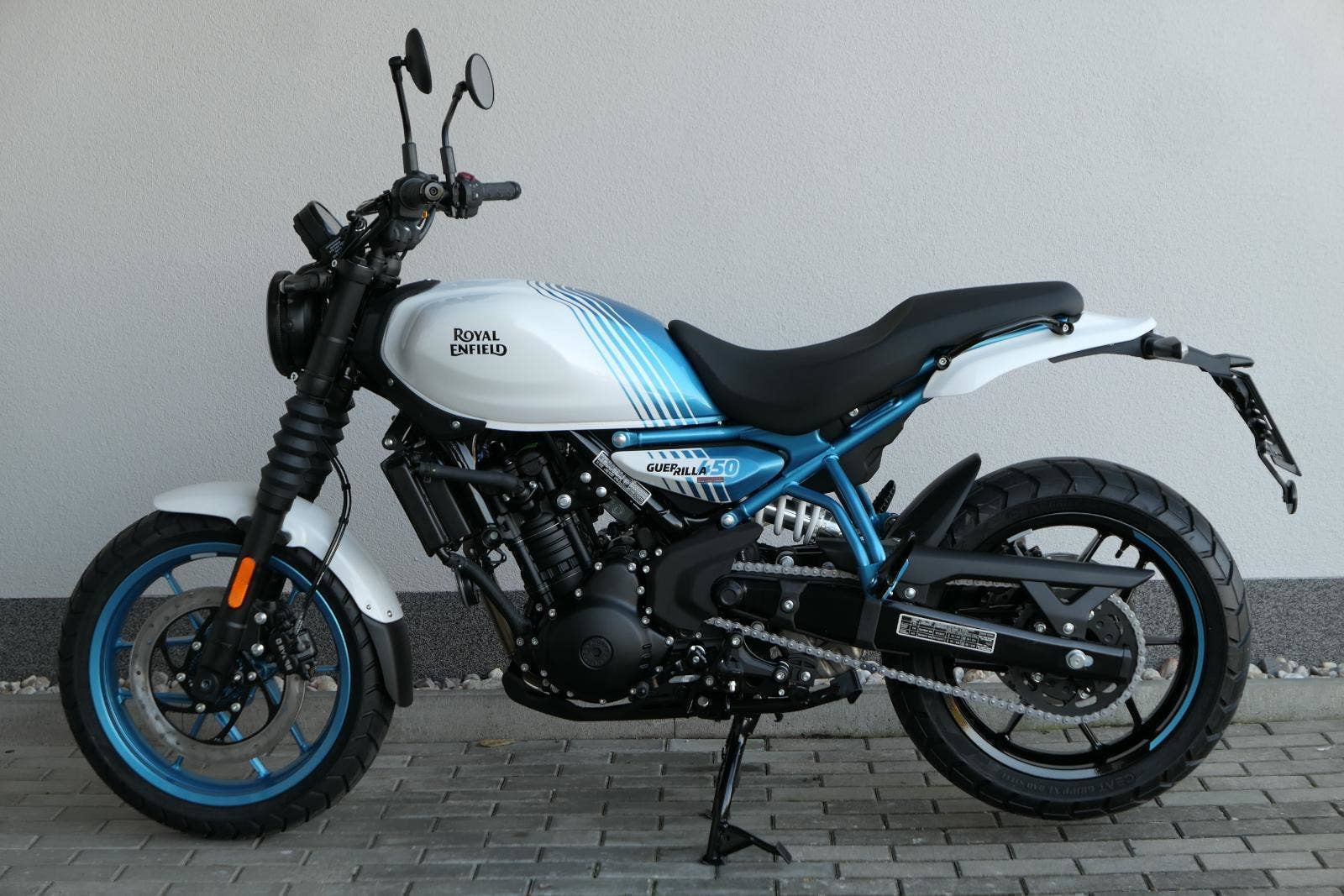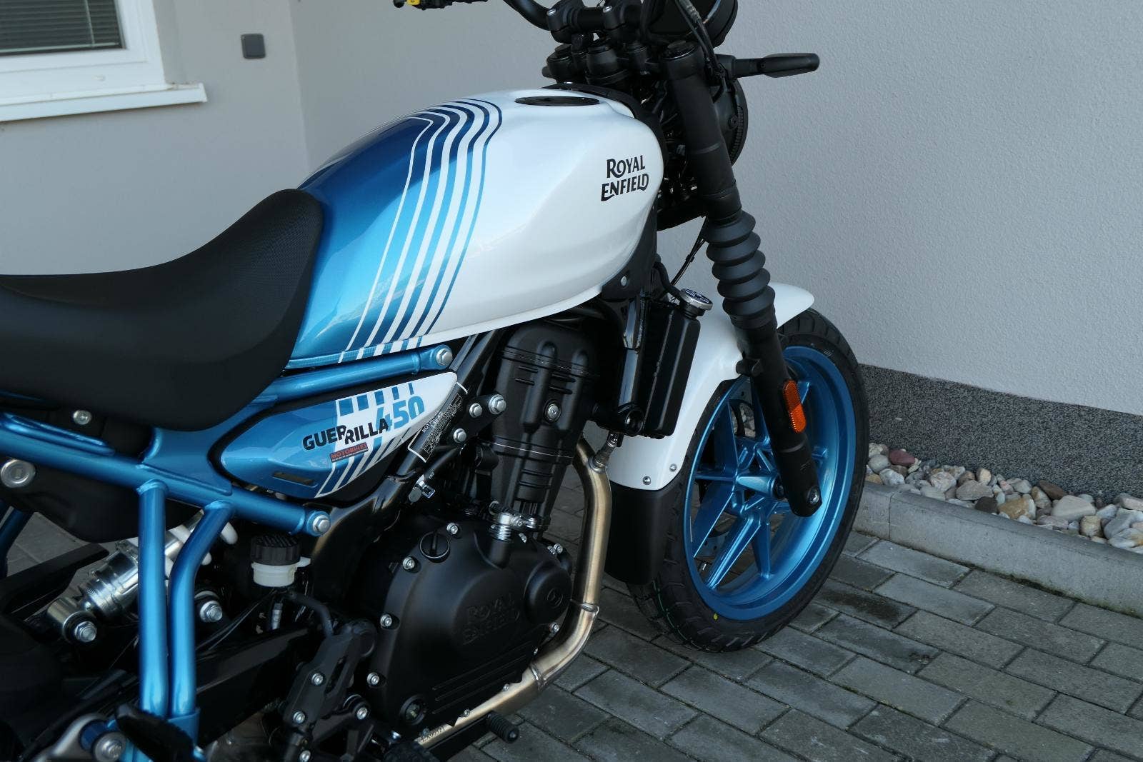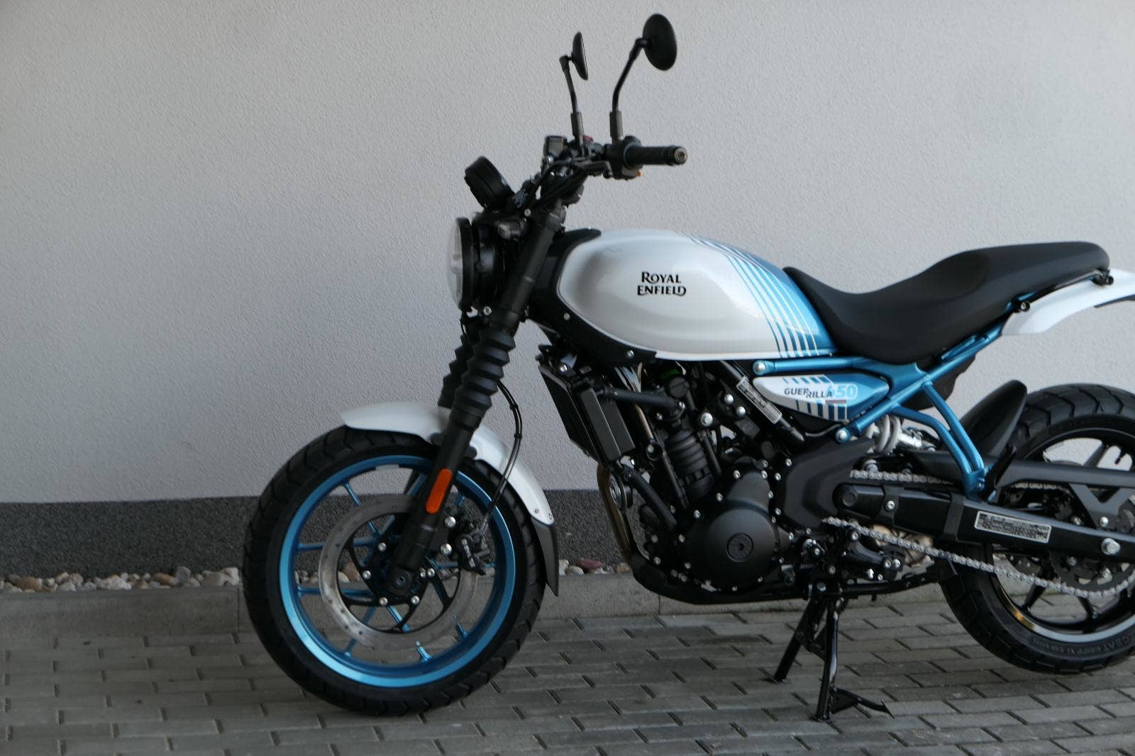 Royal Enfield Guerrilla 450 sdílí motor a technický základ s cestovním endurem Himalayan 450, stojí ale na malých silničních kolech a místo cestování míří na každodenní dojíždění, i na radovánky okolo komína.