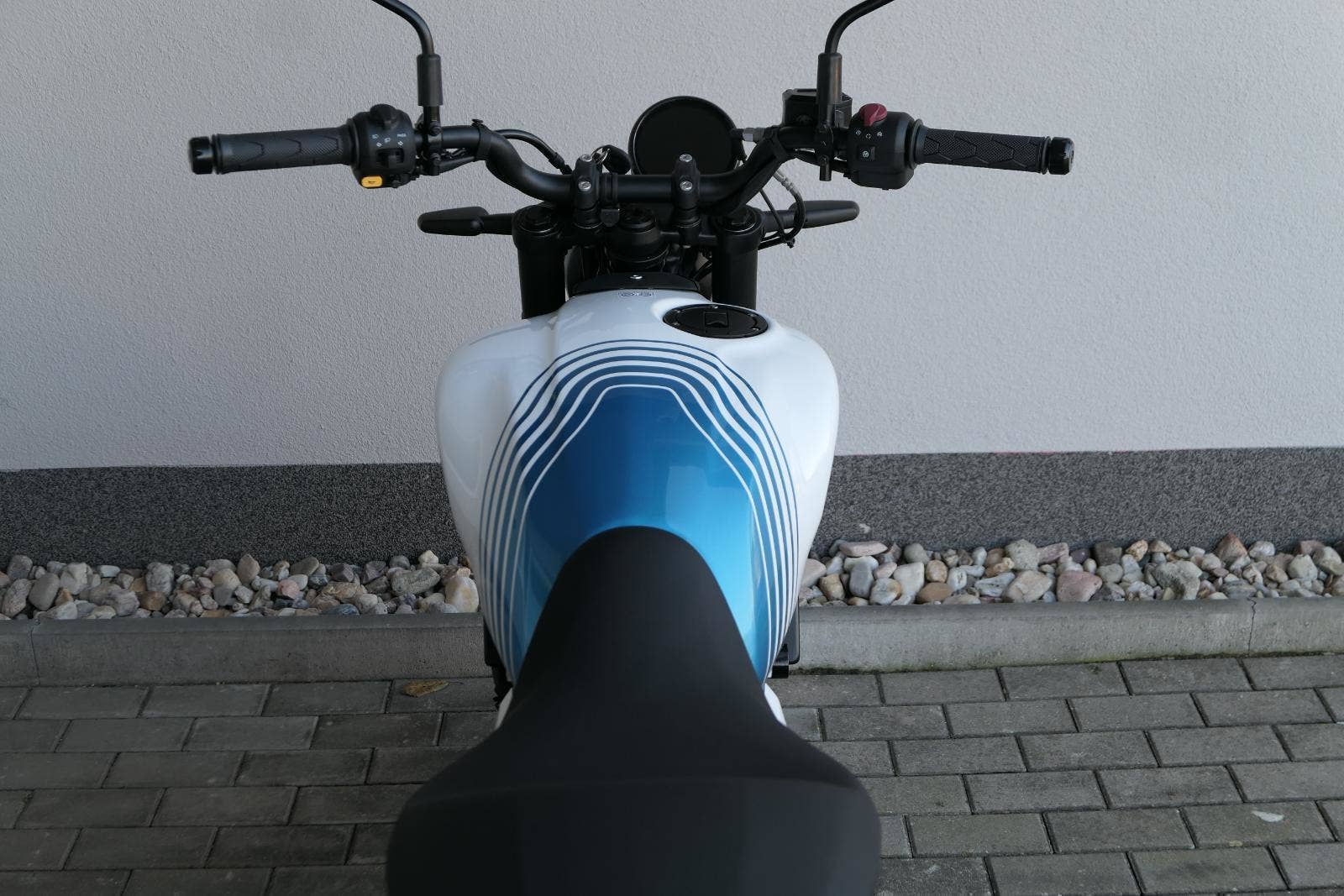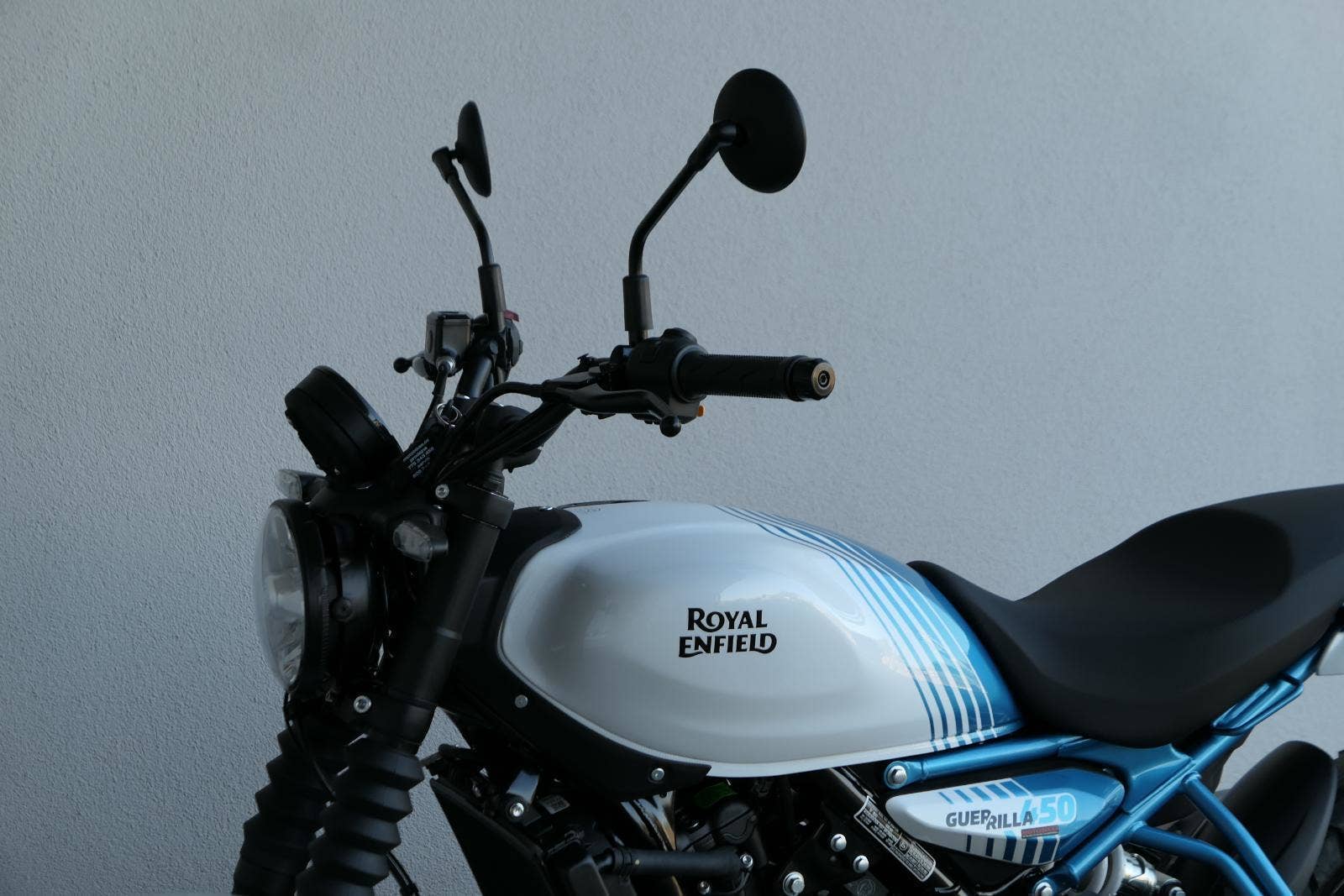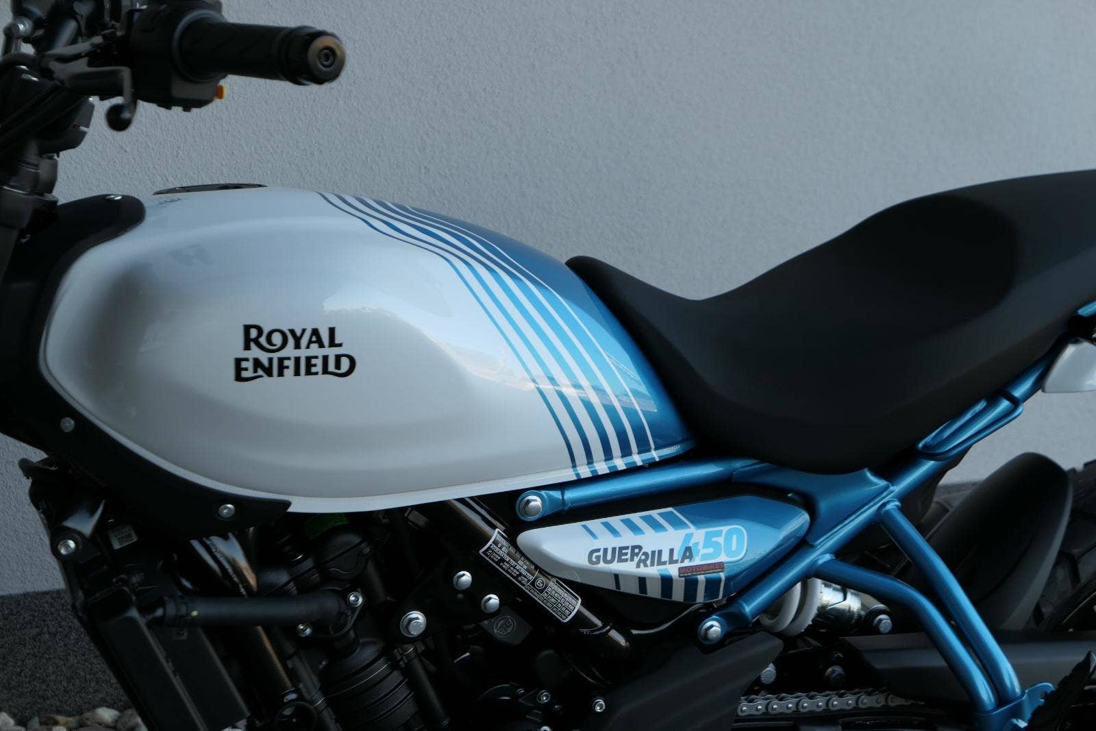 Celkově má Guerilla poměrně moderní tvary, Royal ale zdůrazňuje, že zde nejsou žádné nadbytečné plasty a serepetičky, a že jde v principu o jednoduchou a zábavnou motorku – což koneckonců spojuje všechny modely Royal Enfieldu. Opět je nutné pochválit výběr barev, který je vychytaný přesně tak, jak jsme u Royalu zvyklí. Z celkem pěti zbarvení je jenom jedno nudné, a sice jednolitá stříbrná Smoke Silver. Zbytek, tedy Brava Blue, Yellow Ribbon, Playa Black a Gold Dip zajímavě kombinují barevnou grafiku a ve třech případech dostanete i barevné ráfky.