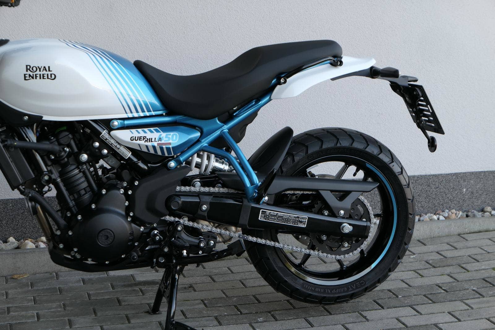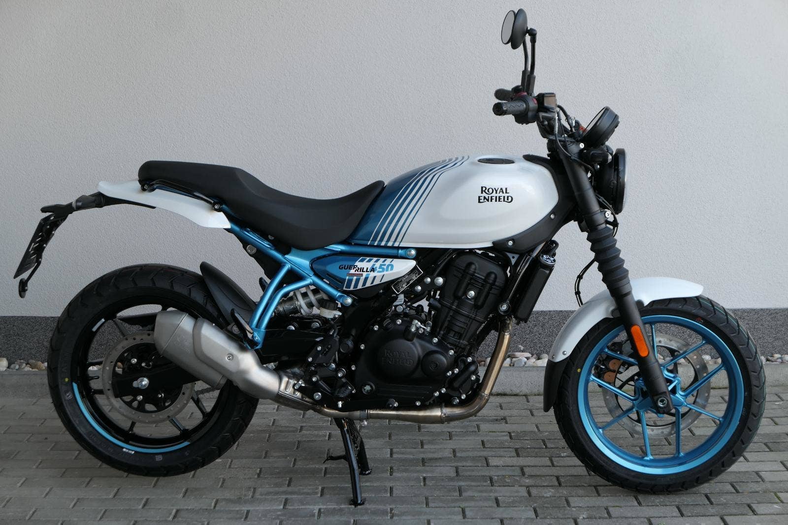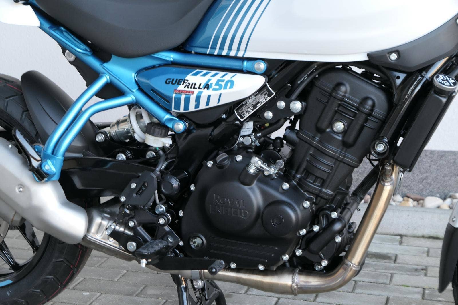 Z dosavadní modelové řady má Guerilla nejblíž Hunteru, působí ale moderněji a má i výrazně modernější techniku. Tak jako u aktuálního silnějšího Himalayanu 450 tvoří základ motorky trubkový páteřový rám, a v něm jako nosný prvek kapalinou chlazený jednoválec Sherpa o objemu 452 cm3. Relativně nový čtyřventil je mnohem výkonnější jednotkou než starší a menší vzduchem chlazené agregáty. Konkrétně nabídne rovných 40 koní v 8 000 otáčkách, a aby se to dobře pamatovalo tak i 40 Nm, které vrcholí v 5 500 otáčkách. Motor už má elektronický plyn a díky tomu i volitelné jízdní režimy – je ale poměrně jasné, který z dvojice „Eco“ a „Performance“ drtivá většina jezdců zvolí.