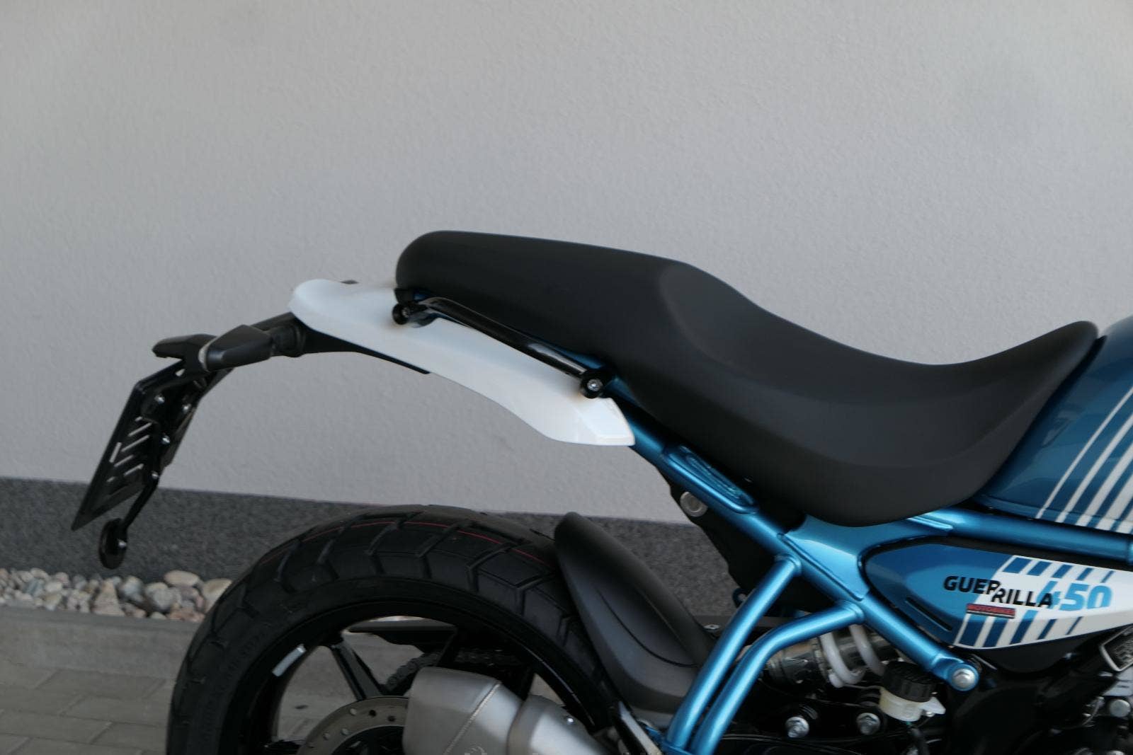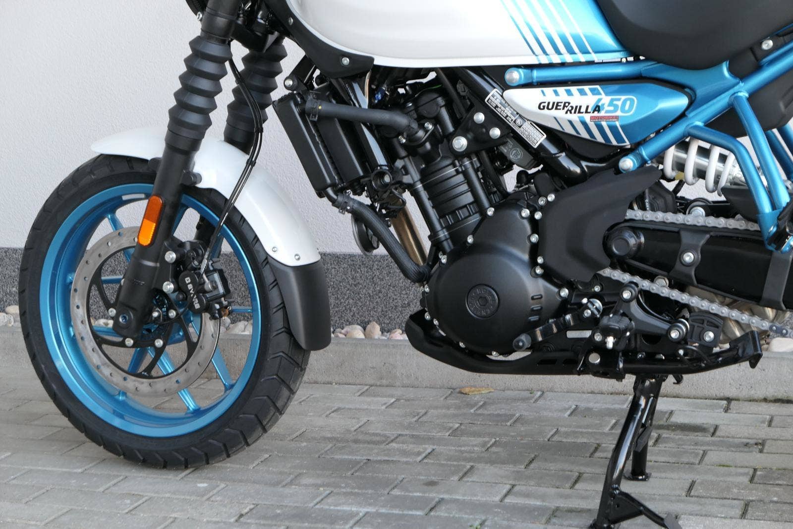 Kola jsou sedmnáctipalcová a Guerilla se chlubí přístupnou výškou sedla 780 milimetrů, stejně jako příjemnou pohotovostní hmotností 184 kilogramů. S ohledem na výkon a hmotnost jsou celkem dostačující i brzdy – vpředu jeden kotouč 310 milimetrů s dvoupístkovým brzdičem, vzadu 270 milimetrů s jednopístem. Do nádrže se vejde jenom skromných 11 litrů, na druhou stranu výrobce uvádí i skromnou tabulkovou spotřebu 3,39 litru na 100 kilometrů.