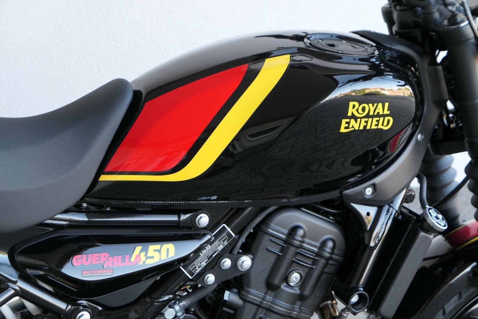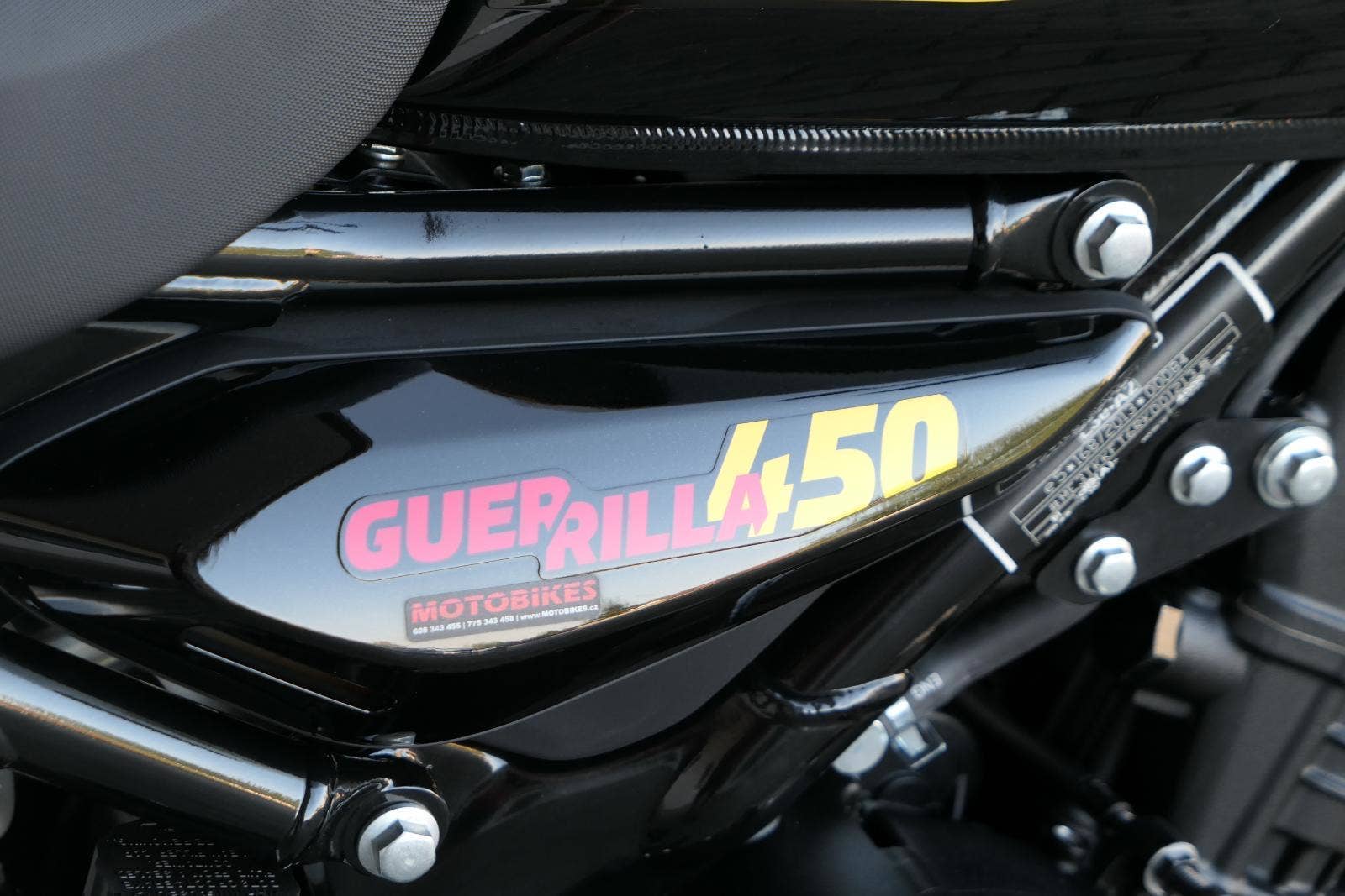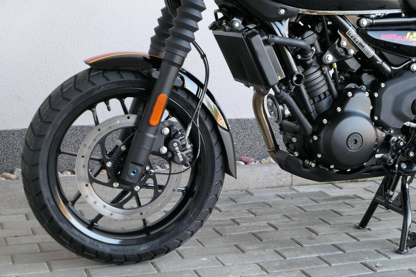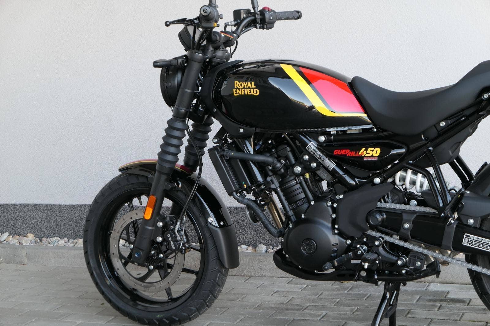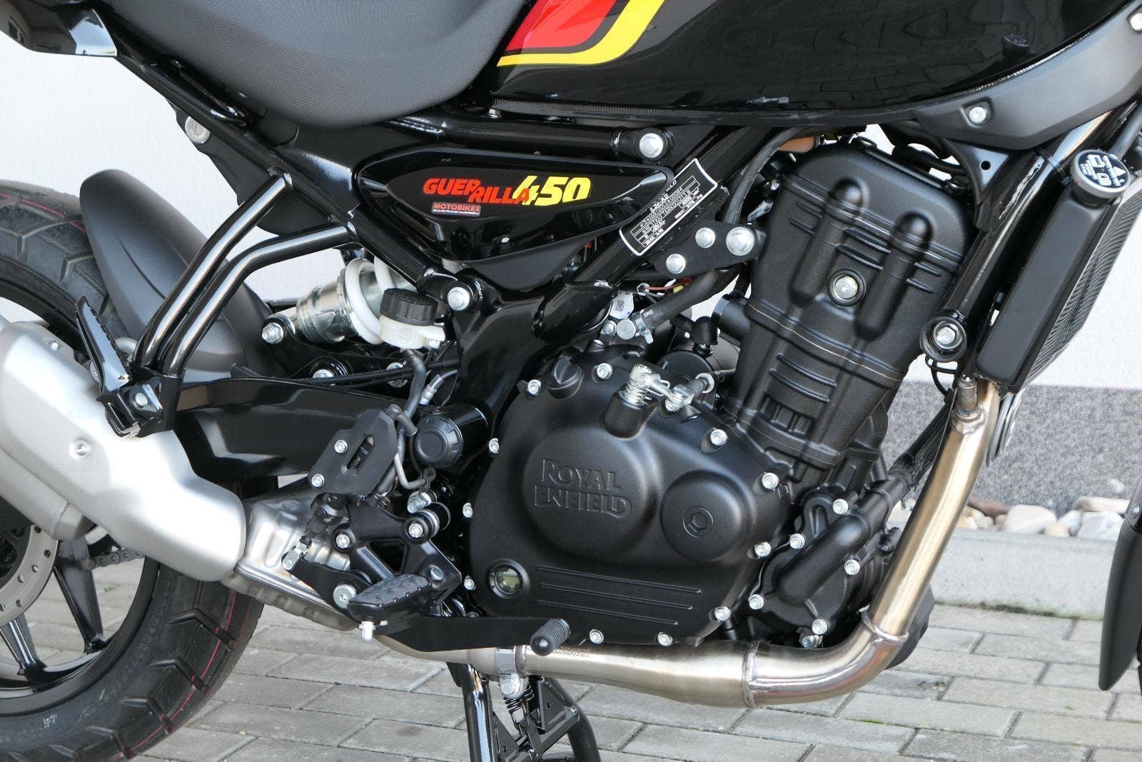 Z dosavadní modelové řady má Guerilla nejblíž Hunteru, působí ale moderněji a má i výrazně modernější techniku. Tak jako u aktuálního silnějšího Himalayanu 450 tvoří základ motorky trubkový páteřový rám, a v něm jako nosný prvek kapalinou chlazený jednoválec Sherpa o objemu 452 cm3. Relativně nový čtyřventil je mnohem výkonnější jednotkou než starší a menší vzduchem chlazené agregáty. Konkrétně nabídne rovných 40 koní v 8 000 otáčkách, a aby se to dobře pamatovalo tak i 40 Nm, které vrcholí v 5 500 otáčkách. Motor už má elektronický plyn a díky tomu i volitelné jízdní režimy – je ale poměrně jasné, který z dvojice „Eco“ a „Performance“ drtivá většina jezdců zvolí.