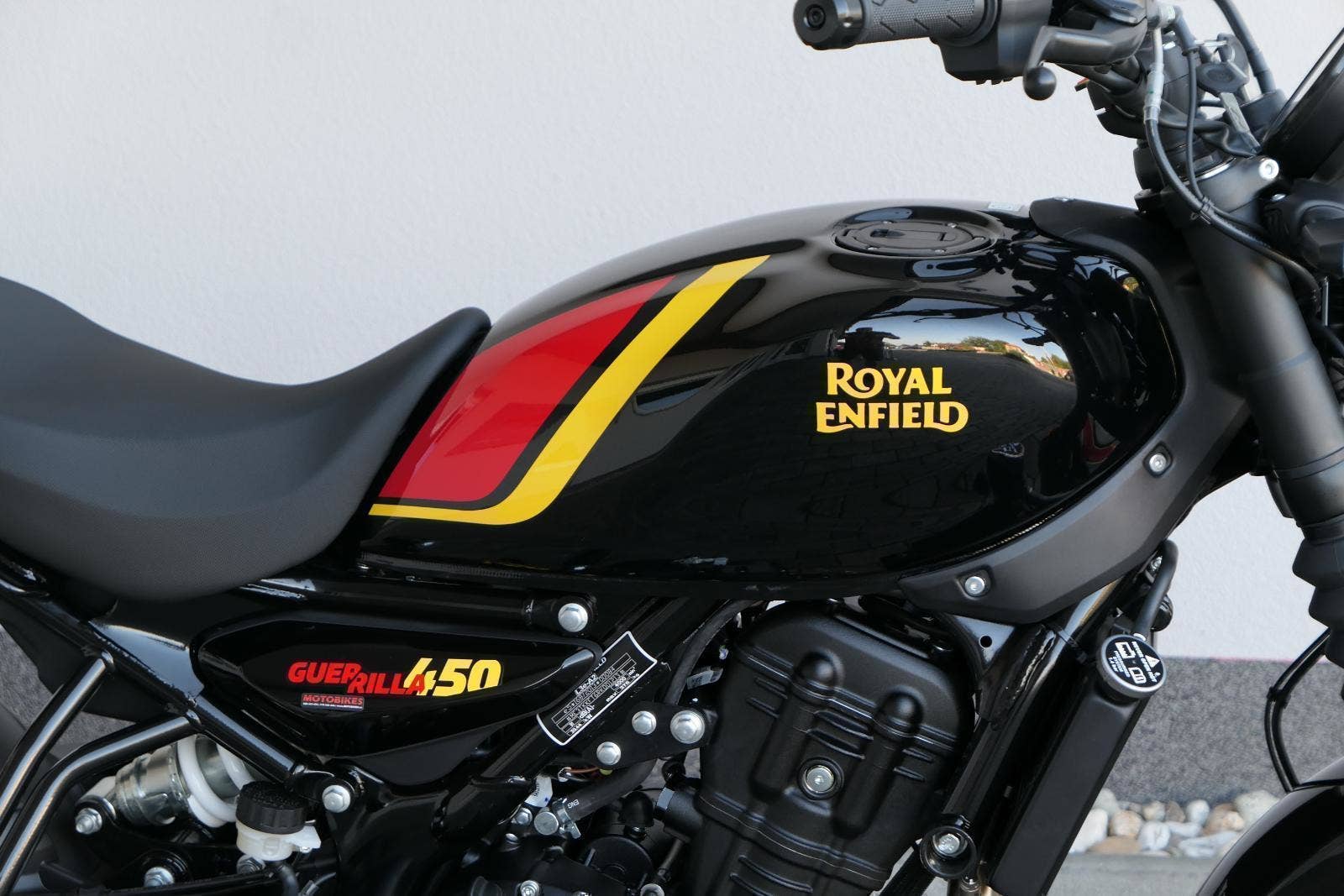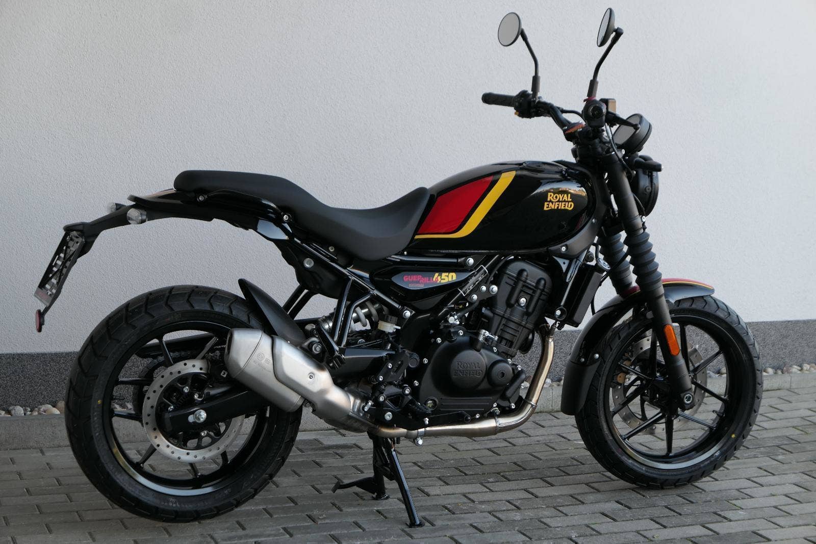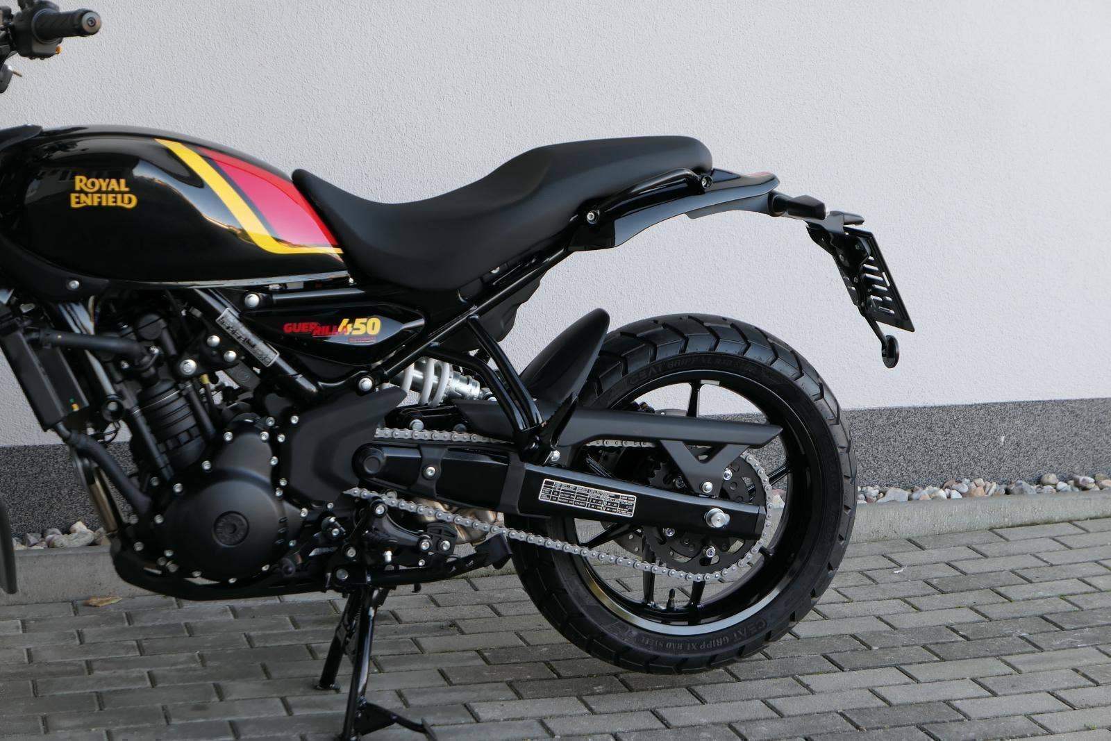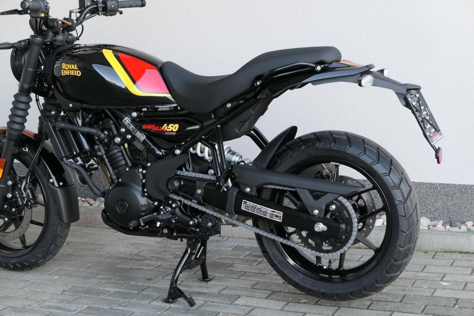 Z dosavadní modelové řady má Guerilla nejblíž Hunteru, působí ale moderněji a má i výrazně modernější techniku. Tak jako u aktuálního silnějšího Himalayanu 450 tvoří základ motorky trubkový páteřový rám, a v něm jako nosný prvek kapalinou chlazený jednoválec Sherpa o objemu 452 cm3. Relativně nový čtyřventil je mnohem výkonnější jednotkou než starší a menší vzduchem chlazené agregáty. Konkrétně nabídne rovných 40 koní v 8 000 otáčkách, a aby se to dobře pamatovalo tak i 40 Nm, které vrcholí v 5 500 otáčkách. Motor už má elektronický plyn a díky tomu i volitelné jízdní režimy – je ale poměrně jasné, který z dvojice „Eco“ a „Performance“ drtivá většina jezdců zvolí.