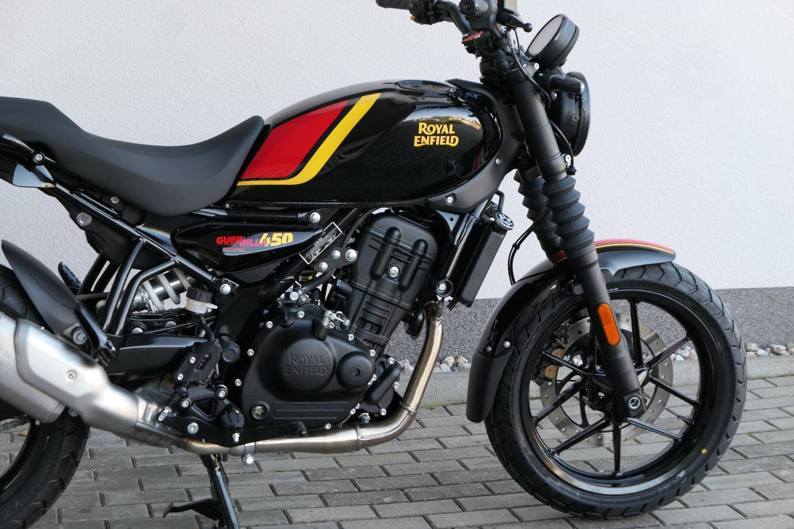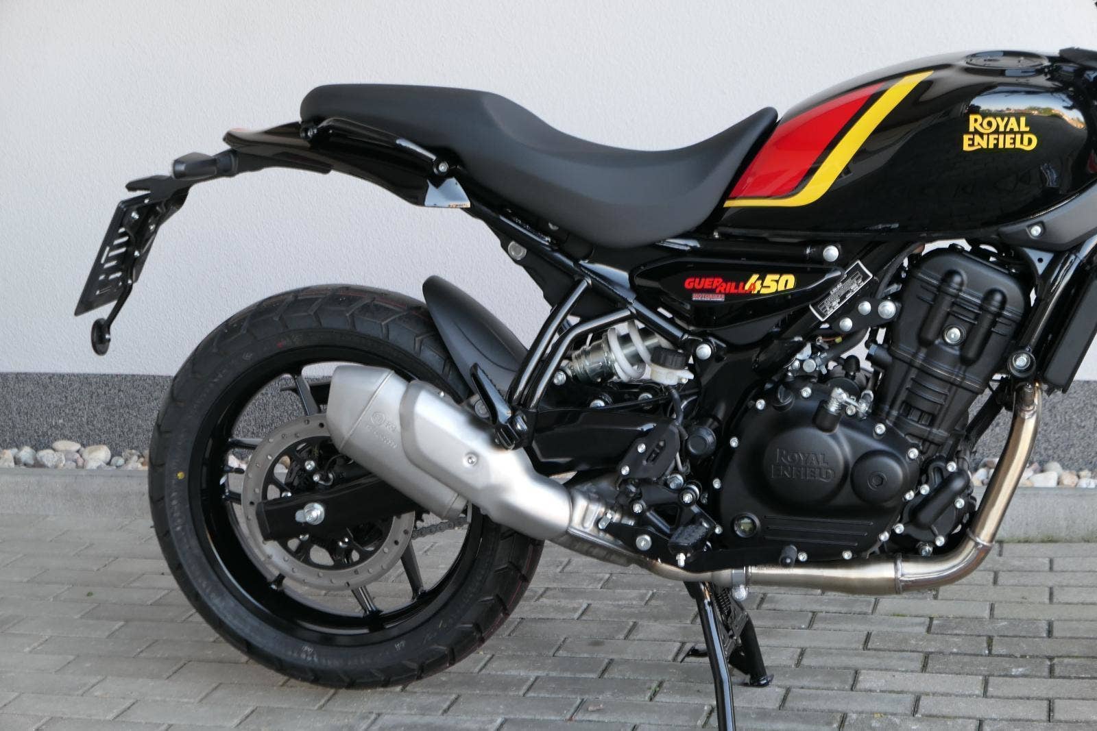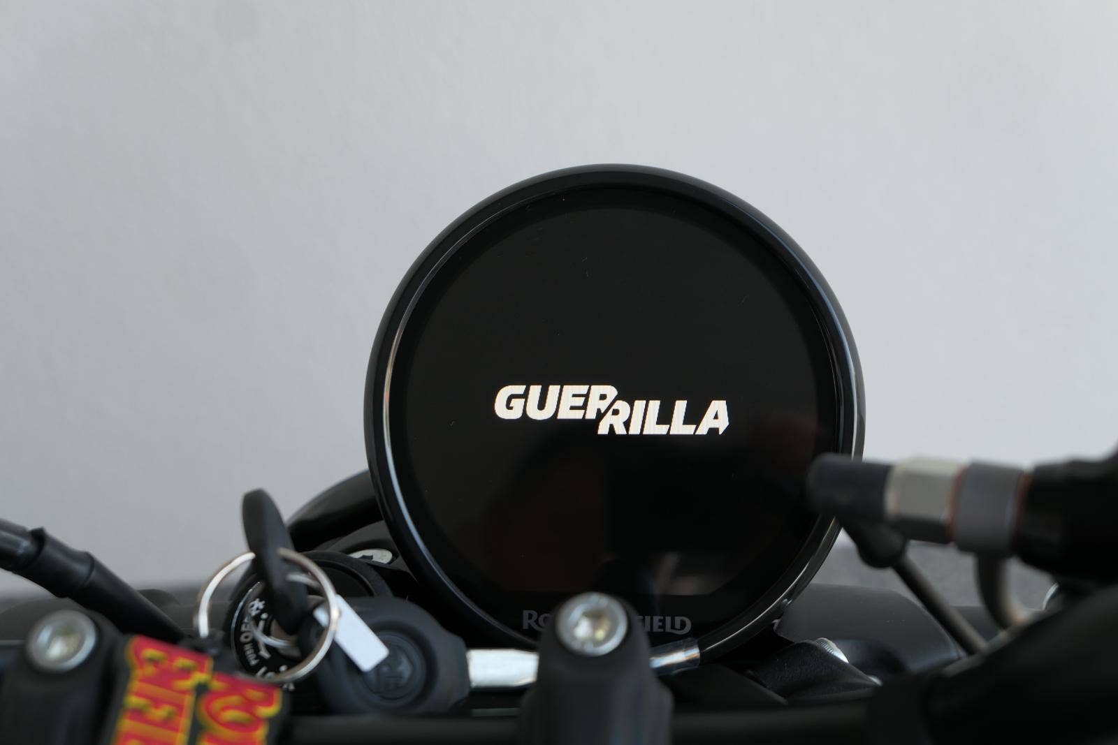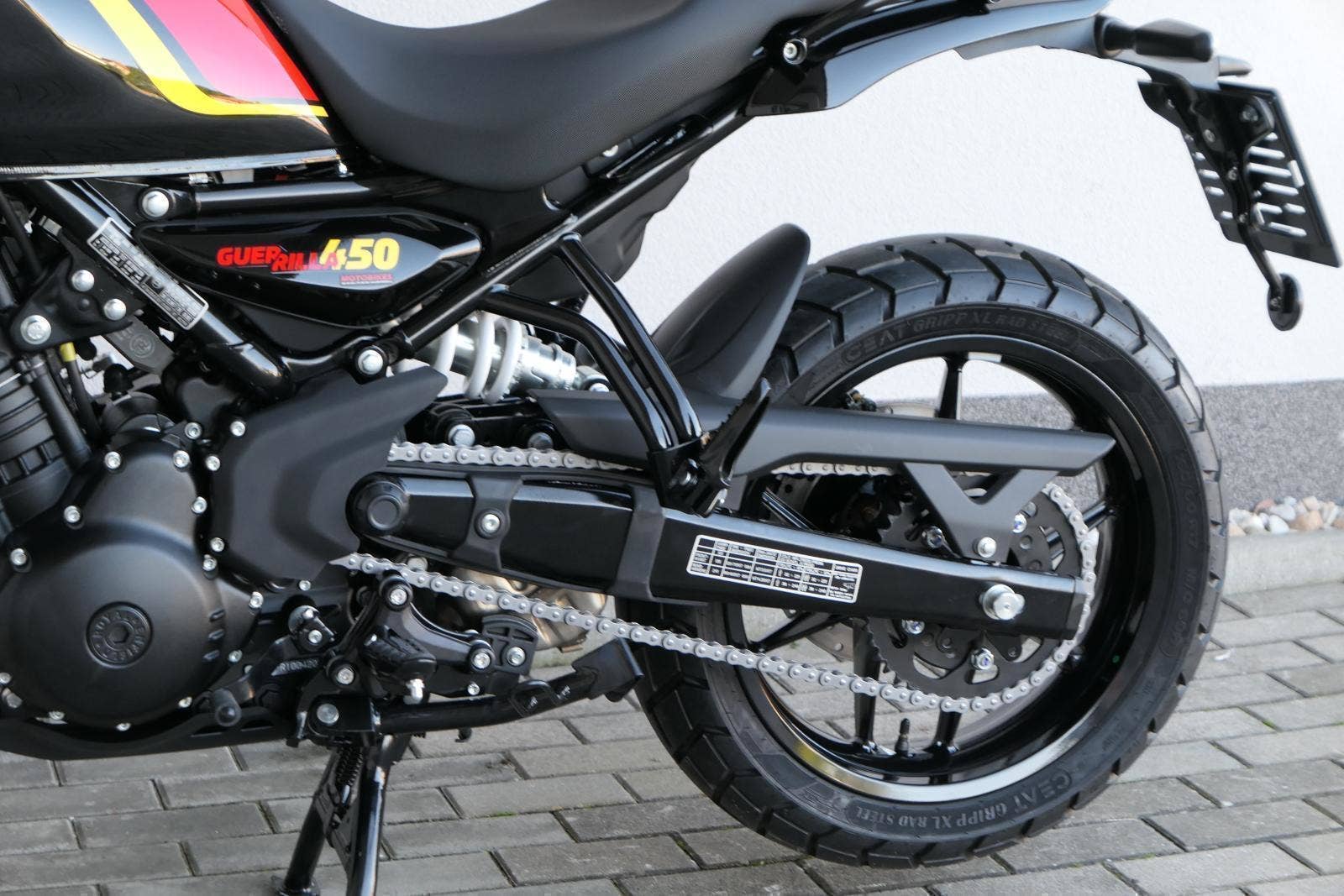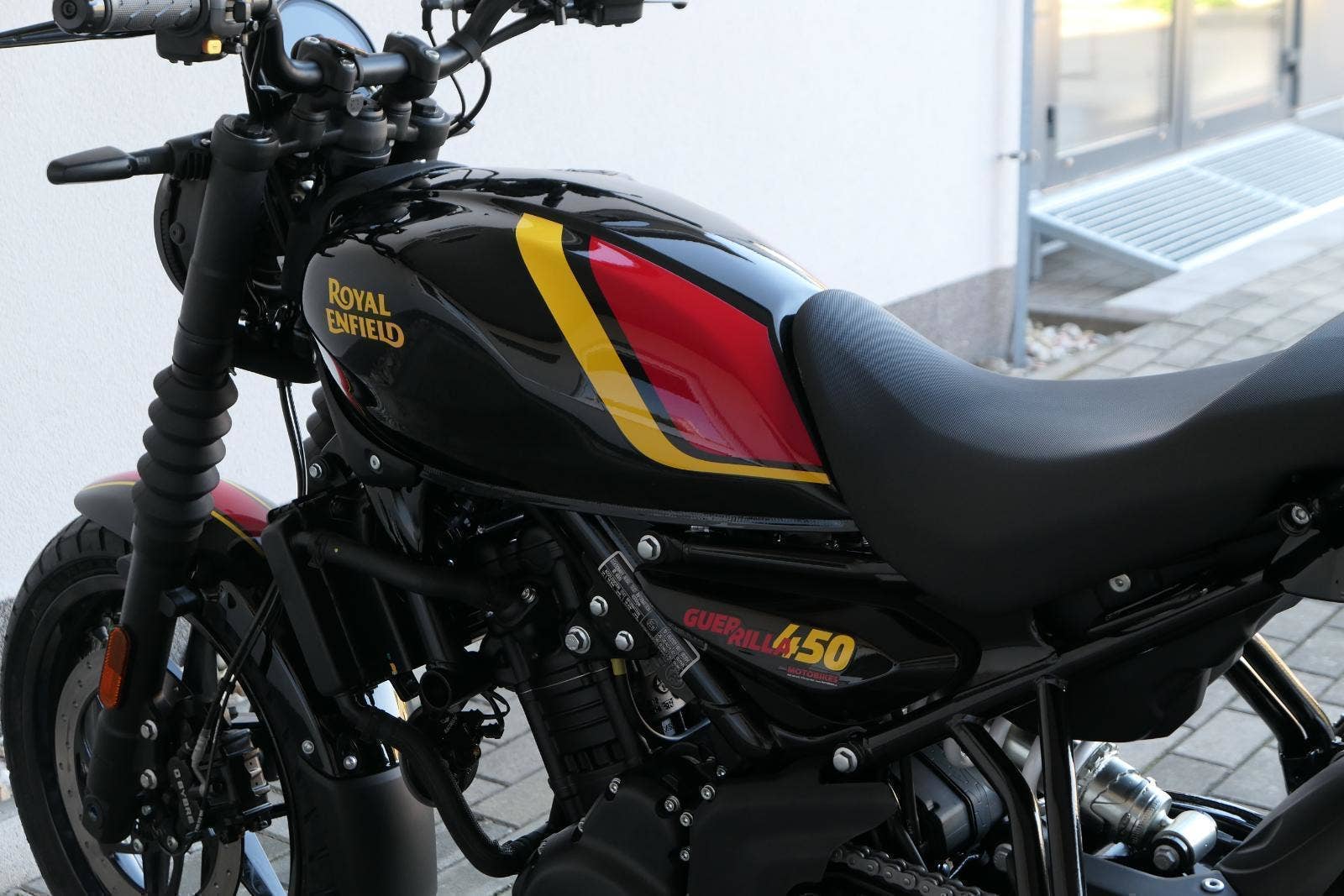 Z dosavadní modelové řady má Guerilla nejblíž Hunteru, působí ale moderněji a má i výrazně modernější techniku. Tak jako u aktuálního silnějšího Himalayanu 450 tvoří základ motorky trubkový páteřový rám, a v něm jako nosný prvek kapalinou chlazený jednoválec Sherpa o objemu 452 cm3. Relativně nový čtyřventil je mnohem výkonnější jednotkou než starší a menší vzduchem chlazené agregáty. Konkrétně nabídne rovných 40 koní v 8 000 otáčkách, a aby se to dobře pamatovalo tak i 40 Nm, které vrcholí v 5 500 otáčkách. Motor už má elektronický plyn a díky tomu i volitelné jízdní režimy – je ale poměrně jasné, který z dvojice „Eco“ a „Performance“ drtivá většina jezdců zvolí.