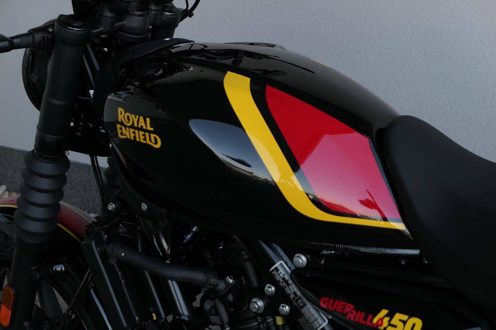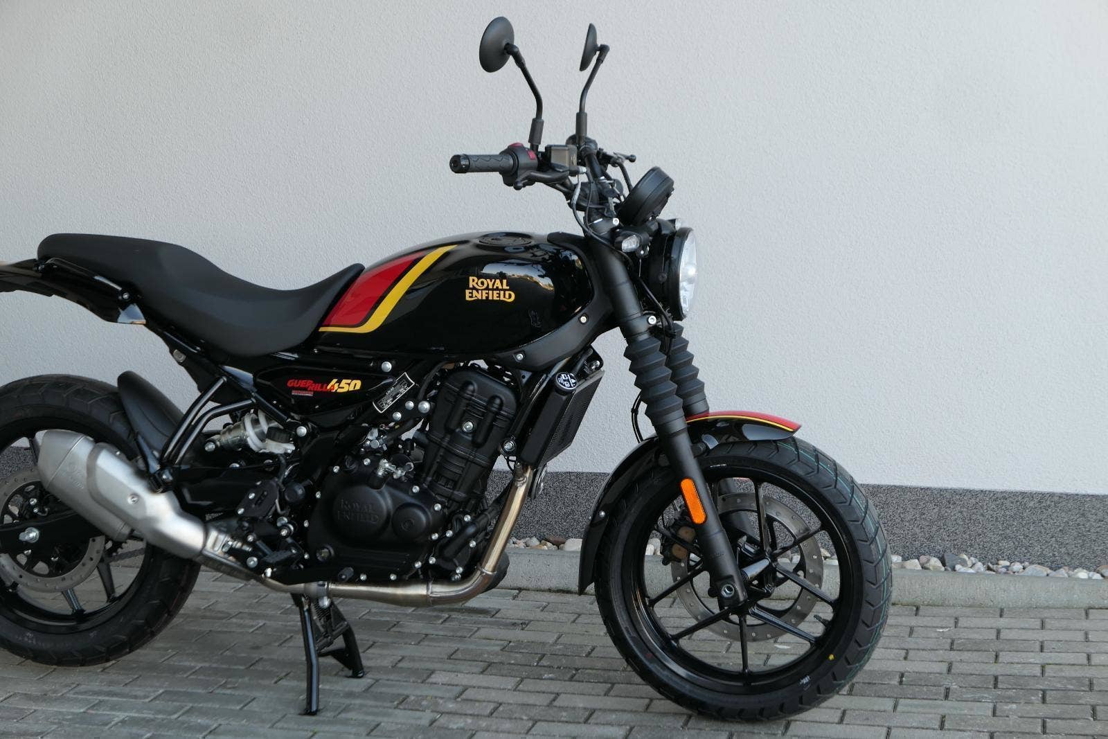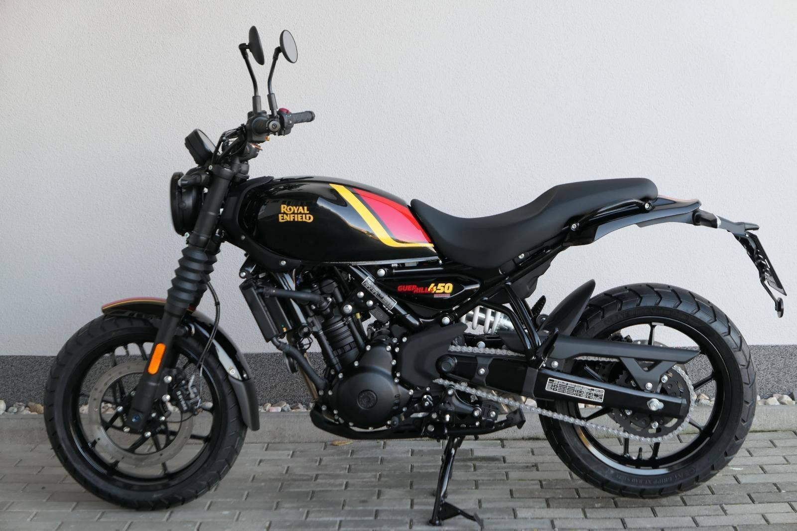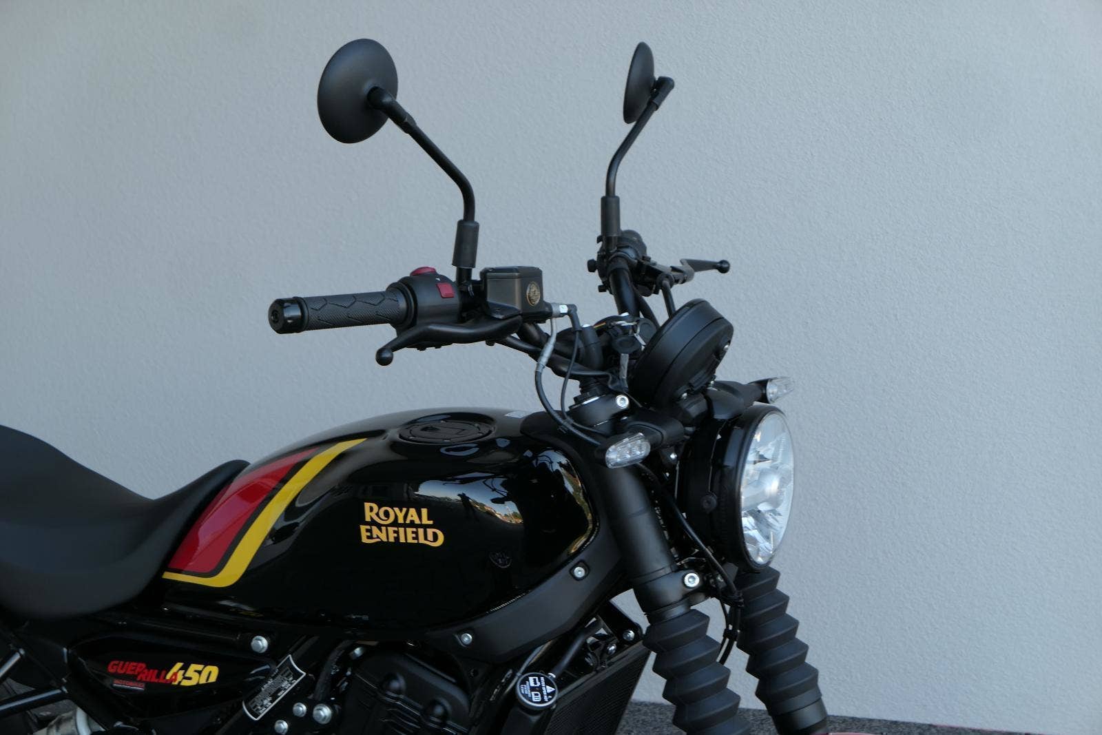 Z dosavadní modelové řady má Guerilla nejblíž Hunteru, působí ale moderněji a má i výrazně modernější techniku. Tak jako u aktuálního silnějšího Himalayanu 450 tvoří základ motorky trubkový páteřový rám, a v něm jako nosný prvek kapalinou chlazený jednoválec Sherpa o objemu 452 cm3. Relativně nový čtyřventil je mnohem výkonnější jednotkou než starší a menší vzduchem chlazené agregáty. Konkrétně nabídne rovných 40 koní v 8 000 otáčkách, a aby se to dobře pamatovalo tak i 40 Nm, které vrcholí v 5 500 otáčkách. Motor už má elektronický plyn a díky tomu i volitelné jízdní režimy – je ale poměrně jasné, který z dvojice „Eco“ a „Performance“ drtivá většina jezdců zvolí.