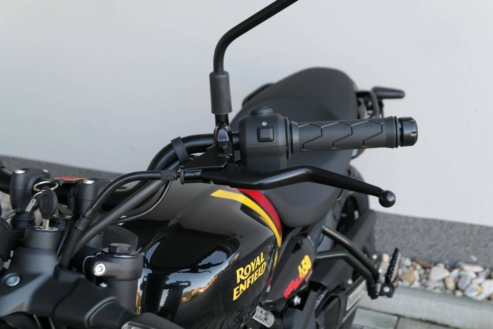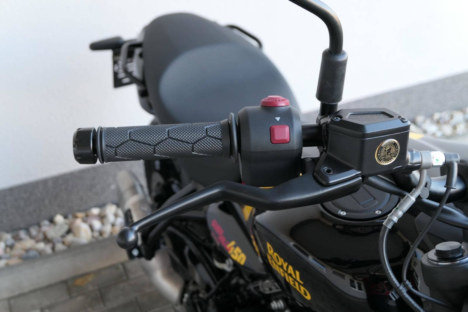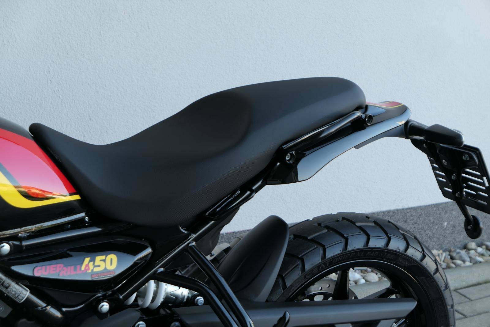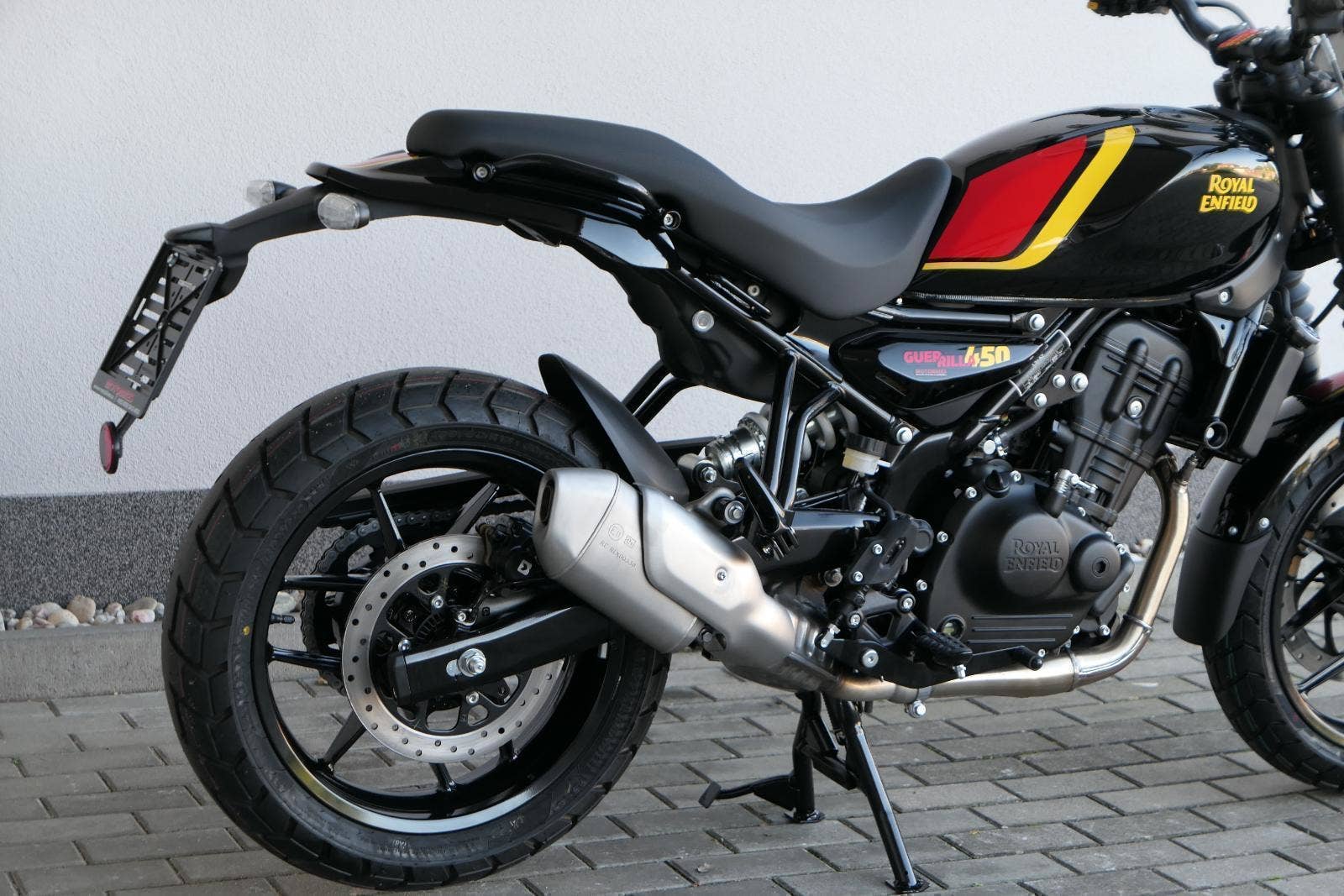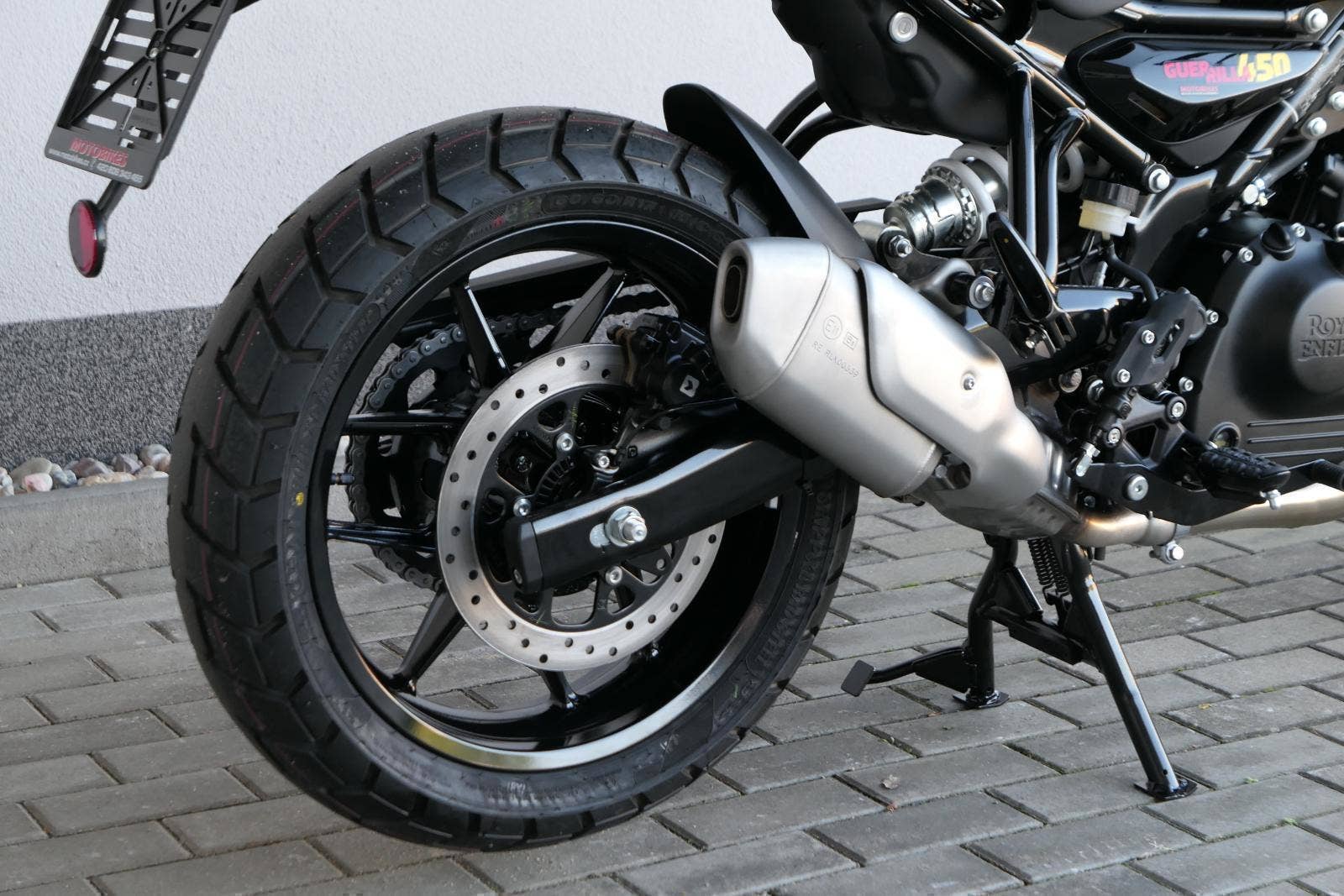 Z dosavadní modelové řady má Guerilla nejblíž Hunteru, působí ale moderněji a má i výrazně modernější techniku. Tak jako u aktuálního silnějšího Himalayanu 450 tvoří základ motorky trubkový páteřový rám, a v něm jako nosný prvek kapalinou chlazený jednoválec Sherpa o objemu 452 cm3. Relativně nový čtyřventil je mnohem výkonnější jednotkou než starší a menší vzduchem chlazené agregáty. Konkrétně nabídne rovných 40 koní v 8 000 otáčkách, a aby se to dobře pamatovalo tak i 40 Nm, které vrcholí v 5 500 otáčkách. Motor už má elektronický plyn a díky tomu i volitelné jízdní režimy – je ale poměrně jasné, který z dvojice „Eco“ a „Performance“ drtivá většina jezdců zvolí.