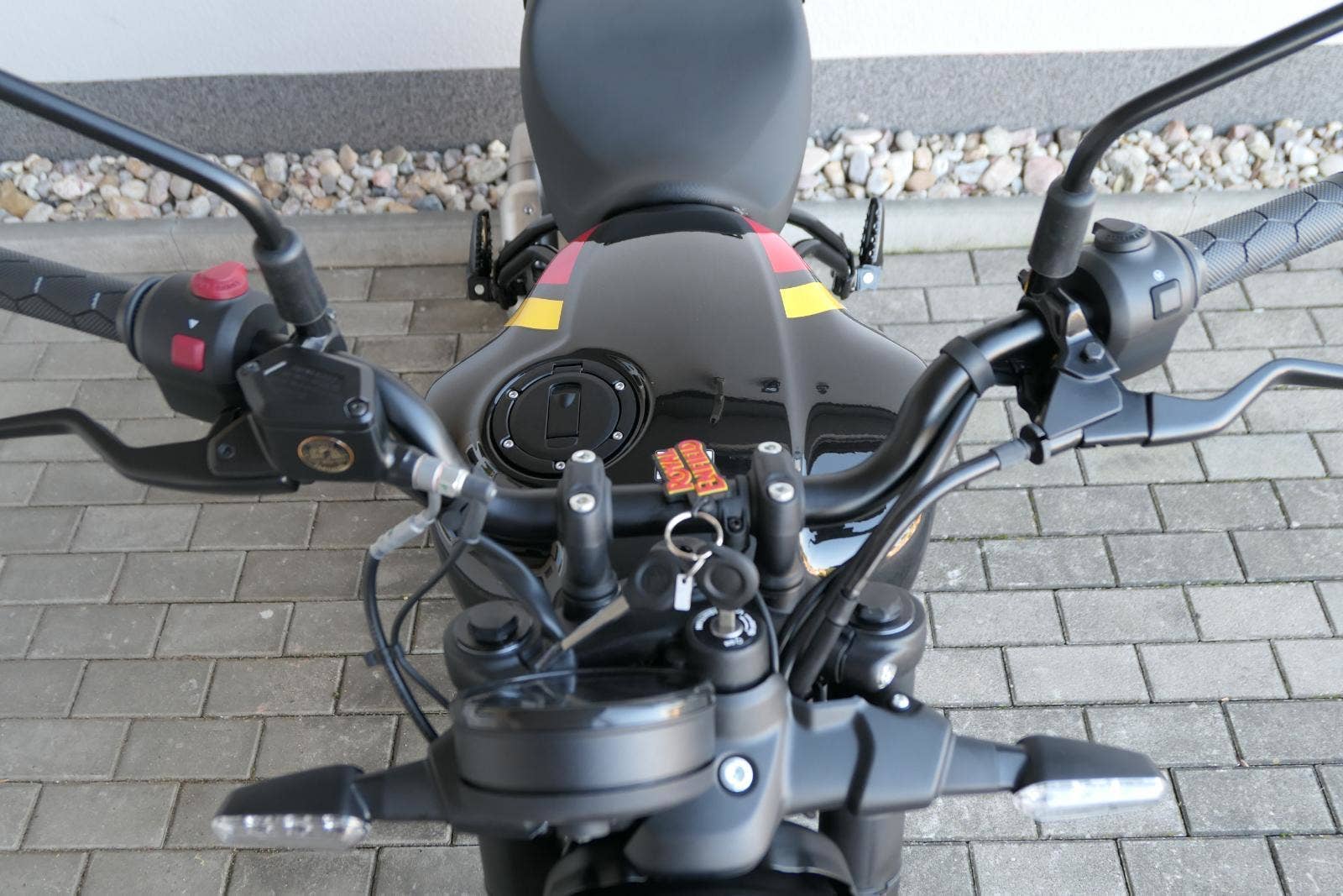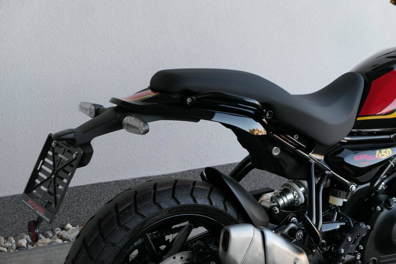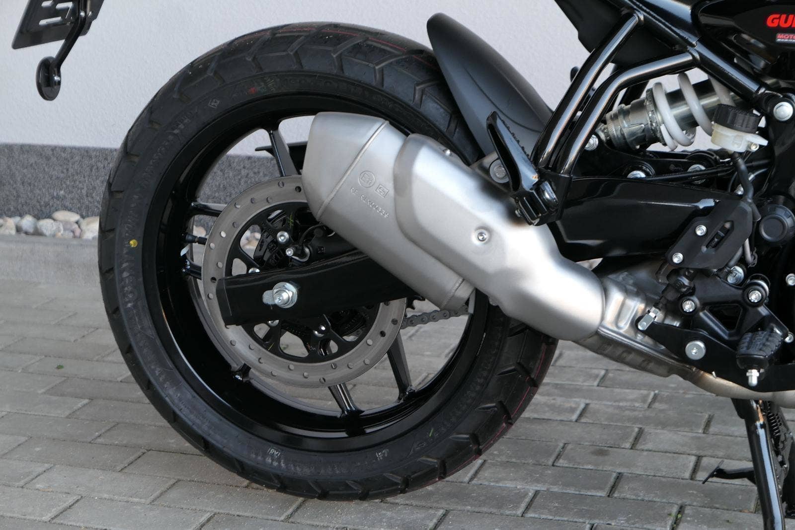 Kola jsou sedmnáctipalcová a Guerilla se chlubí přístupnou výškou sedla 780 milimetrů, stejně jako příjemnou pohotovostní hmotností 184 kilogramů. S ohledem na výkon a hmotnost jsou celkem dostačující i brzdy – vpředu jeden kotouč 310 milimetrů s dvoupístkovým brzdičem, vzadu 270 milimetrů s jednopístem. Do nádrže se vejde jenom skromných 11 litrů, na druhou stranu výrobce uvádí i skromnou tabulkovou spotřebu 3,39 litru na 100 kilometrů.