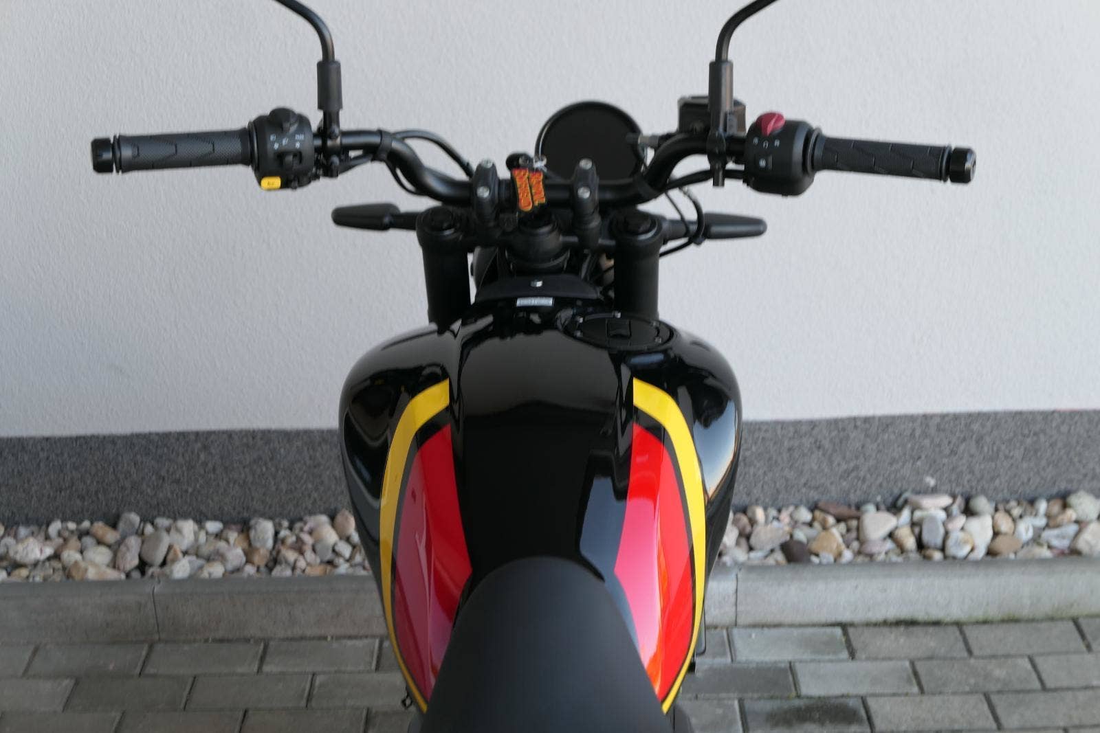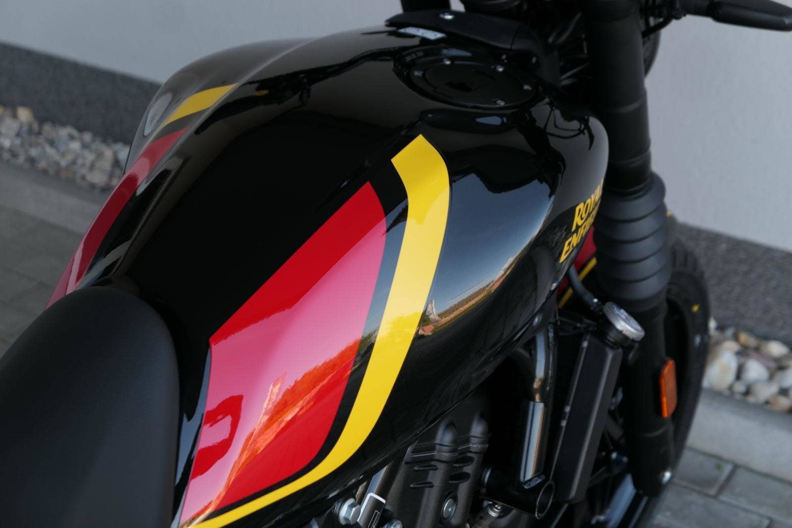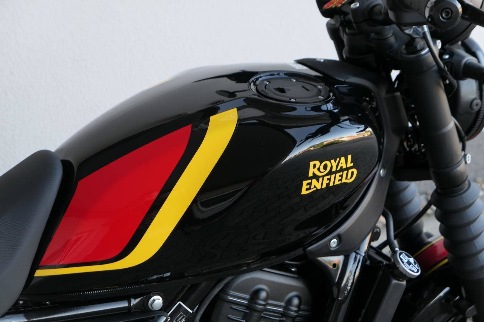 Celkově má Guerilla poměrně moderní tvary, Royal ale zdůrazňuje, že zde nejsou žádné nadbytečné plasty a serepetičky, a že jde v principu o jednoduchou a zábavnou motorku – což koneckonců spojuje všechny modely Royal Enfieldu. Opět je nutné pochválit výběr barev, který je vychytaný přesně tak, jak jsme u Royalu zvyklí. Z celkem pěti zbarvení je jenom jedno nudné, a sice jednolitá stříbrná Smoke Silver. Zbytek, tedy Brava Blue, Yellow Ribbon, Playa Black a Gold Dip zajímavě kombinují barevnou grafiku a ve třech případech dostanete i barevné ráfky.