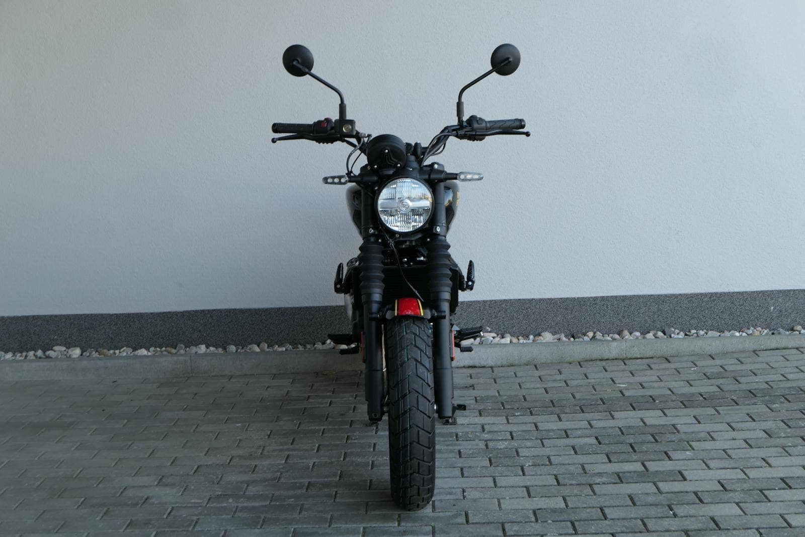 Na rozdíl od Himalayanu, nedělá si Guerrilla terénní ambice, byť některými prvky decentně připomíná, že je vlastně naháčo-scrambler – ve všech tiskových materiálech se pak objevuje populární termín „roadster“. Na teleskopických vidlicích jsou třeba prďácké retro prachovky, nicméně zdvih je jenom 140 milimetrů. Zadní vyosený centrál má potom 150 milimetrů.