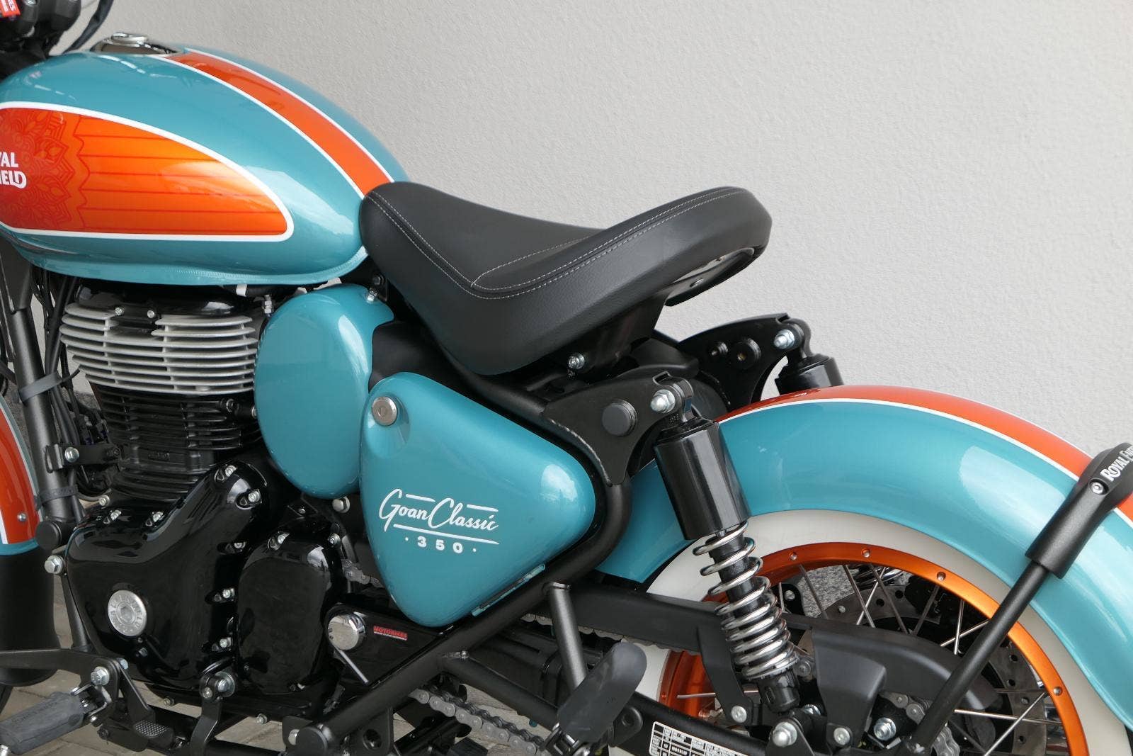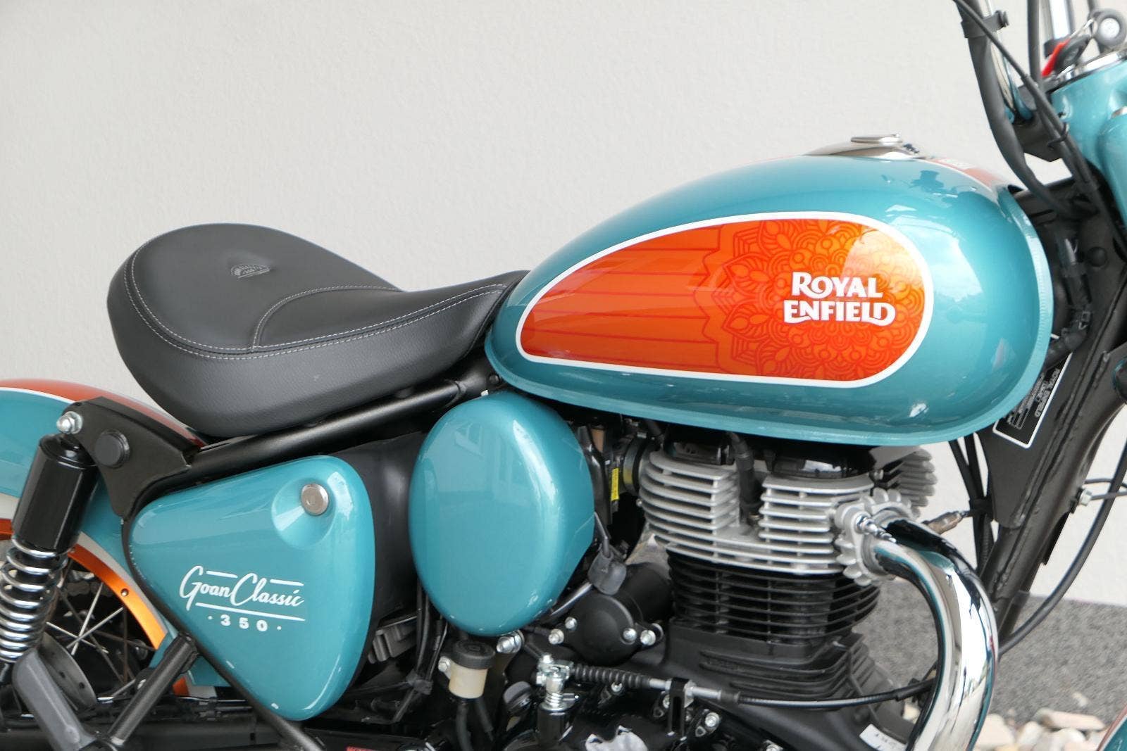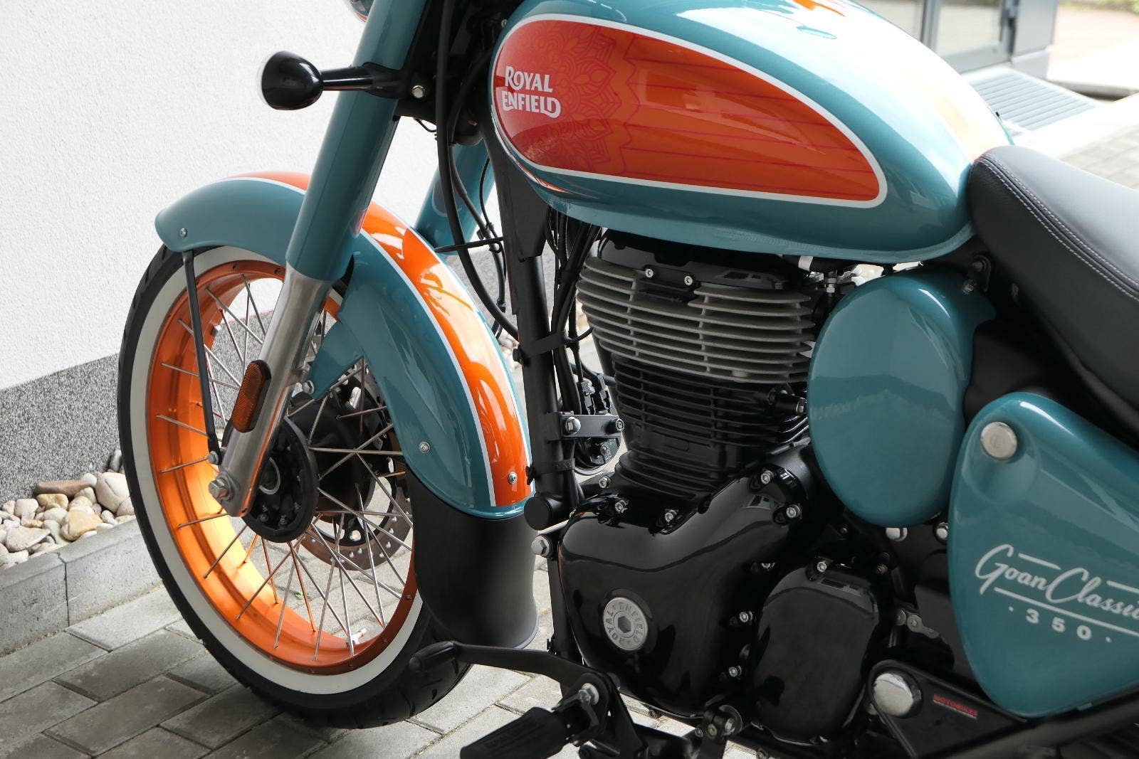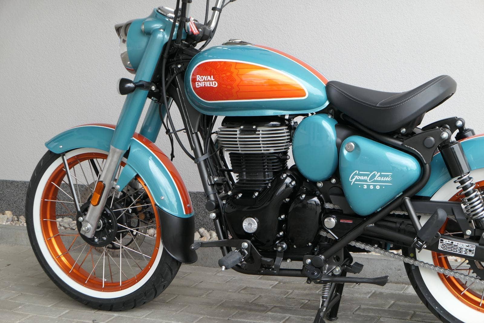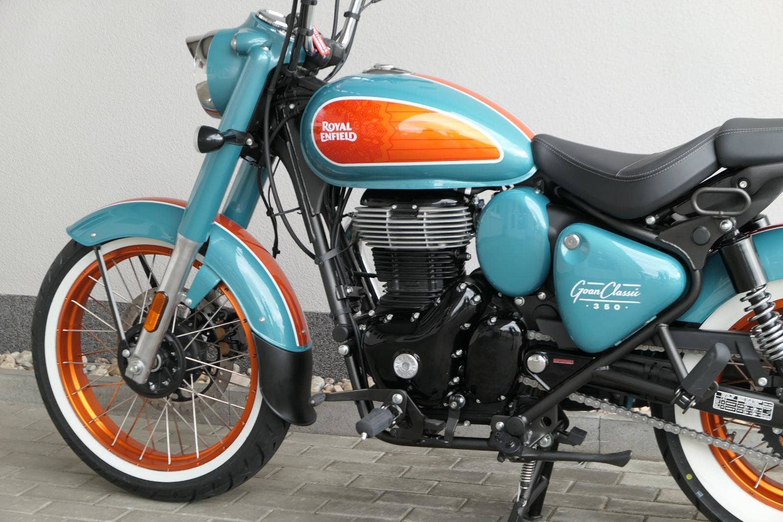 „Trip Teal Green“ s oranžovými akcenty evokujícími ducha Goan moto-kultury.