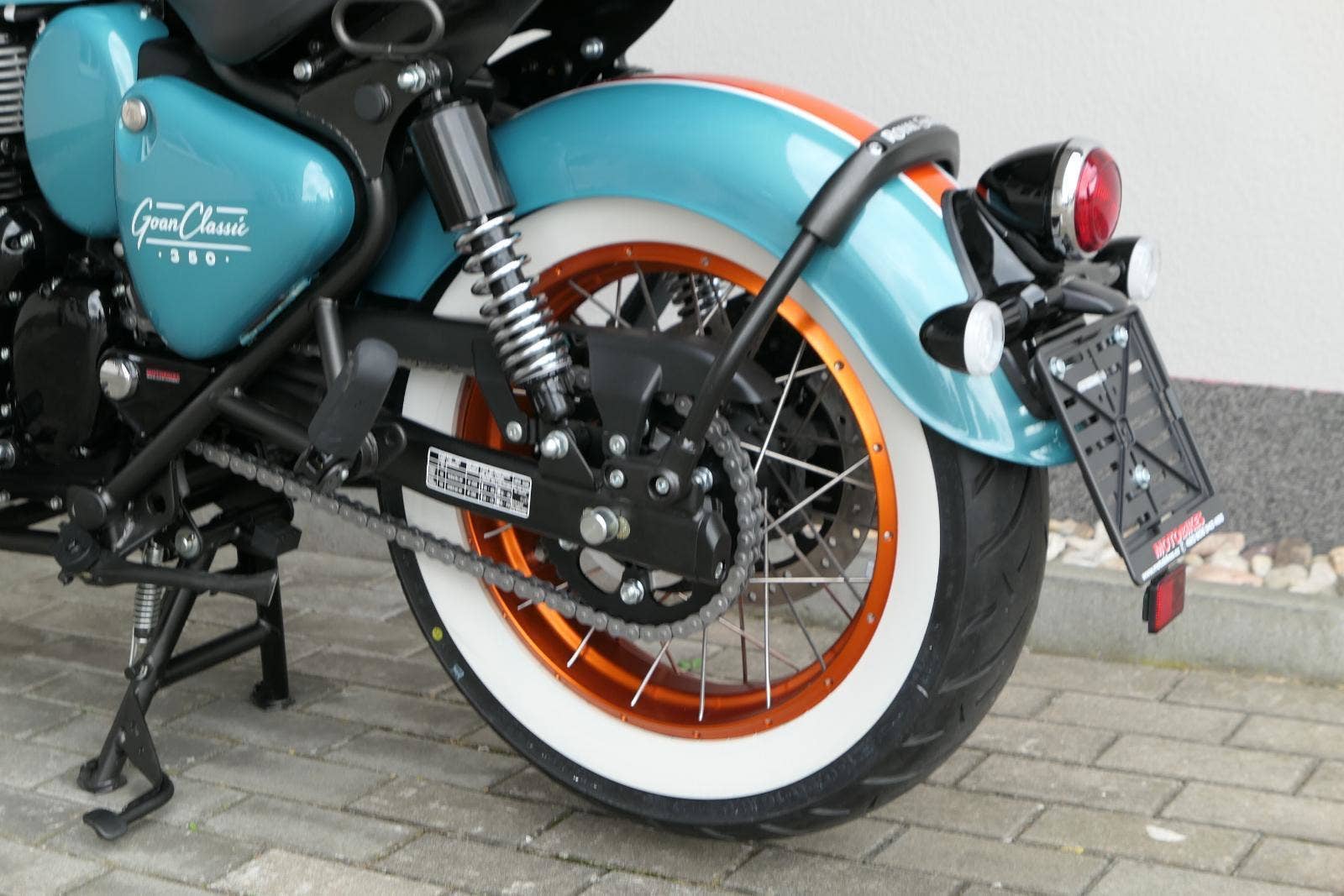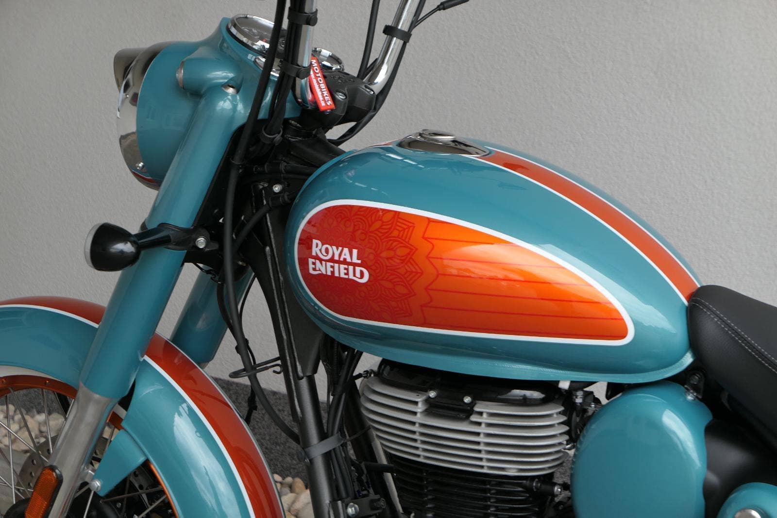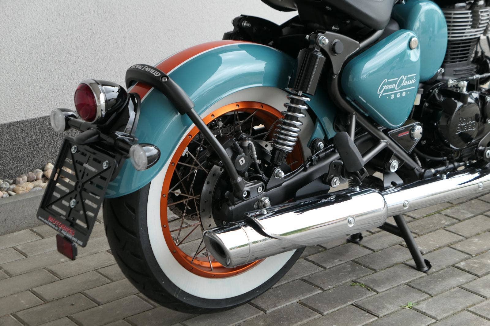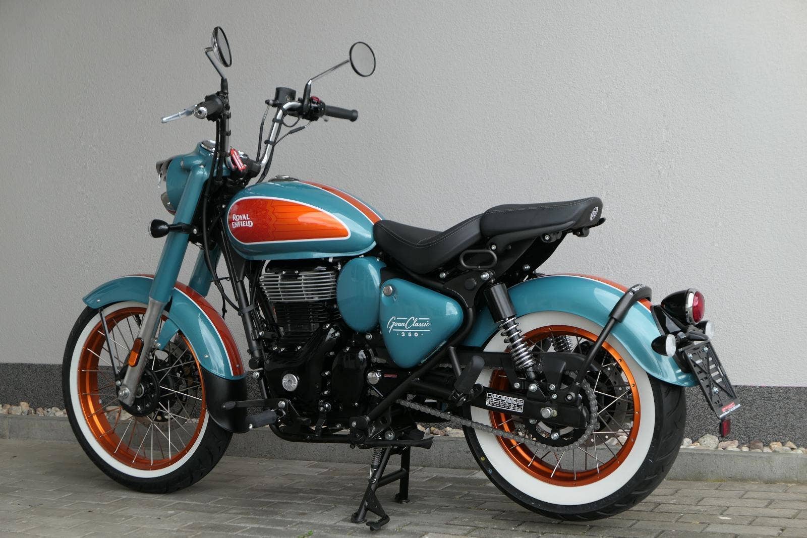 „Trip Teal Green“ s oranžovými akcenty evokujícími ducha Goan moto-kultury.