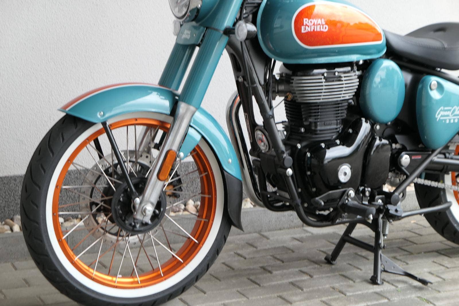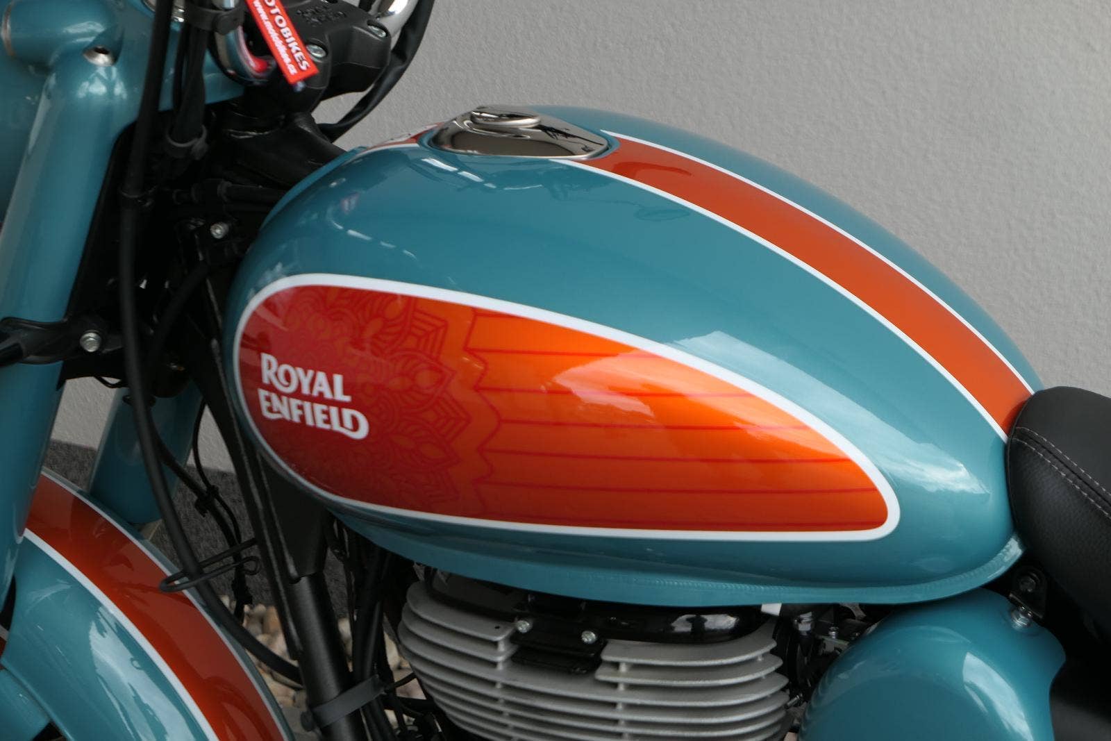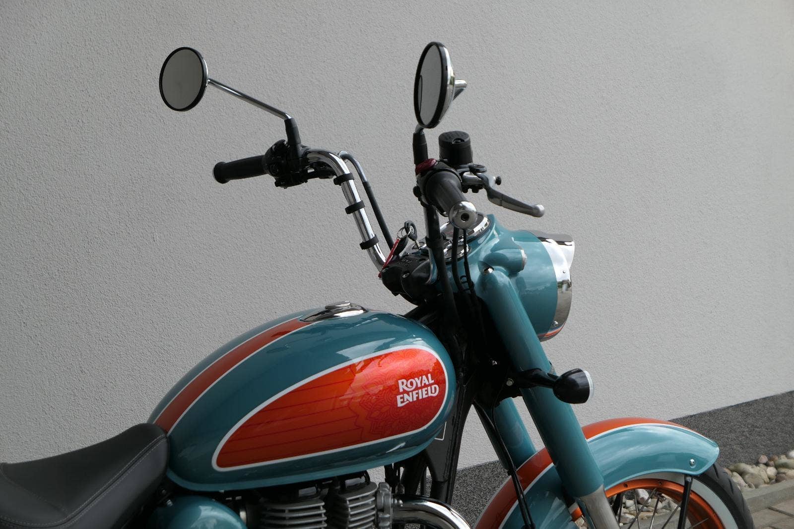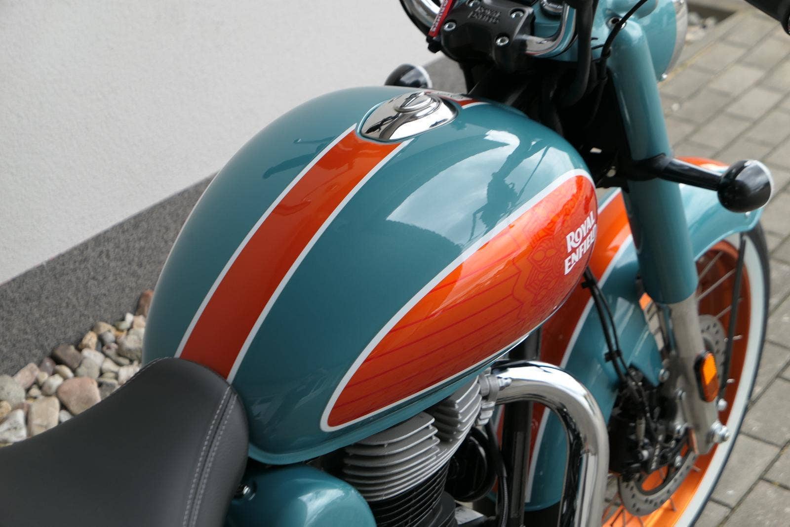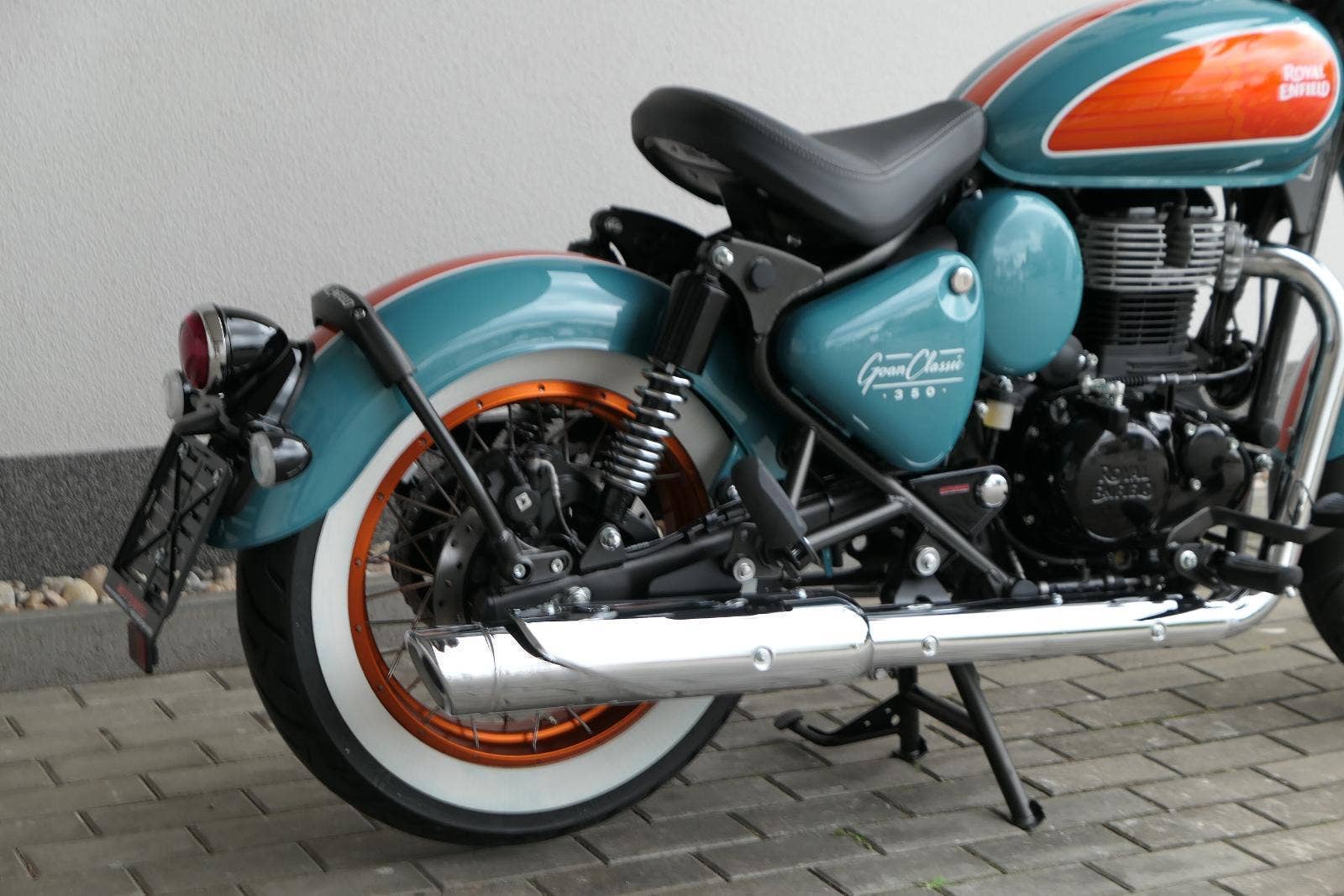 „Trip Teal Green“ s oranžovými akcenty evokujícími ducha Goan moto-kultury.