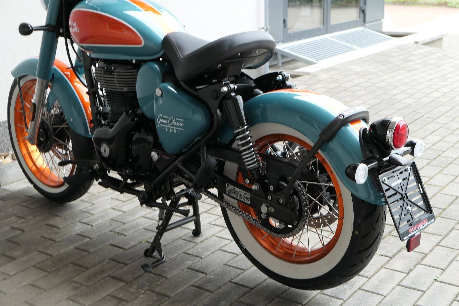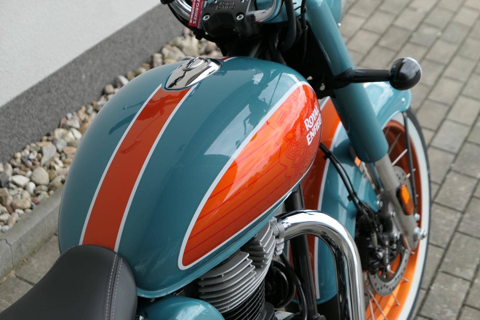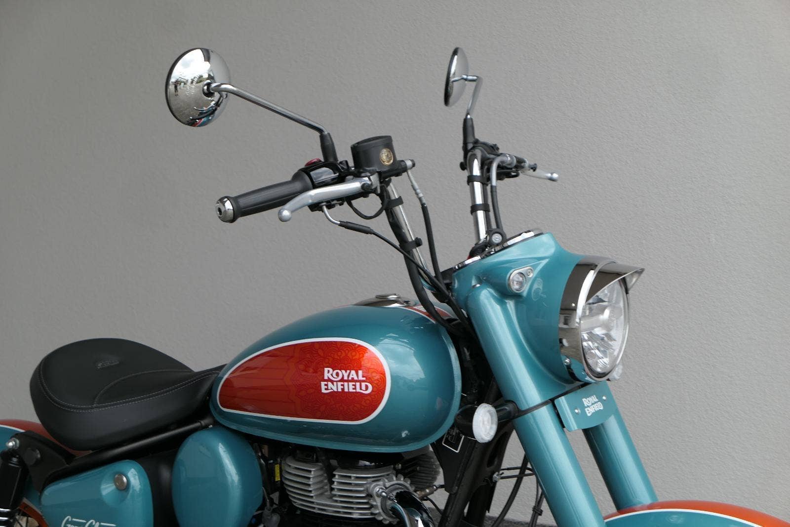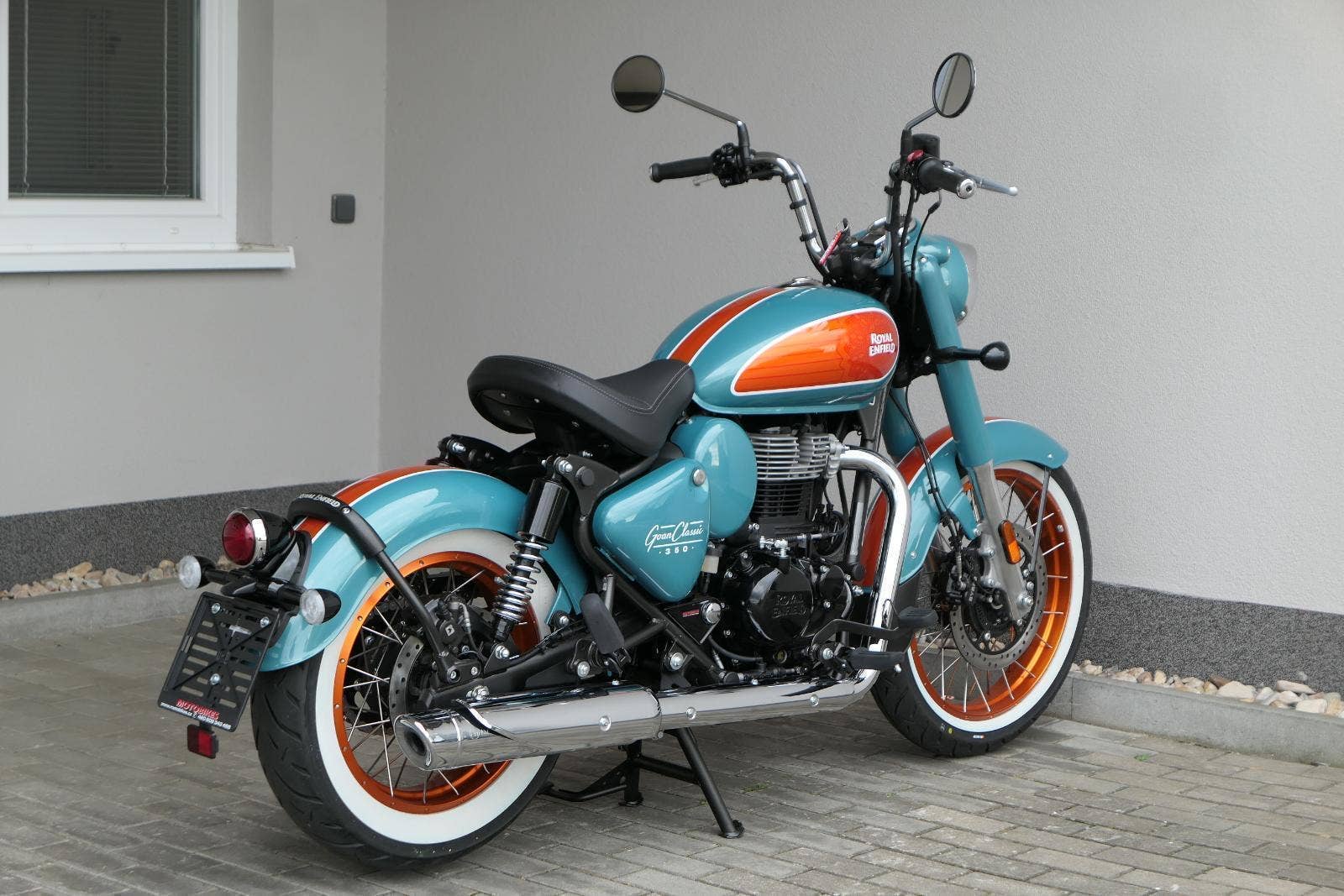 „Trip Teal Green“ s oranžovými akcenty evokujícími ducha Goan moto-kultury.