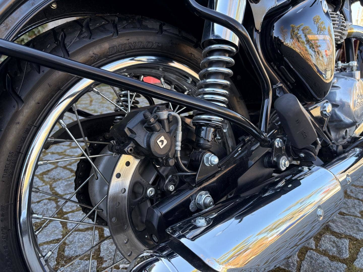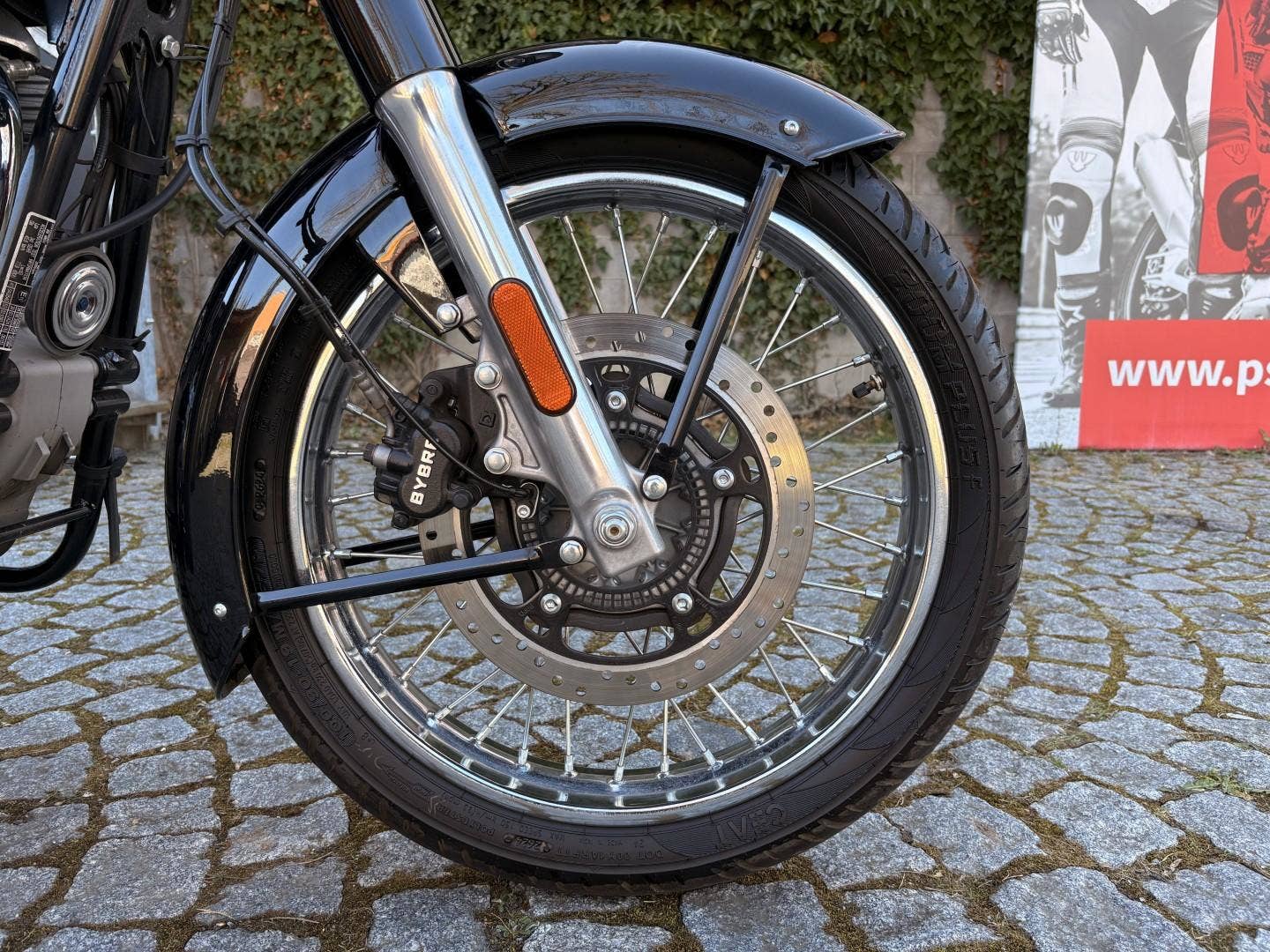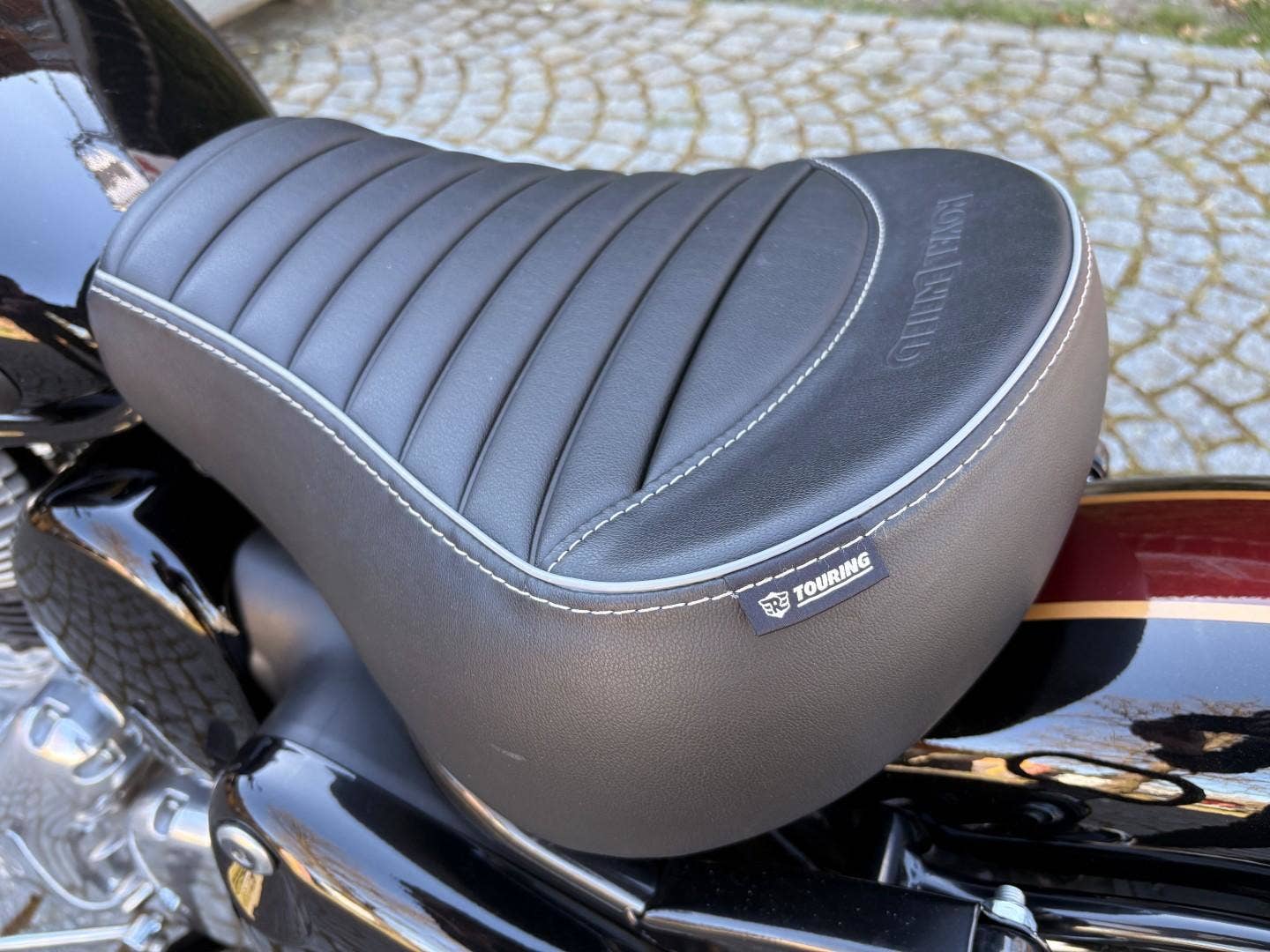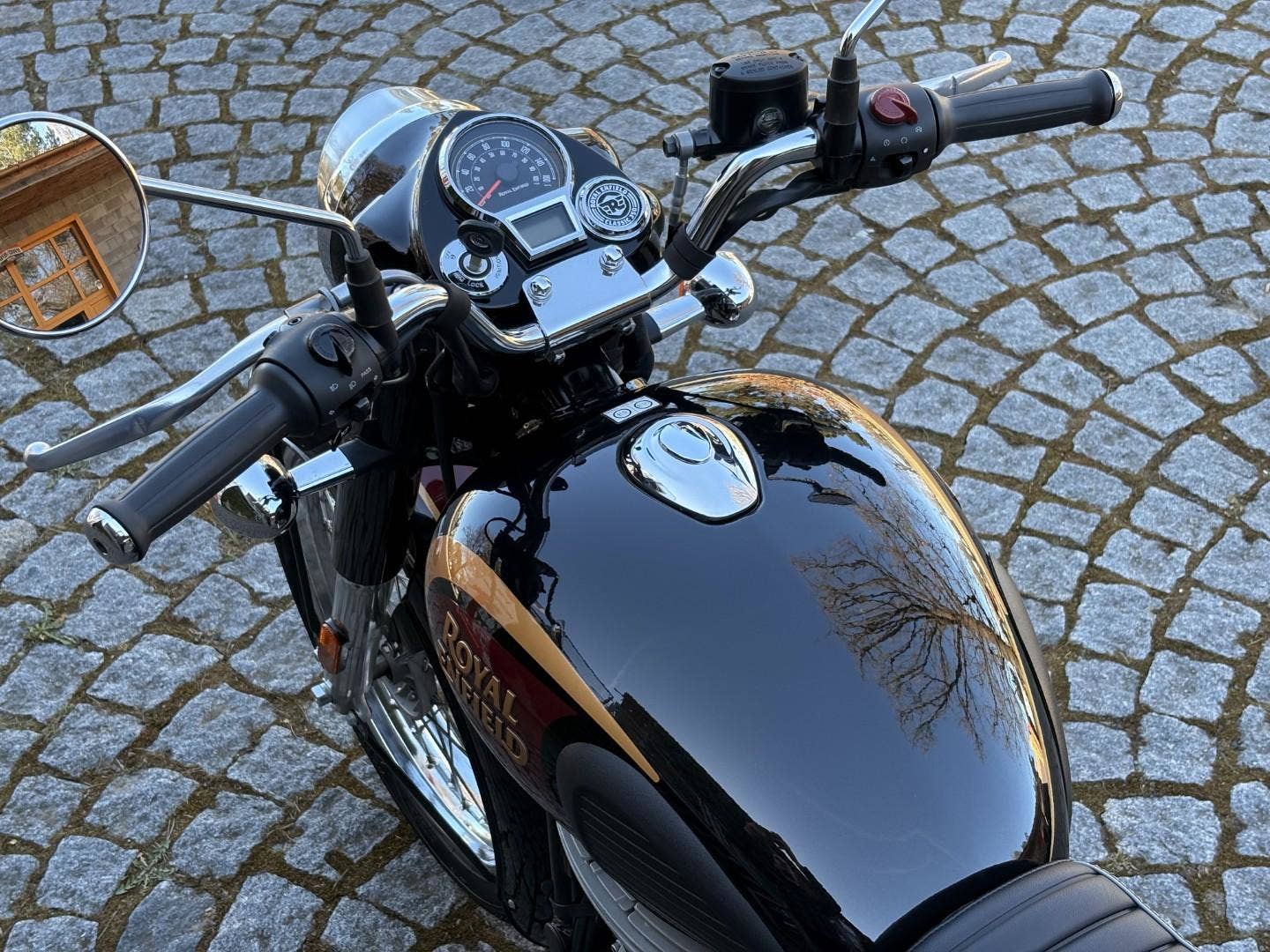 Motocykl je po prvním majiteli. Zakoupený 28.4.2025 u nás v Royal Enfield Plzeň a zde i pravidelně servisovaný. Motocykl je v krásném stavu bez jediného poškození v klasické barvené kombinaci černé metalízy s vínovými pruhy. Navíc je vybaven Touringovým sedlem řidiče. Součástí motocyklu je sedlo spolujezdce. Motocykl má úplně novou zadní pneu Dunlop (původní byla píchnutá bez možností opravy)