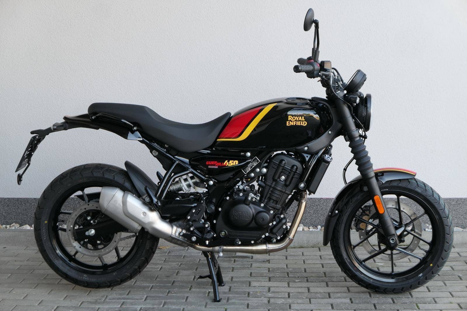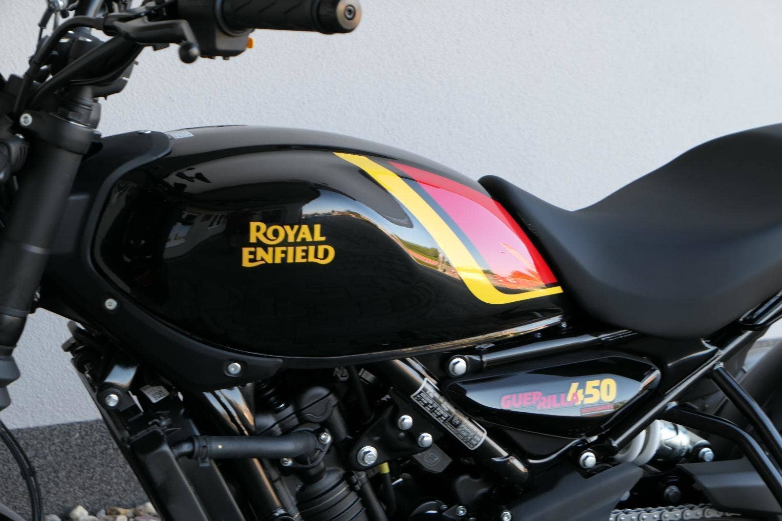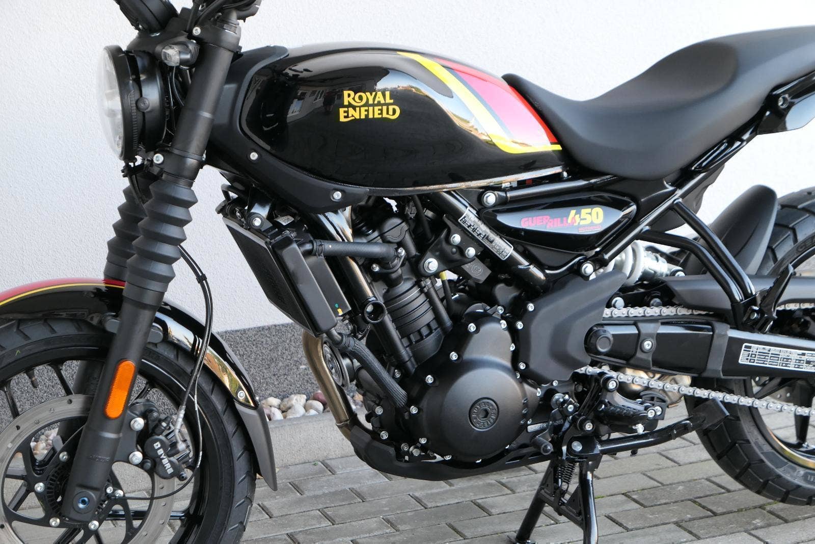 Z dosavadní modelové řady má Guerilla nejblíž Hunteru, působí ale moderněji a má i výrazně modernější techniku. Tak jako u aktuálního silnějšího Himalayanu 450 tvoří základ motorky trubkový páteřový rám, a v něm jako nosný prvek kapalinou chlazený jednoválec Sherpa o objemu 452 cm3. Relativně nový čtyřventil je mnohem výkonnější jednotkou než starší a menší vzduchem chlazené agregáty. Konkrétně nabídne rovných 40 koní v 8 000 otáčkách, a aby se to dobře pamatovalo tak i 40 Nm, které vrcholí v 5 500 otáčkách. Motor už má elektronický plyn a díky tomu i volitelné jízdní režimy – je ale poměrně jasné, který z dvojice „Eco“ a „Performance“ drtivá většina jezdců zvolí.