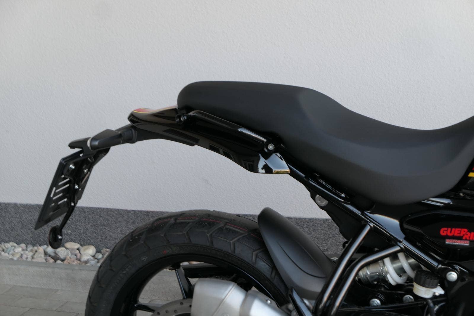 Kola jsou sedmnáctipalcová a Guerilla se chlubí přístupnou výškou sedla 780 milimetrů, stejně jako příjemnou pohotovostní hmotností 184 kilogramů. S ohledem na výkon a hmotnost jsou celkem dostačující i brzdy – vpředu jeden kotouč 310 milimetrů s dvoupístkovým brzdičem, vzadu 270 milimetrů s jednopístem. Do nádrže se vejde jenom skromných 11 litrů, na druhou stranu výrobce uvádí i skromnou tabulkovou spotřebu 3,39 litru na 100 kilometrů.