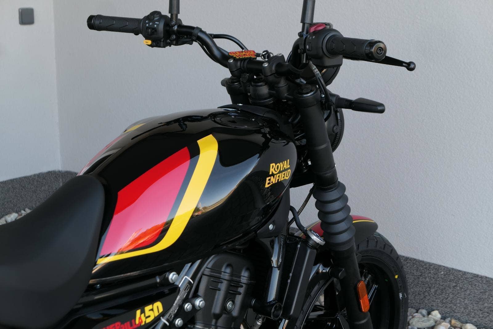 Royal Enfield Guerrilla 450 sdílí motor a technický základ s cestovním endurem Himalayan 450, stojí ale na malých silničních kolech a místo cestování míří na každodenní dojíždění, i na radovánky okolo komína.