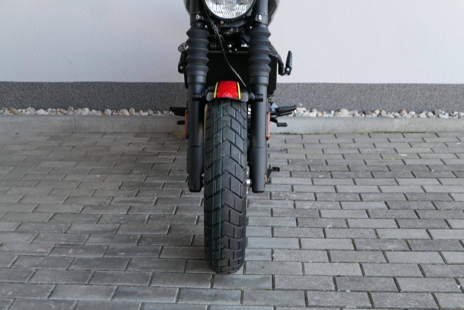 Na rozdíl od Himalayanu, nedělá si Guerrilla terénní ambice, byť některými prvky decentně připomíná, že je vlastně naháčo-scrambler – ve všech tiskových materiálech se pak objevuje populární termín „roadster“. Na teleskopických vidlicích jsou třeba prďácké retro prachovky, nicméně zdvih je jenom 140 milimetrů. Zadní vyosený centrál má potom 150 milimetrů.