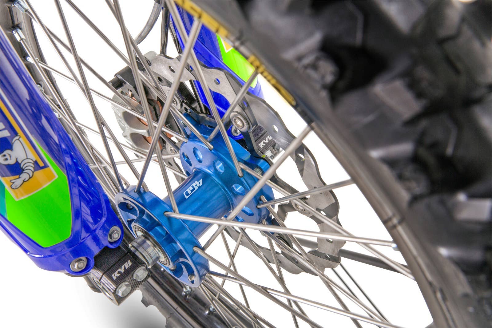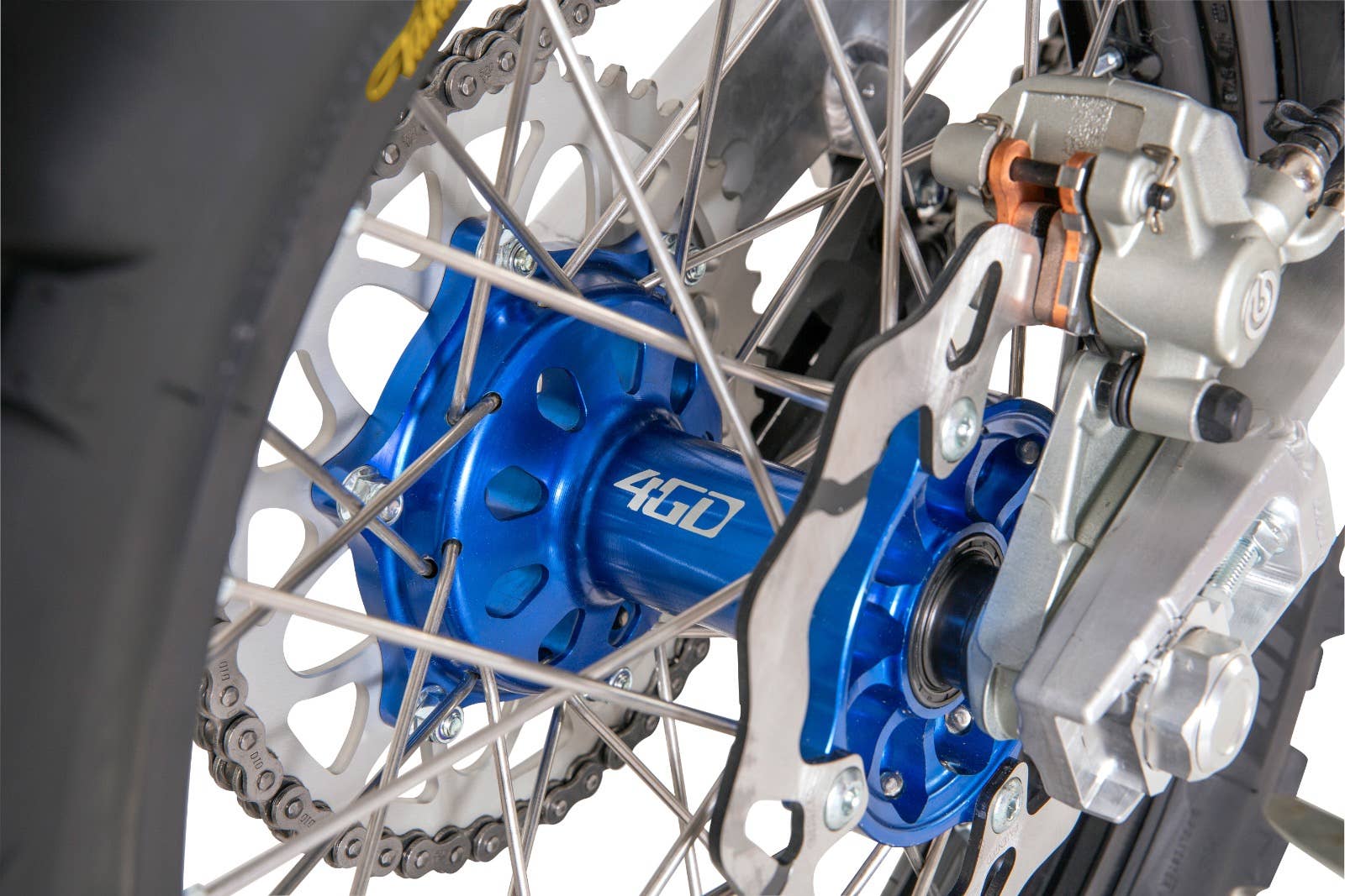 Modré přední a zadní náboje 4GD obráběné na CNC s vyztuženými paprsky