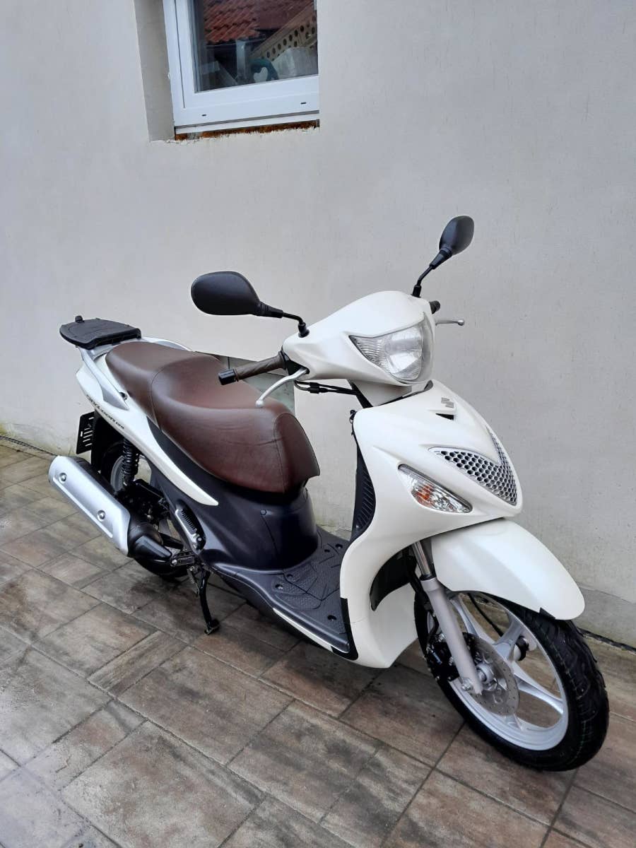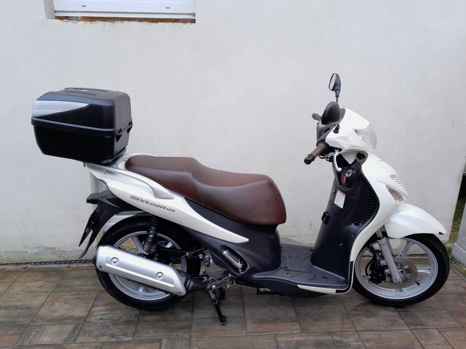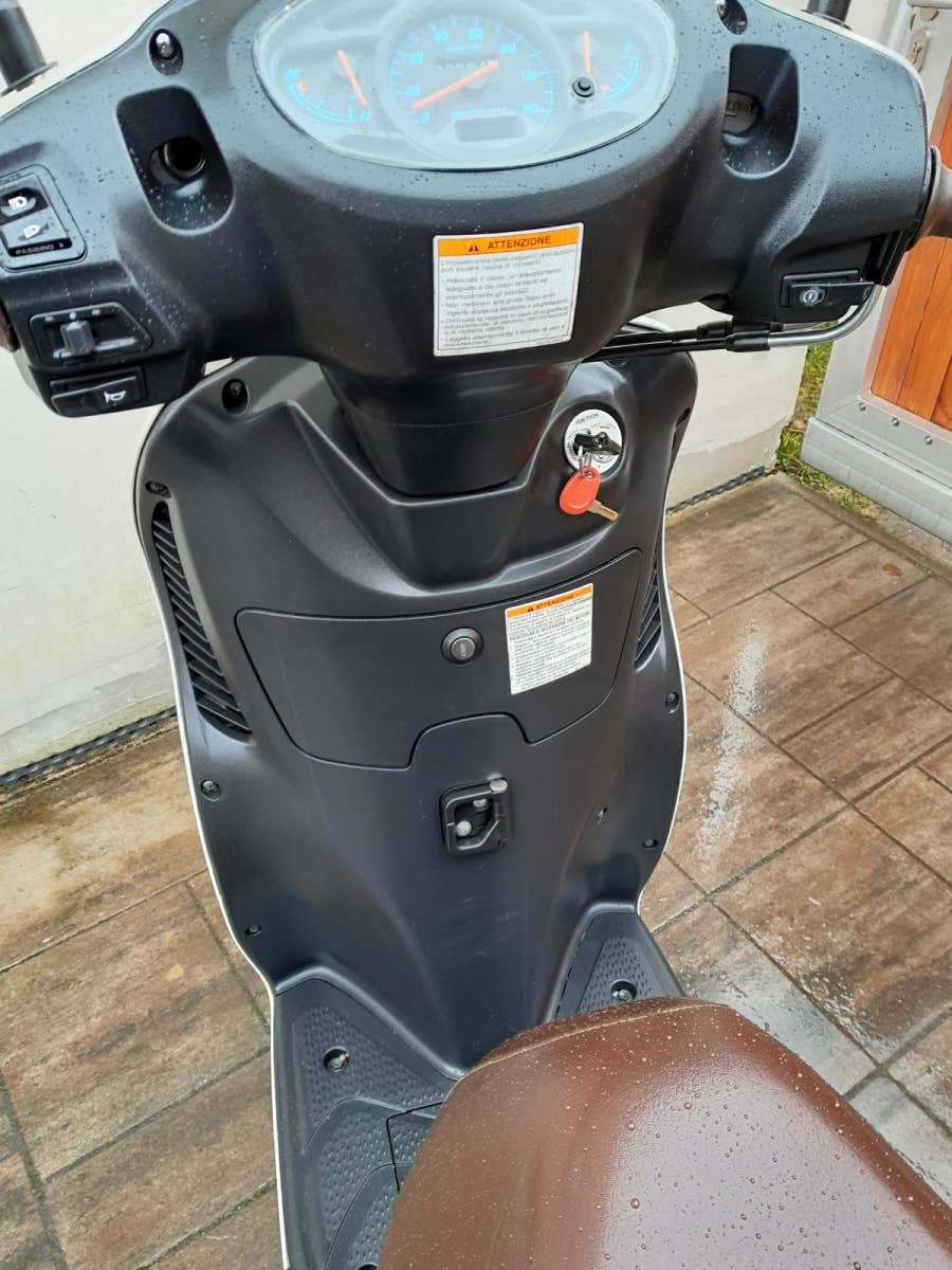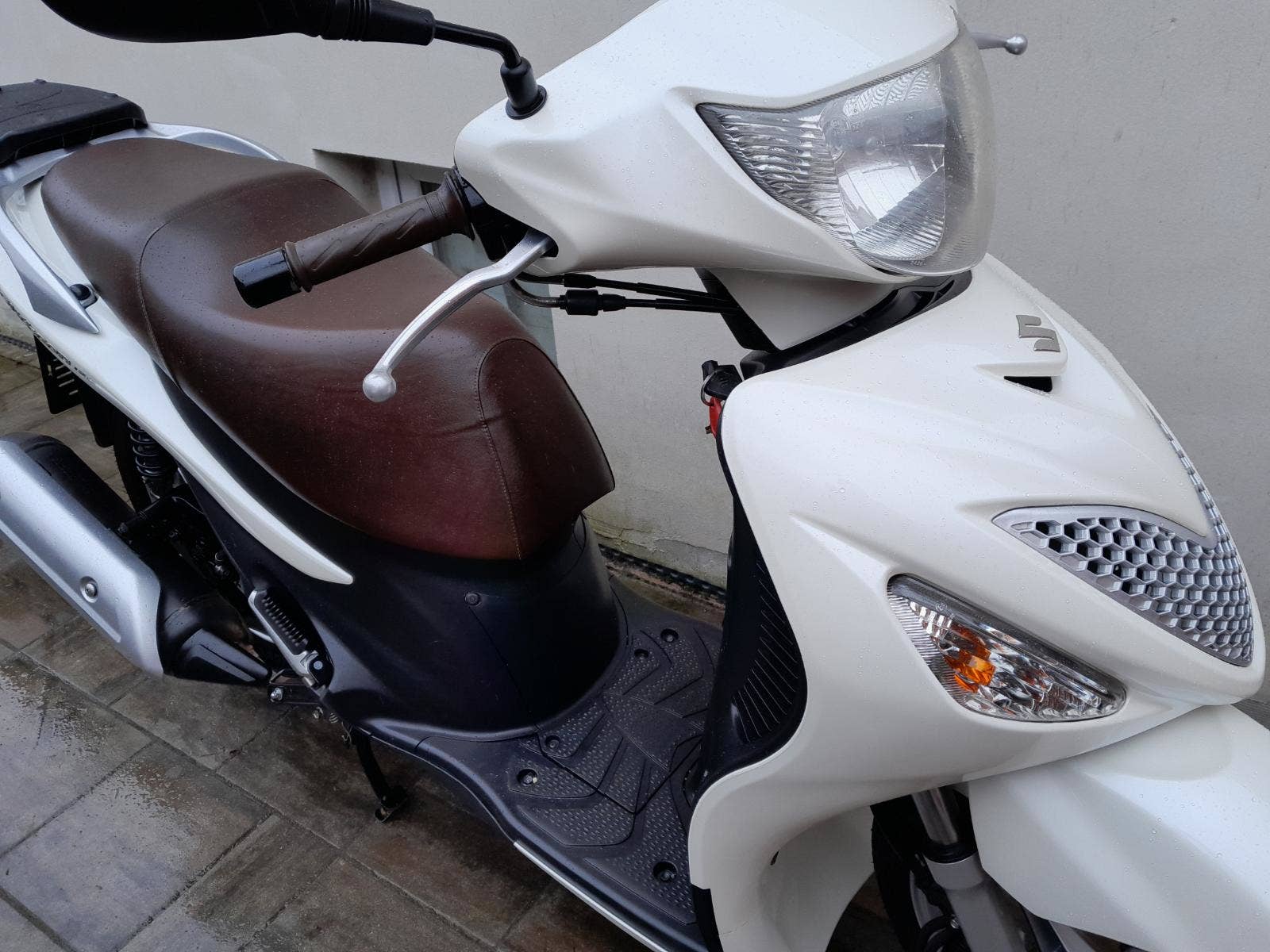 Moc pěkný skútr ve velmi dobrém stavu. Nebyl havarovany, podvozek bez koroze, oxidace apod., původní pěkný lak. Dovoz z Itálie, skútr byl garážovaný a nejezdil u moře. Podobný jako Honda SH 125. Nízká spotřeba, max. rychlost přes 100km/h. Po výměně motorového oleje. Uvedená cena je bez doplňkového kufru, možno přikoupit. Na skútru je poškozený potah sedla, v ceně sedlo jiné, nepoškozené - není na fotce.