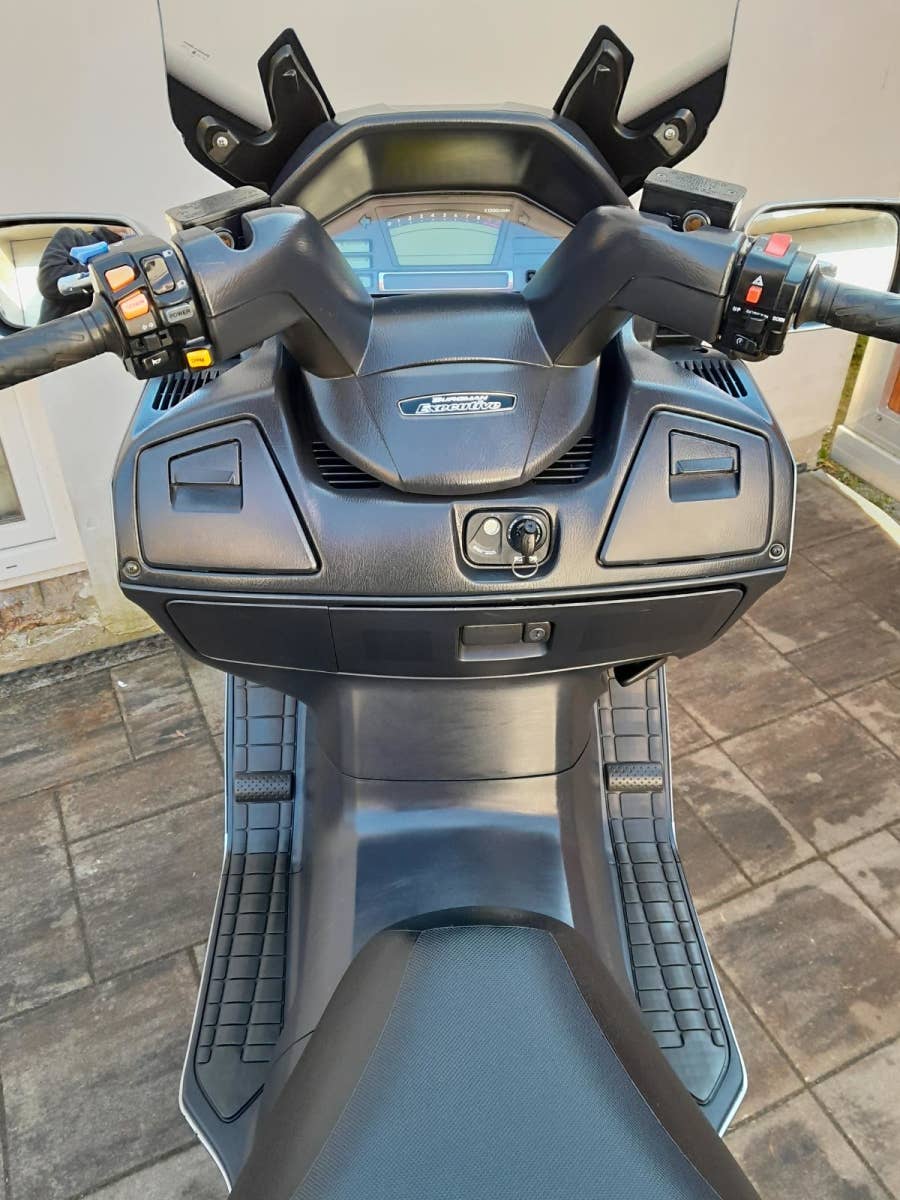2-válec se vstřikováním paliva, automat s možností přepnutí na sekvenční řazení - ovládané na řidítkách, max. rychlost přes 160km/h. Velmi prostorný a pohodlný maxiskútr, vhodný i na delší trasy. Skútr ve velmi dobrém stavu, nebyl havarovaný, původní lak. Po servisu v ceně 4000,– Kč (vyměněný motorový olej + filtr, svíčky, vzduchový filtr, filtr chlazení CVT, celková kontrola).