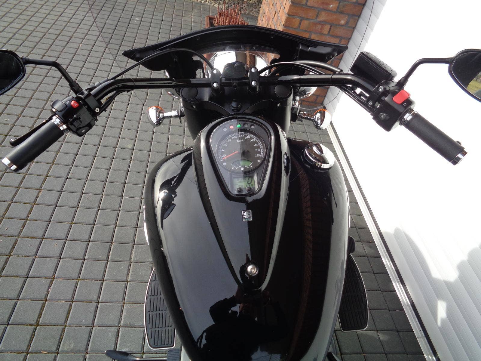 VÝBAVA: orig. plexi-štít, přední padací rámy, rampa s přídavnými světlomety + stínítka, originální opěrka spolujezdce s nosičem, skořepinové kufry na pevných podpěrách – vše zamykatelné jedním klíčem, pohybový alarm - 2x ovladač na dálku. Dále příplatkové zadní plotny, zásuvka 12V a USB, dobíjecí kabel baterie ….