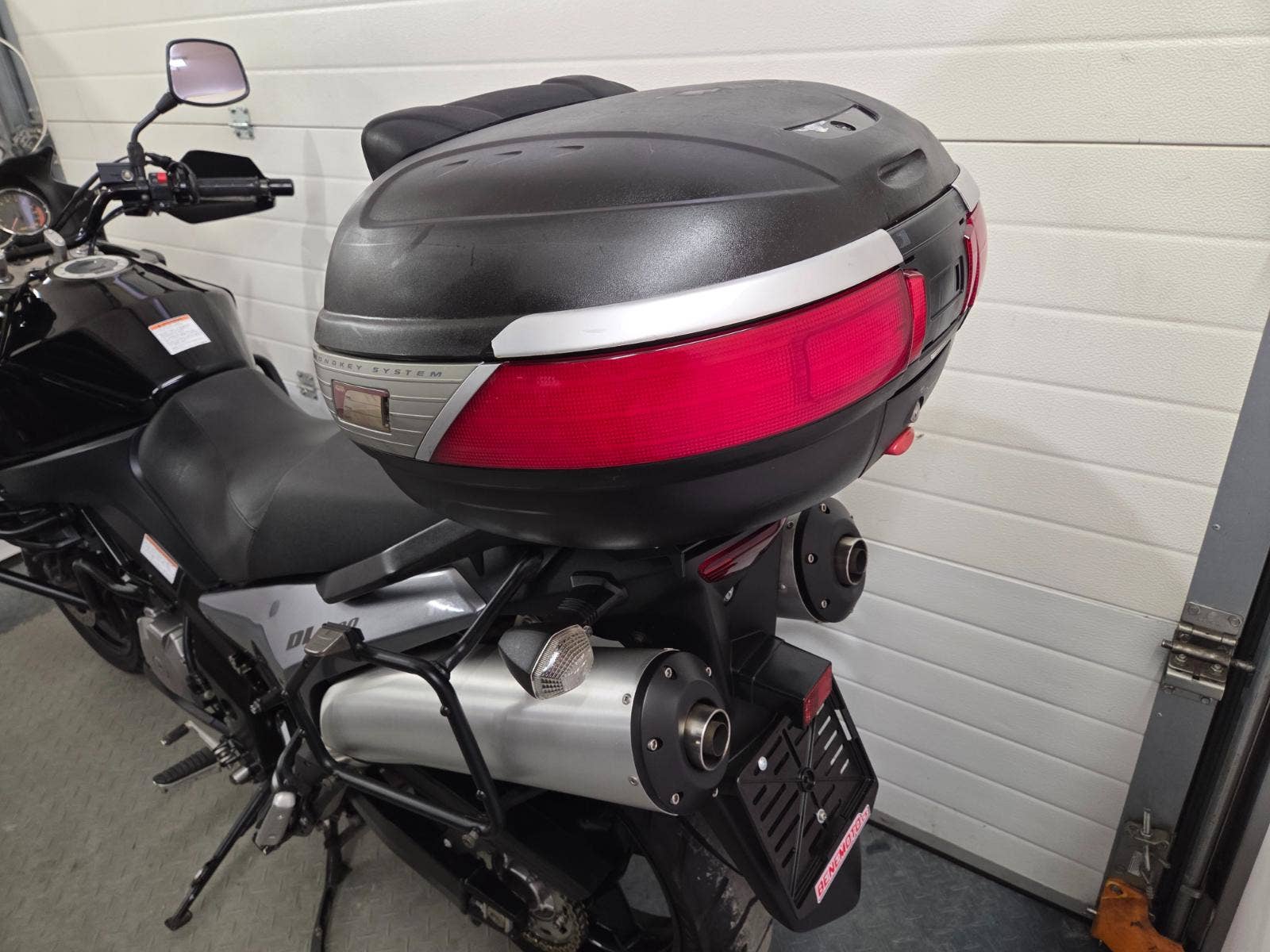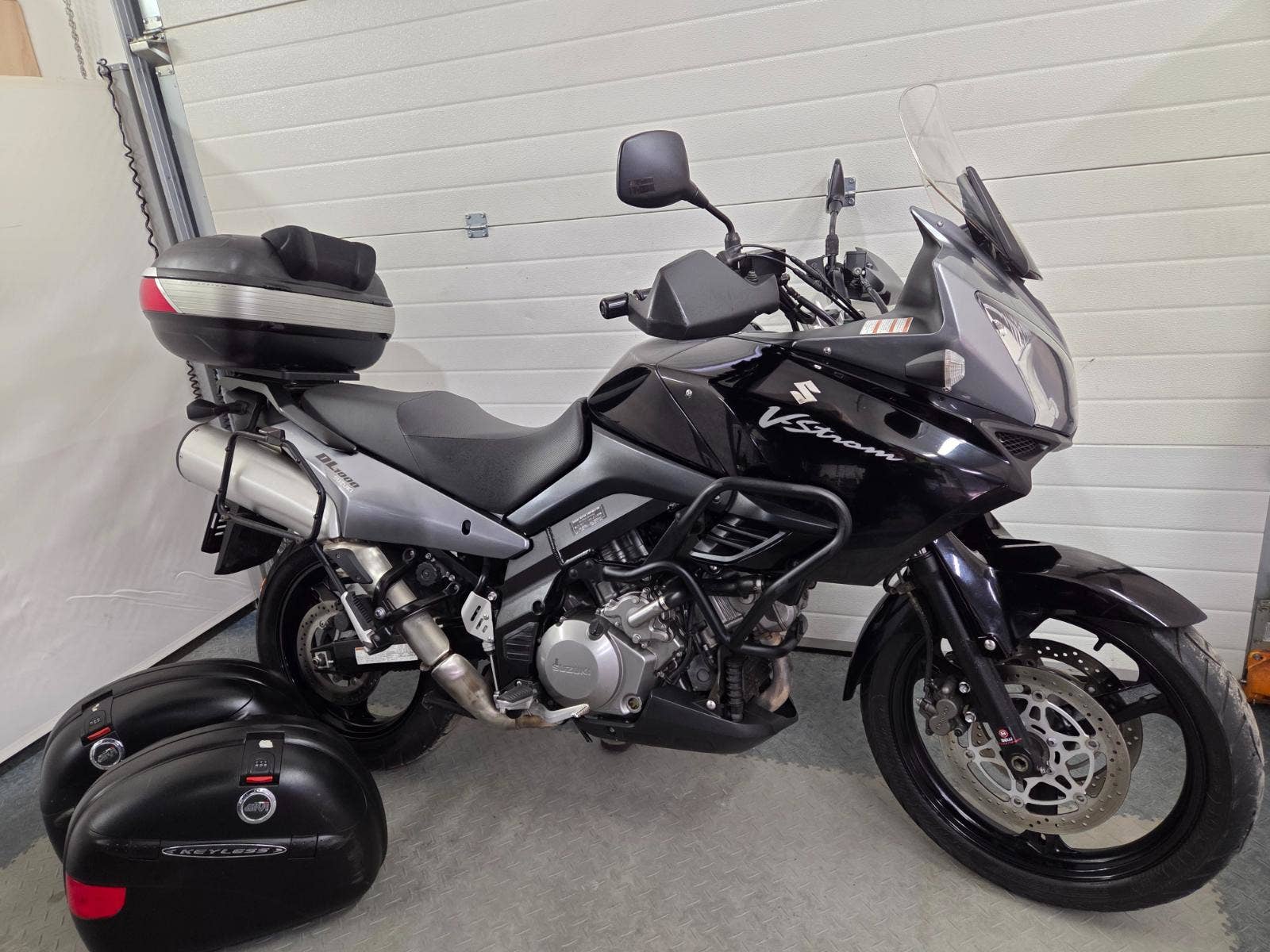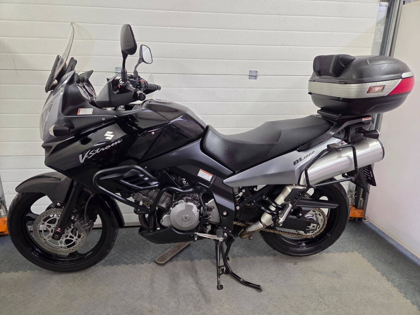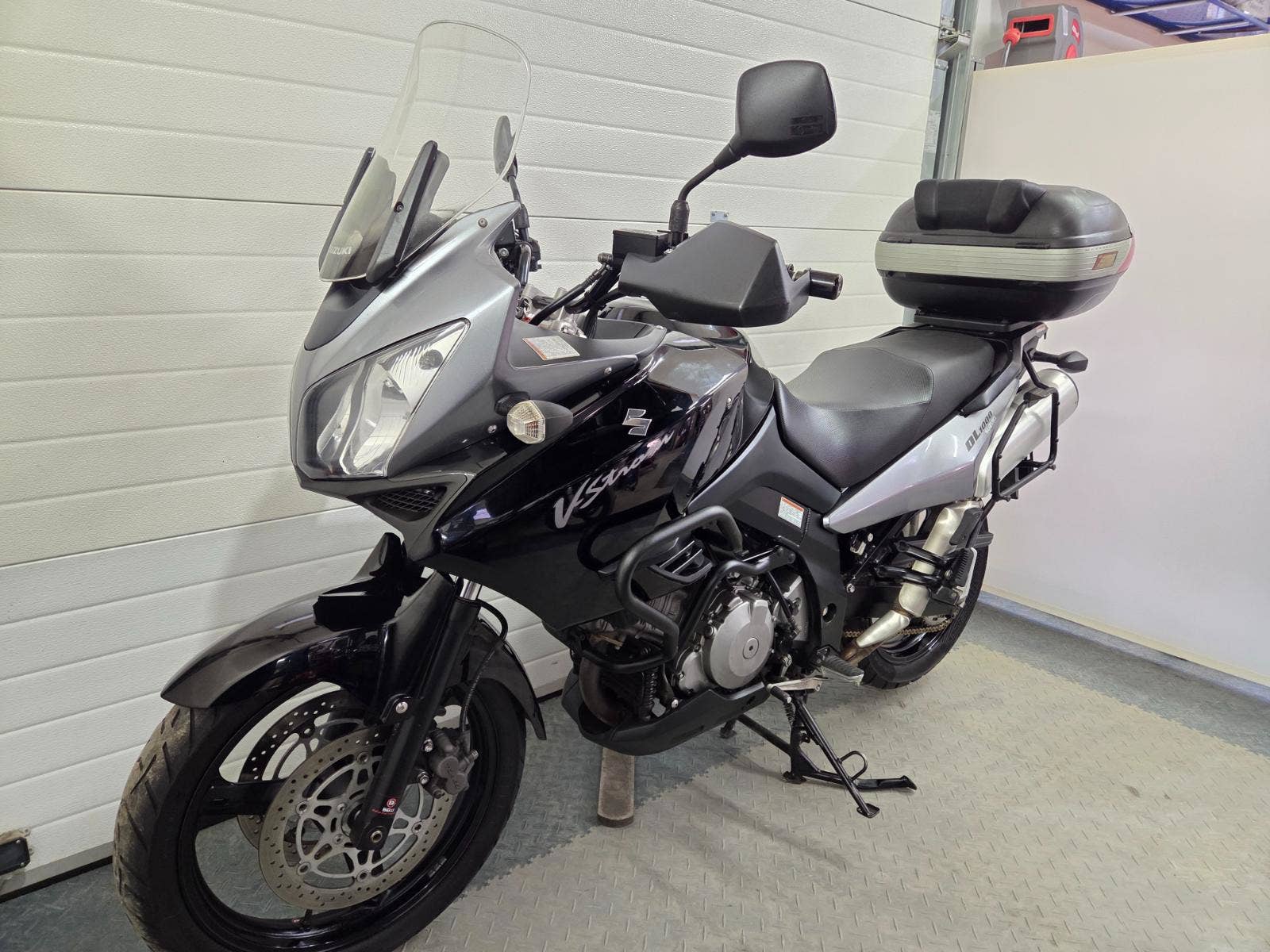 velká výbava: padací rám, centrální stojan, 3x kufr Givi, zásuvka, výhřev rukojetí
