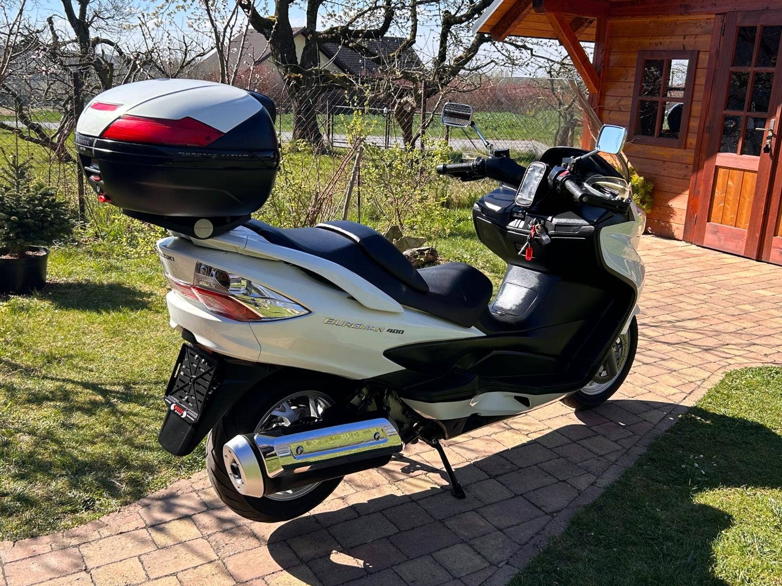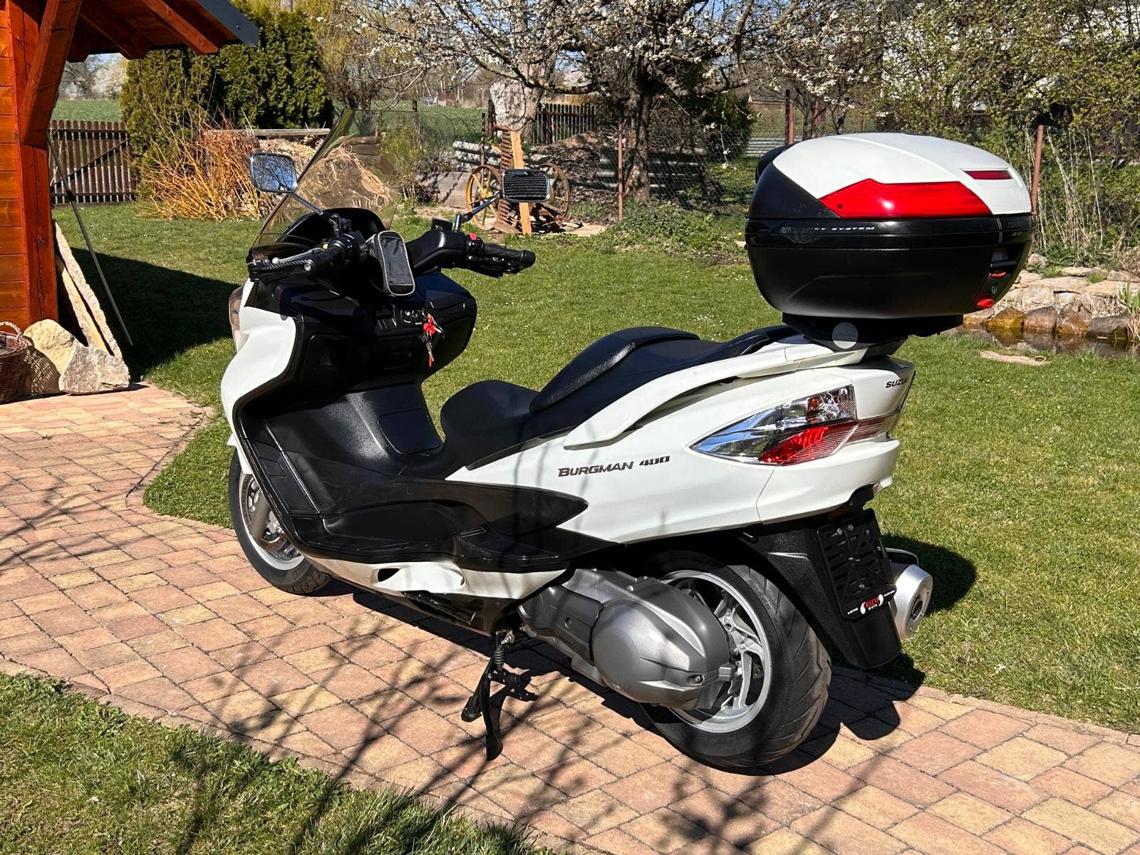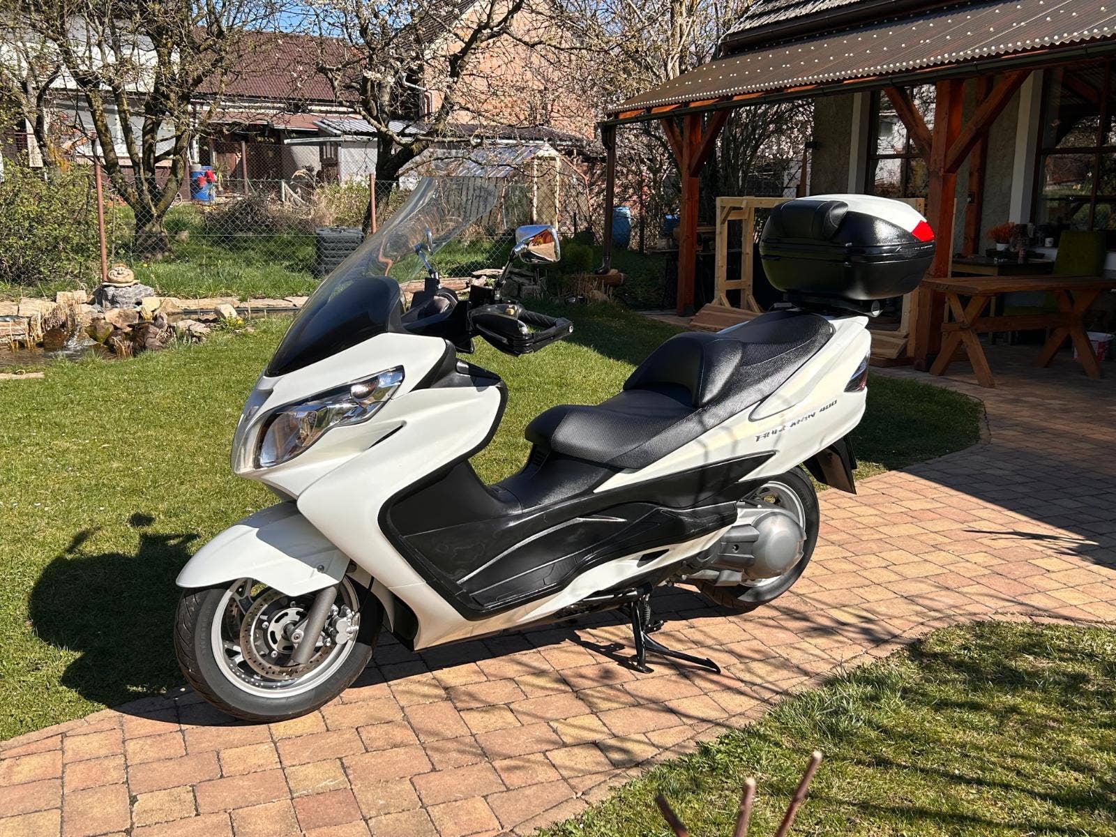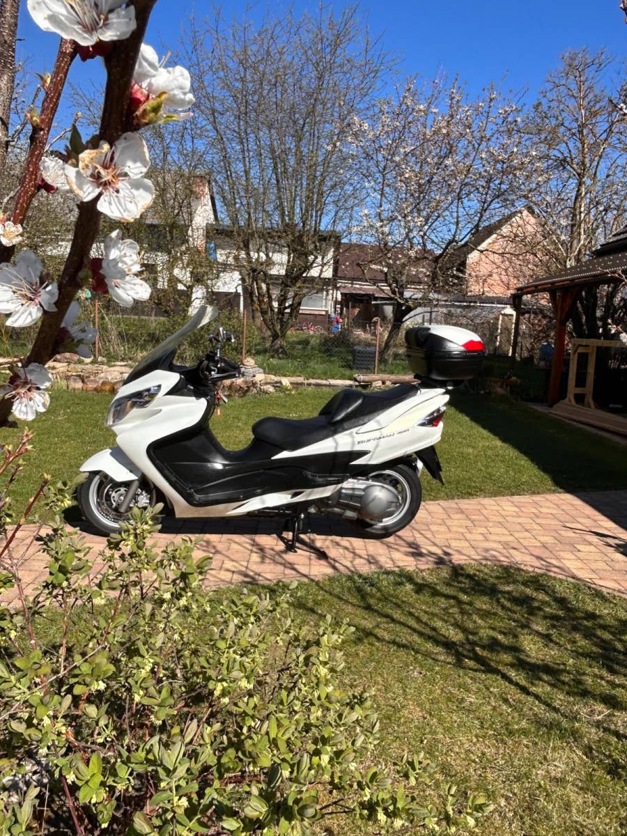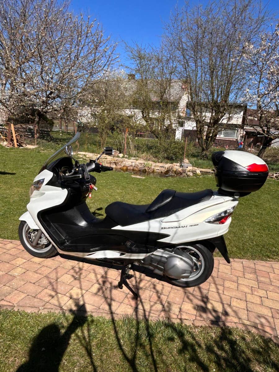 Nabízíme Suzuki AN400 Burgman v krásném, originálním stavu, pouze zalakované oděrky hrany kapotáže a podlahy. Praktický a elegantní, 4taktní jednoválcový motor, chlazený kapalinou. Hodí se jak na jízdu po městě, tak i na dlouhé výlety. Dovoz z Itálie. Nyní po servisu u nás a kontrole variátoru (v pořádku, řemen min na dalších 10 tis km).