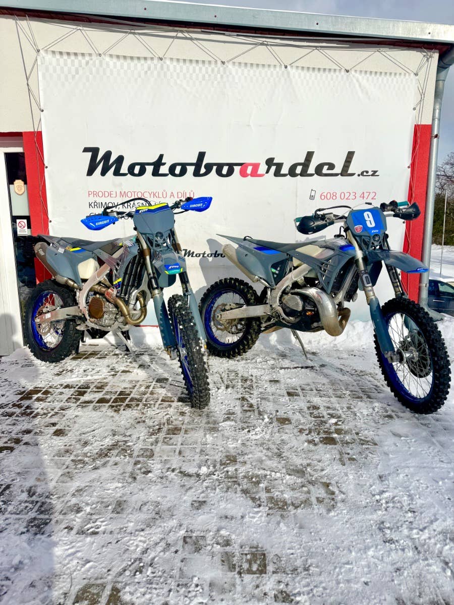 Možnost doplňků: Öhlins cartridge, kryty motoru AXP, výztuhy chladičů, frézované stupačky, nádrž 12L u 2t, silikovové hadice, blastry, kryt kotouče.