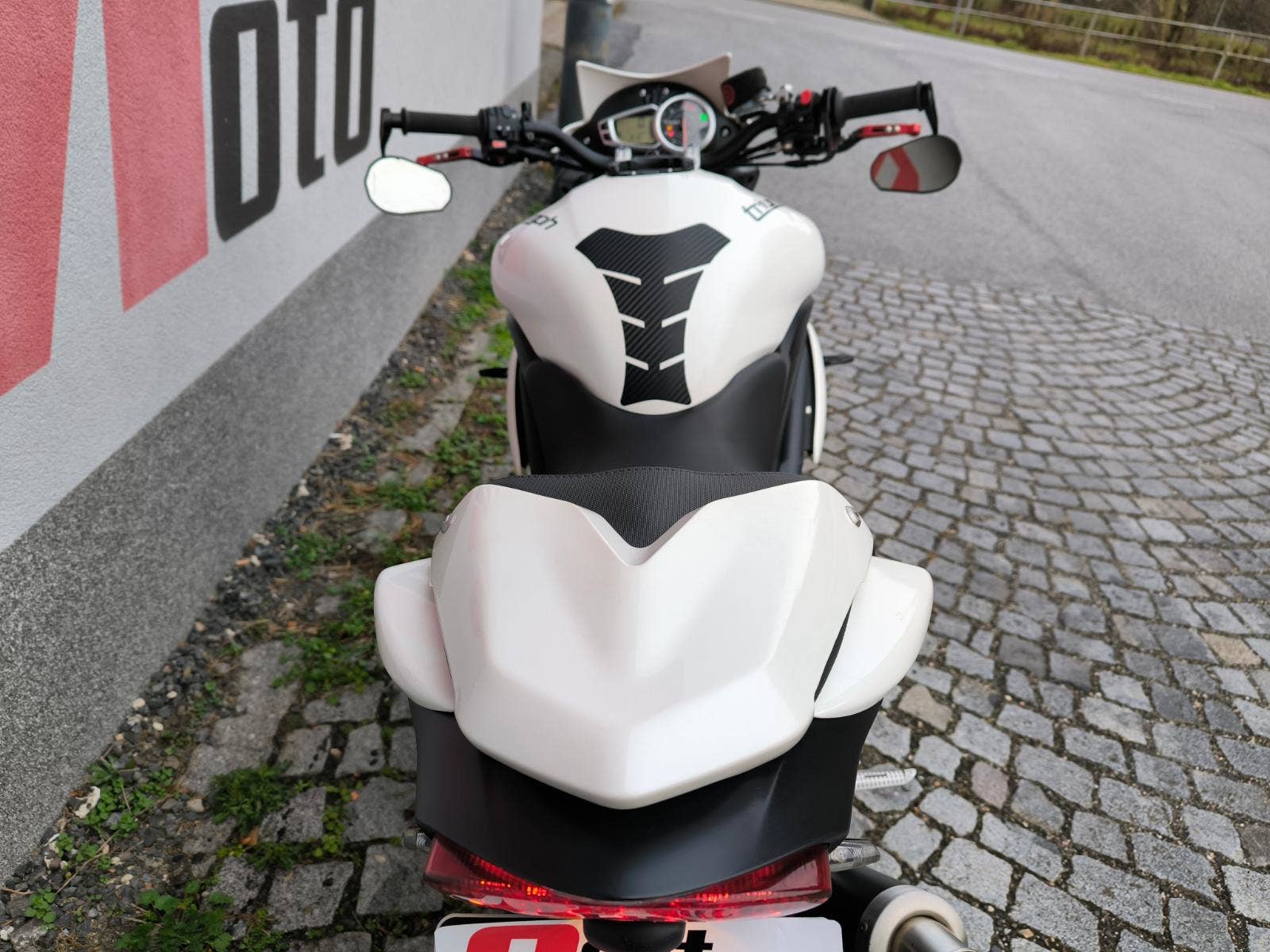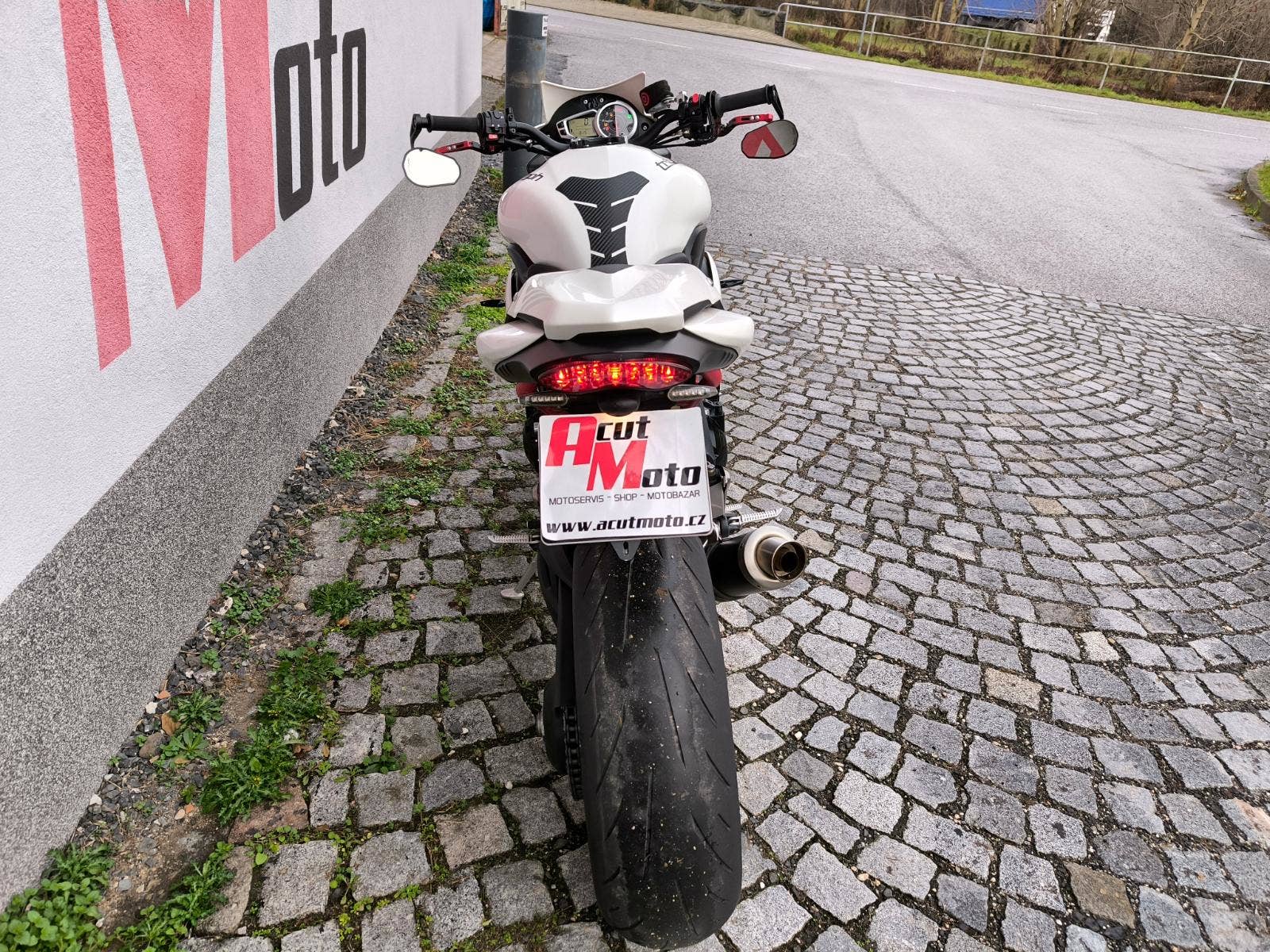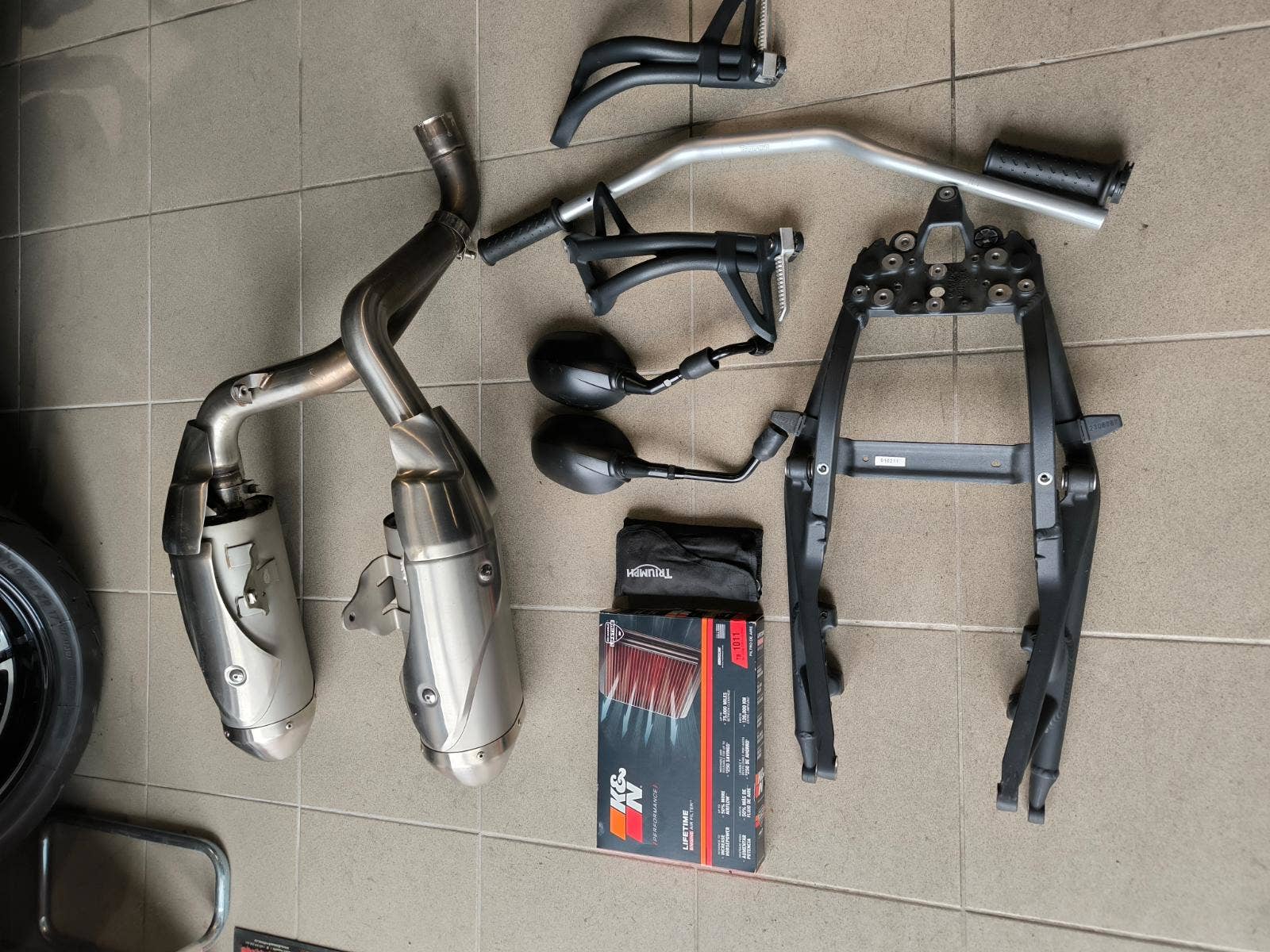 Mnoho doplňku: podsedlový rám z verze R, zrcátka, řidítka, plyn, držák SPZ, karbon blatník, laděný výfuk s homololgaci, kryt sedla, sportovní KN filtr, posuvné páčky