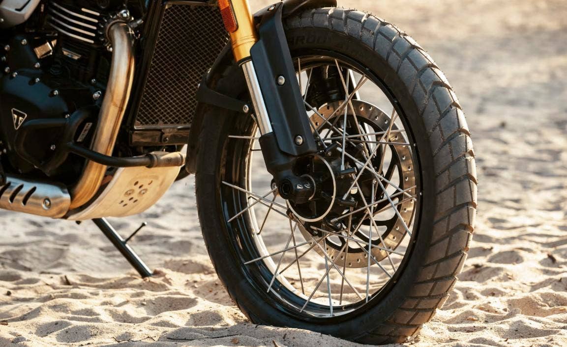 Nová verze oblíbeného Triumph Scramblera 400 nyní ve verzi XC na vyplétaných kolech s bezdušovými pneu Metzeler Karoo Street!