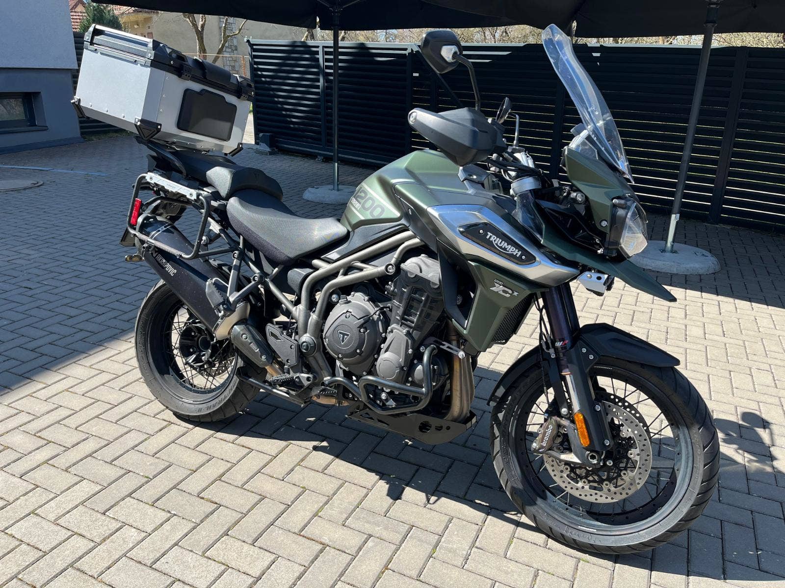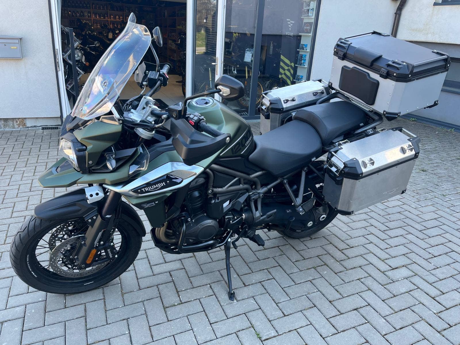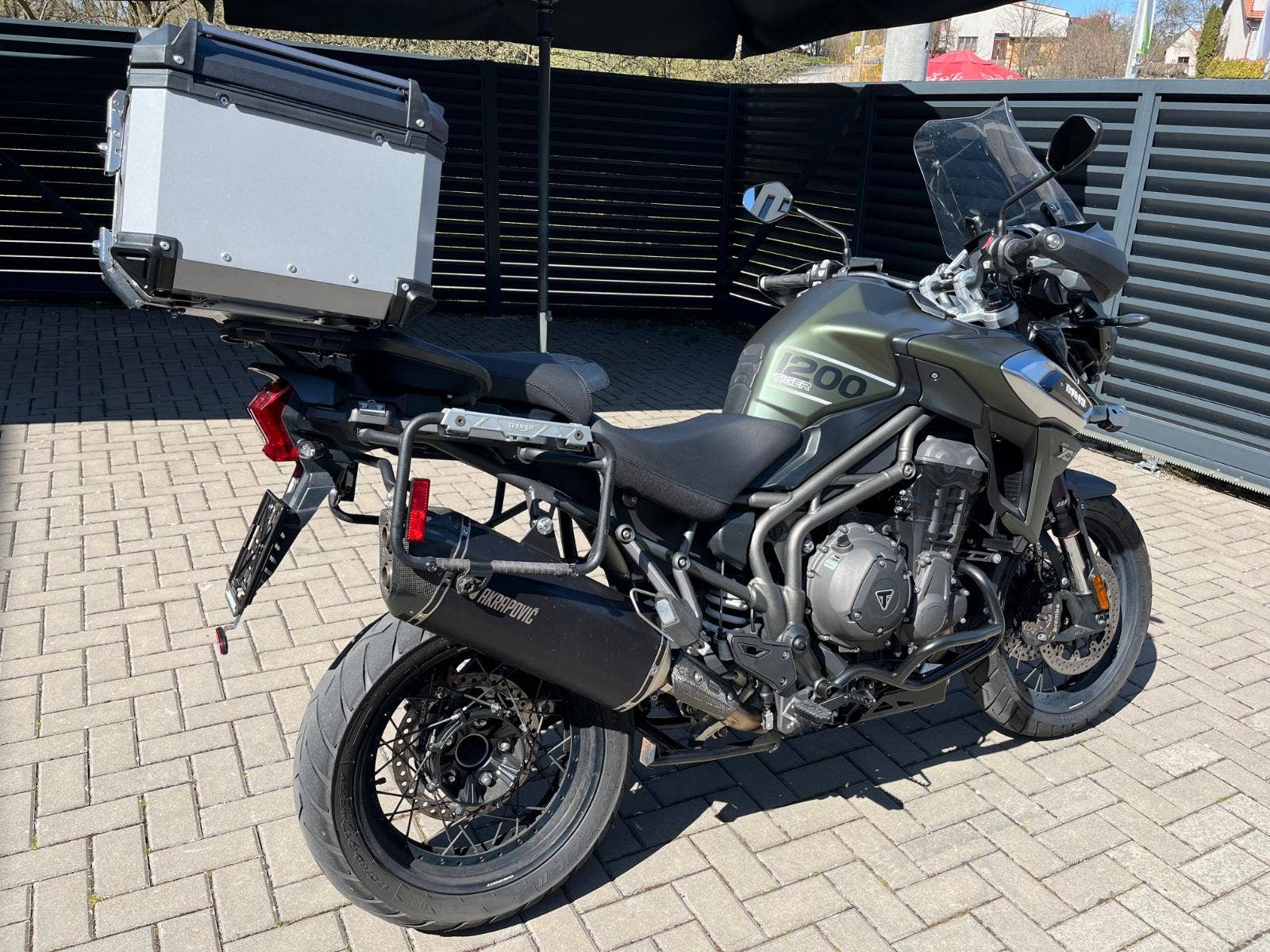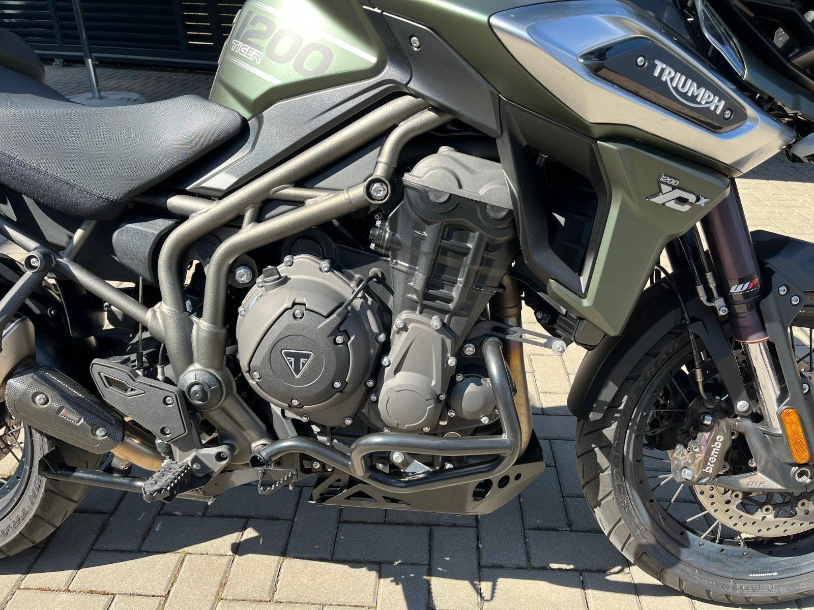 Triumph Tiger 1200 XCX 1. registrace 2020, najeto 28.900 km, výkon 103 kW. ABS, elektronicky nastavitelné odpružení, 4 režimy jízdy, kontrola trakce, 3x hliníkový kufr, LED světla, padací rám, centrální stojan, elektronicky nastavitelné plexi, přídavná světla, tempomat, vyhřívané sedlo a rukojeti, homologovaný laděný výfuk Akrapovič.