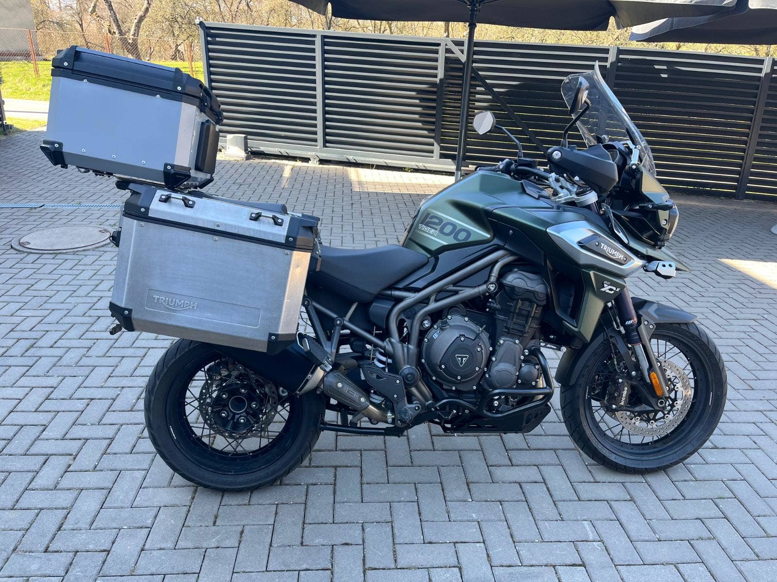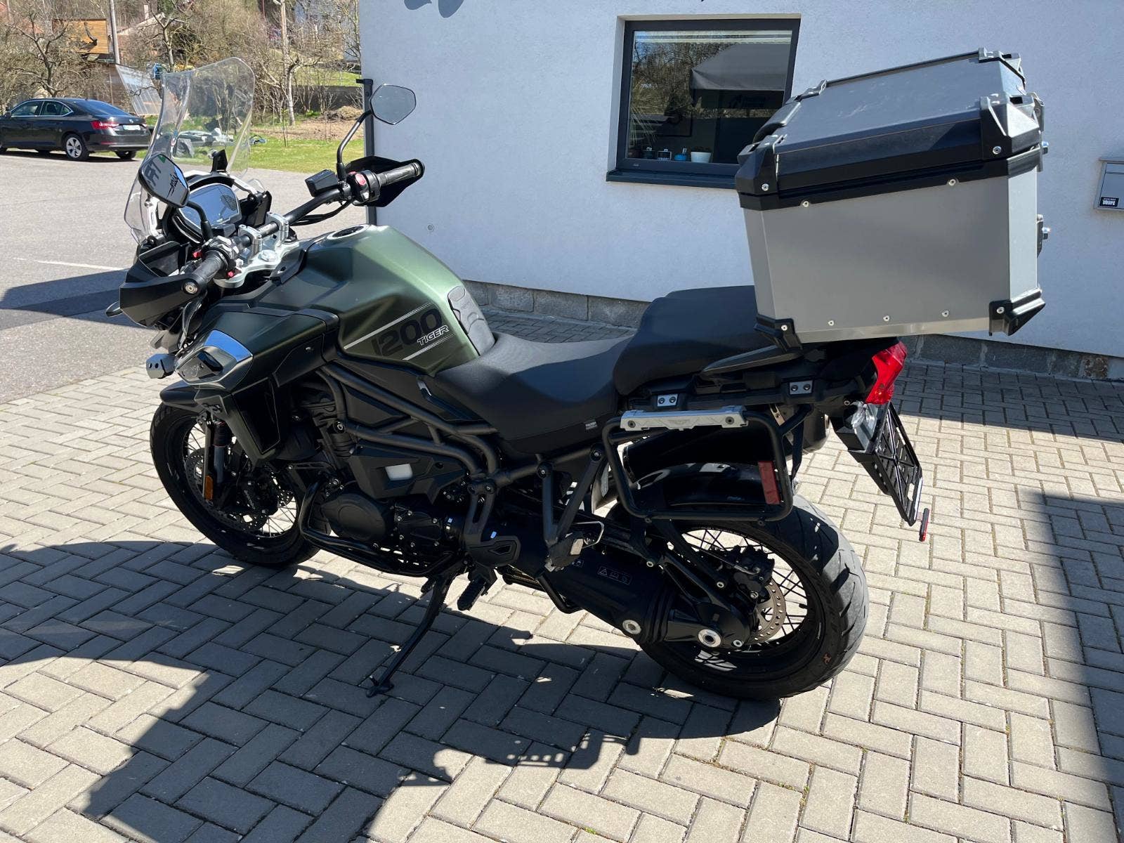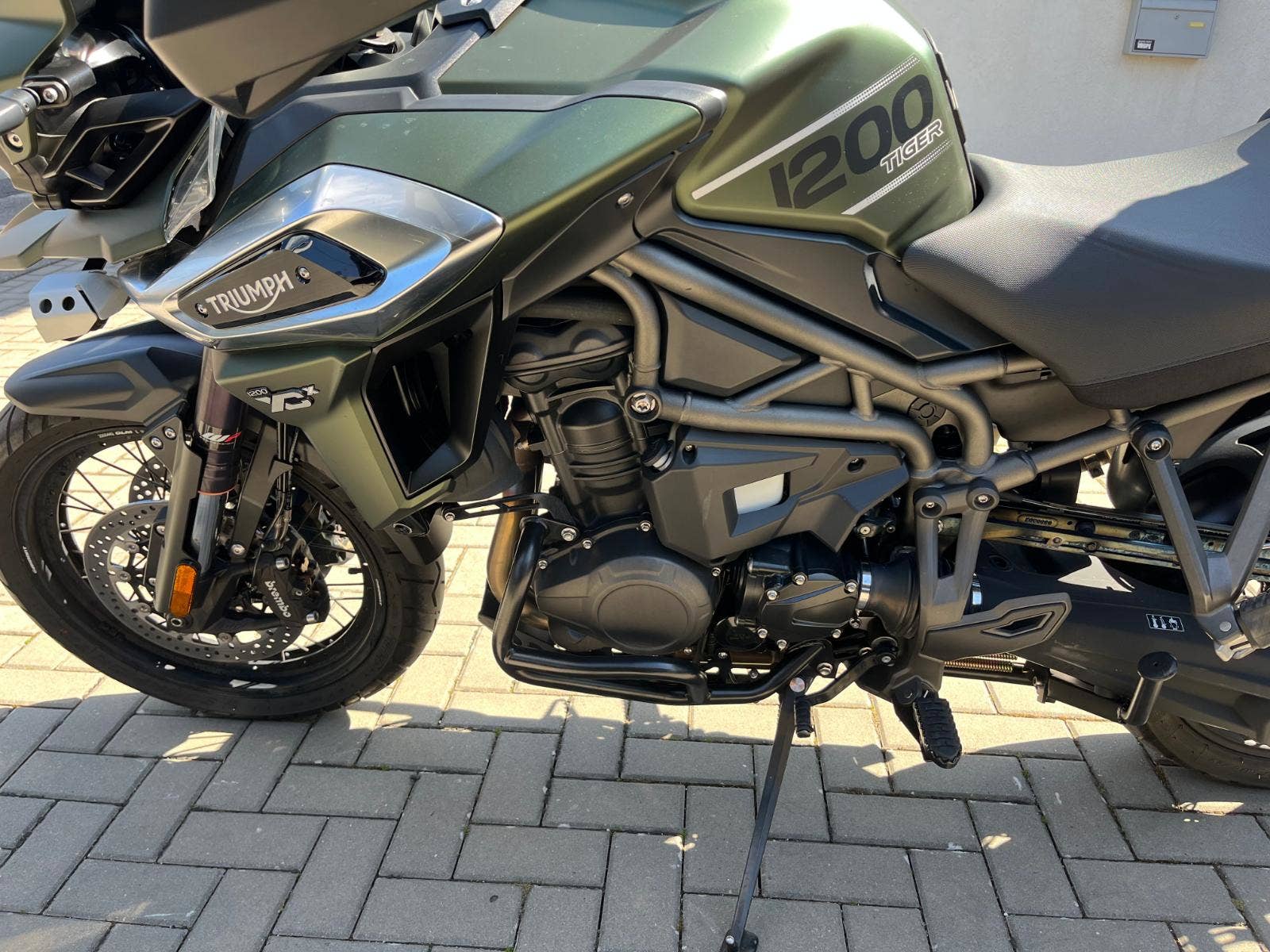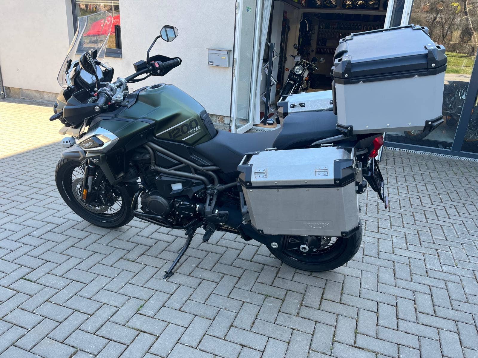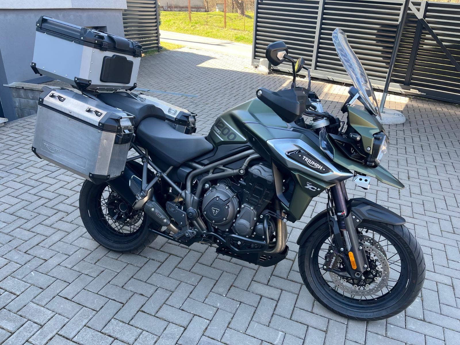 Triumph Tiger 1200 XCX 1. registrace 2020, najeto 28.900 km, výkon 103 kW. ABS, elektronicky nastavitelné odpružení, 4 režimy jízdy, kontrola trakce, 3x hliníkový kufr, LED světla, padací rám, centrální stojan, elektronicky nastavitelné plexi, přídavná světla, tempomat, vyhřívané sedlo a rukojeti, homologovaný laděný výfuk Akrapovič.