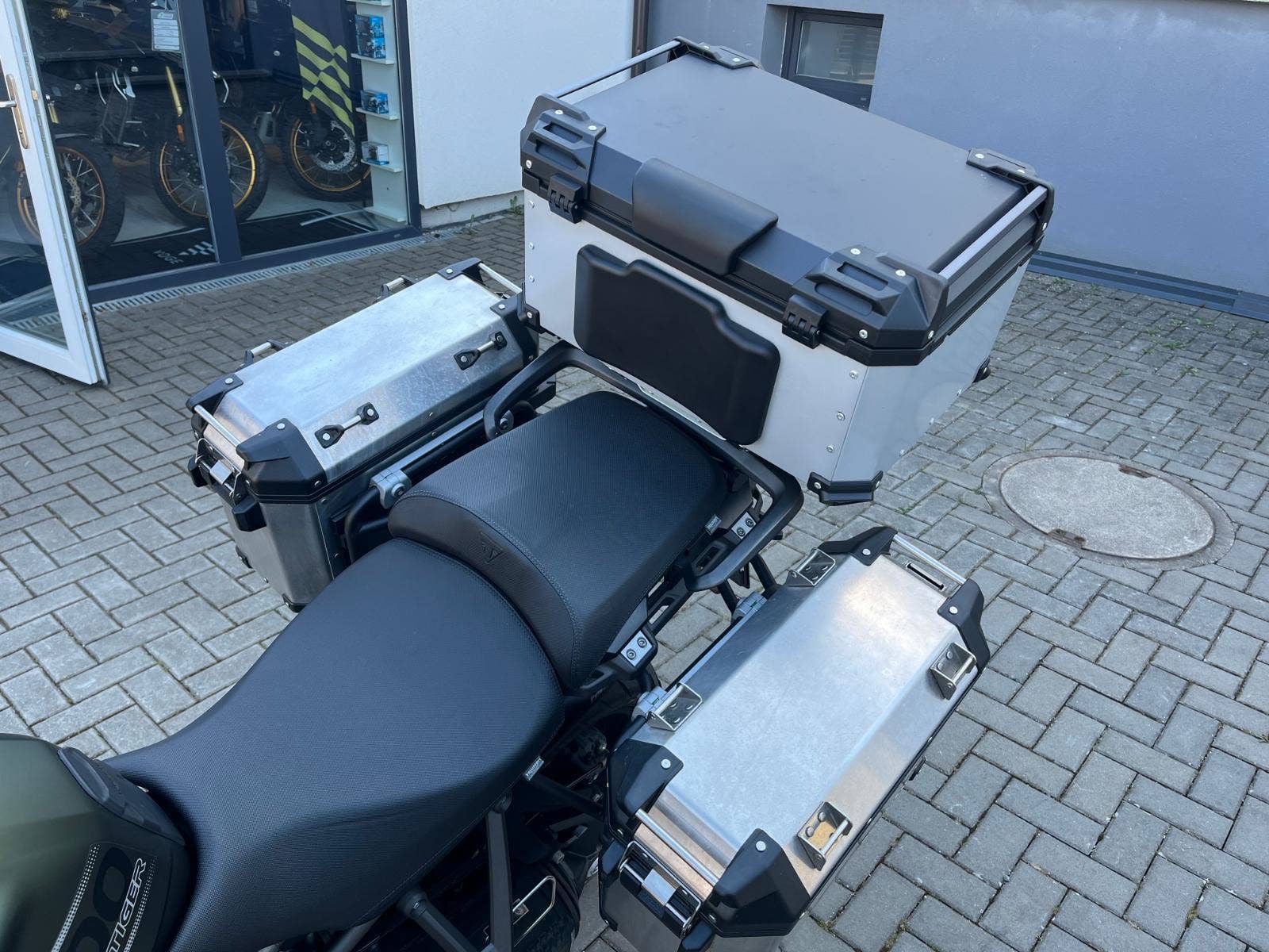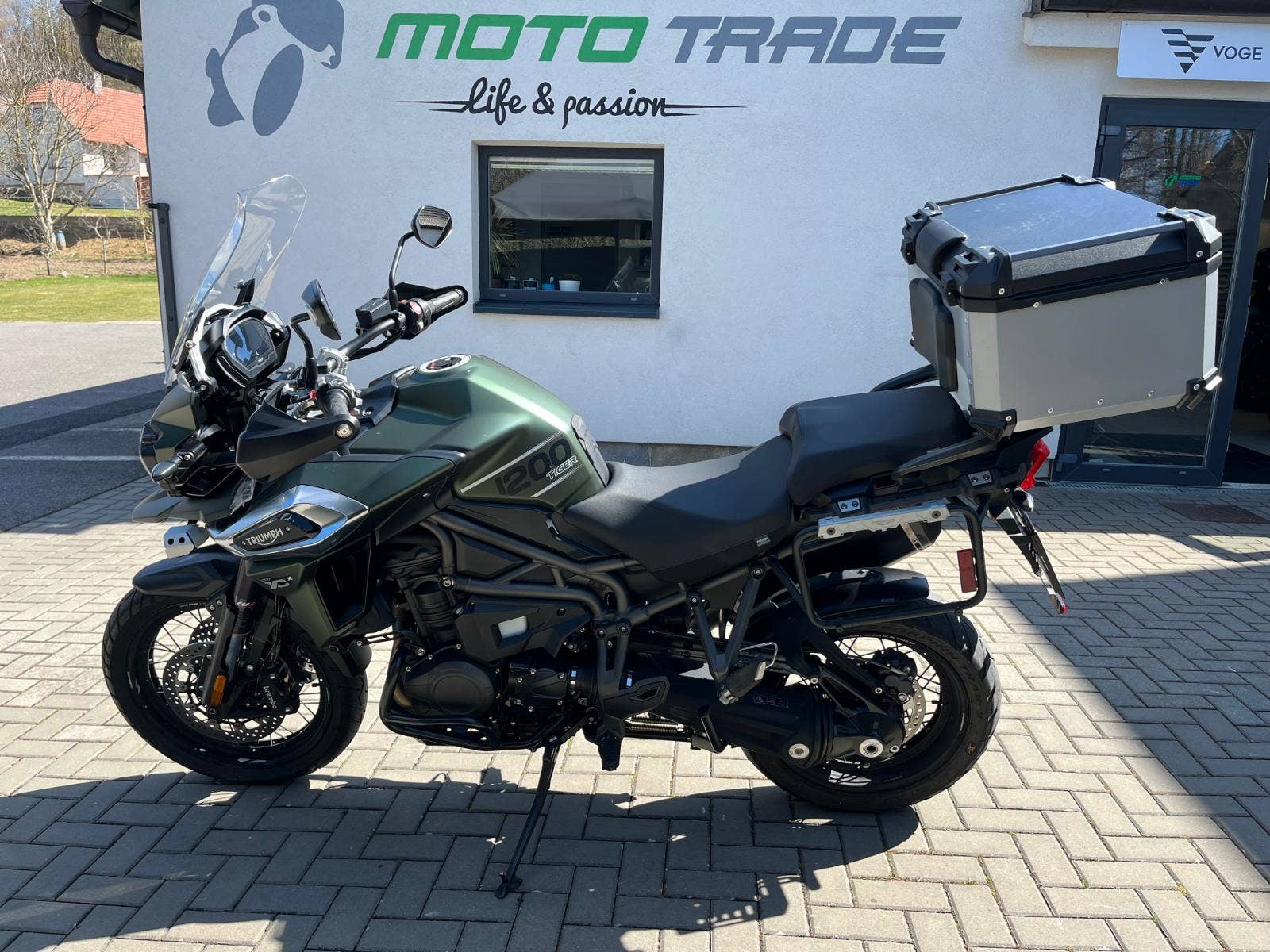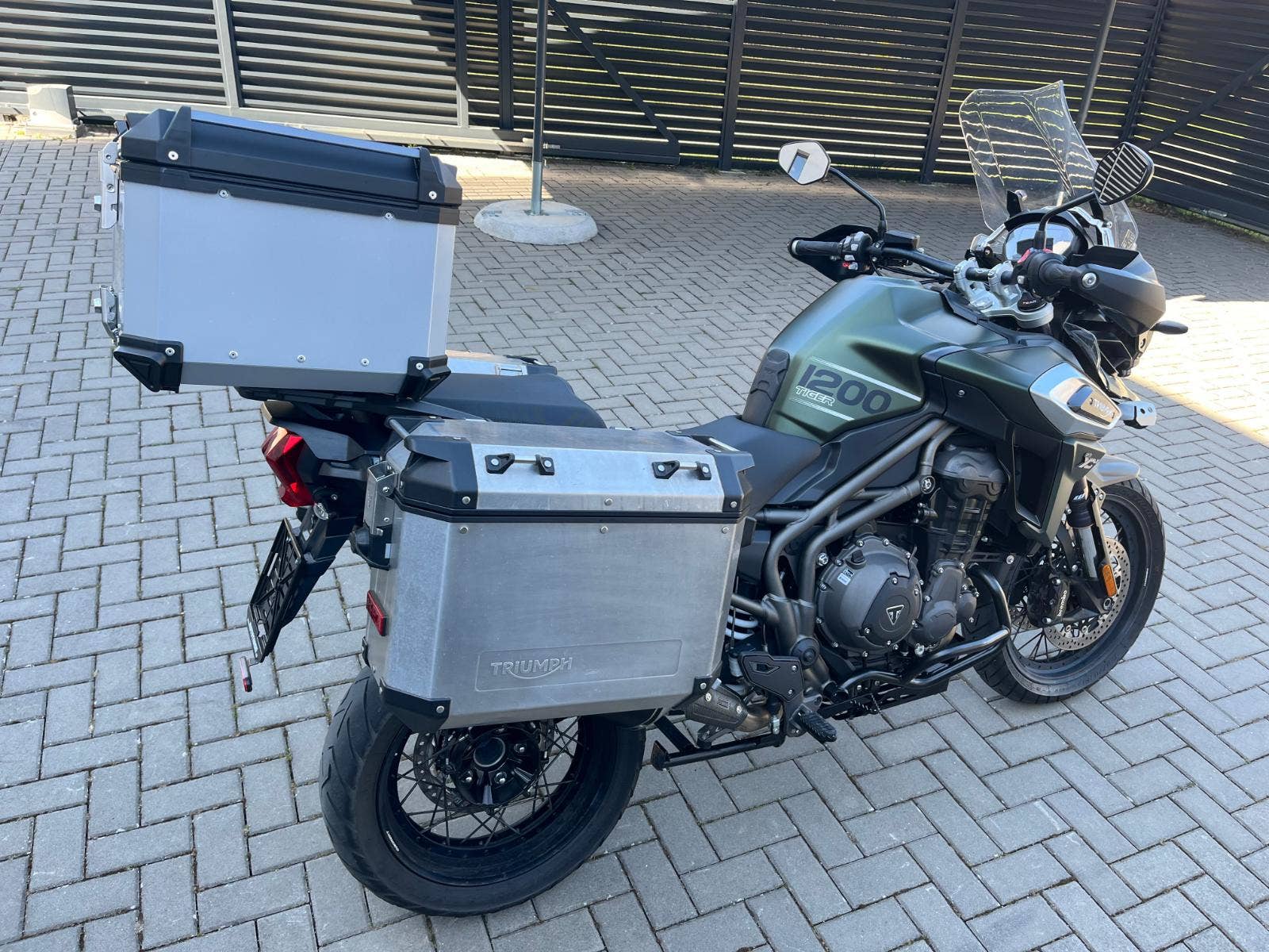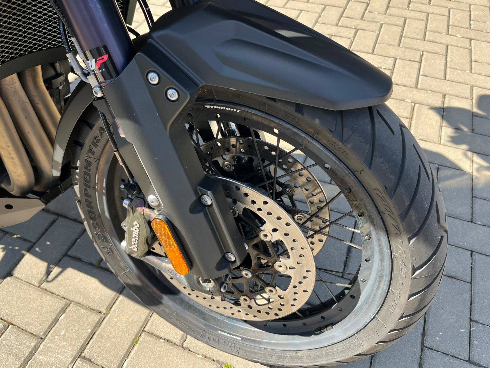 Triumph Tiger 1200 XCX 1. registrace 2020, najeto 28.900 km, výkon 103 kW. ABS, elektronicky nastavitelné odpružení, 4 režimy jízdy, kontrola trakce, 3x hliníkový kufr, LED světla, padací rám, centrální stojan, elektronicky nastavitelné plexi, přídavná světla, tempomat, vyhřívané sedlo a rukojeti, homologovaný laděný výfuk Akrapovič.