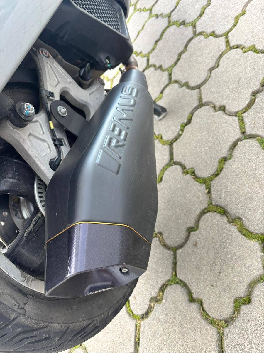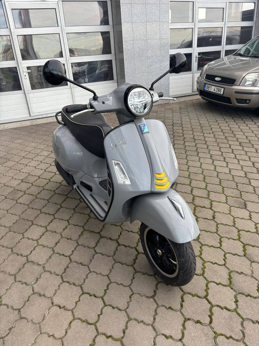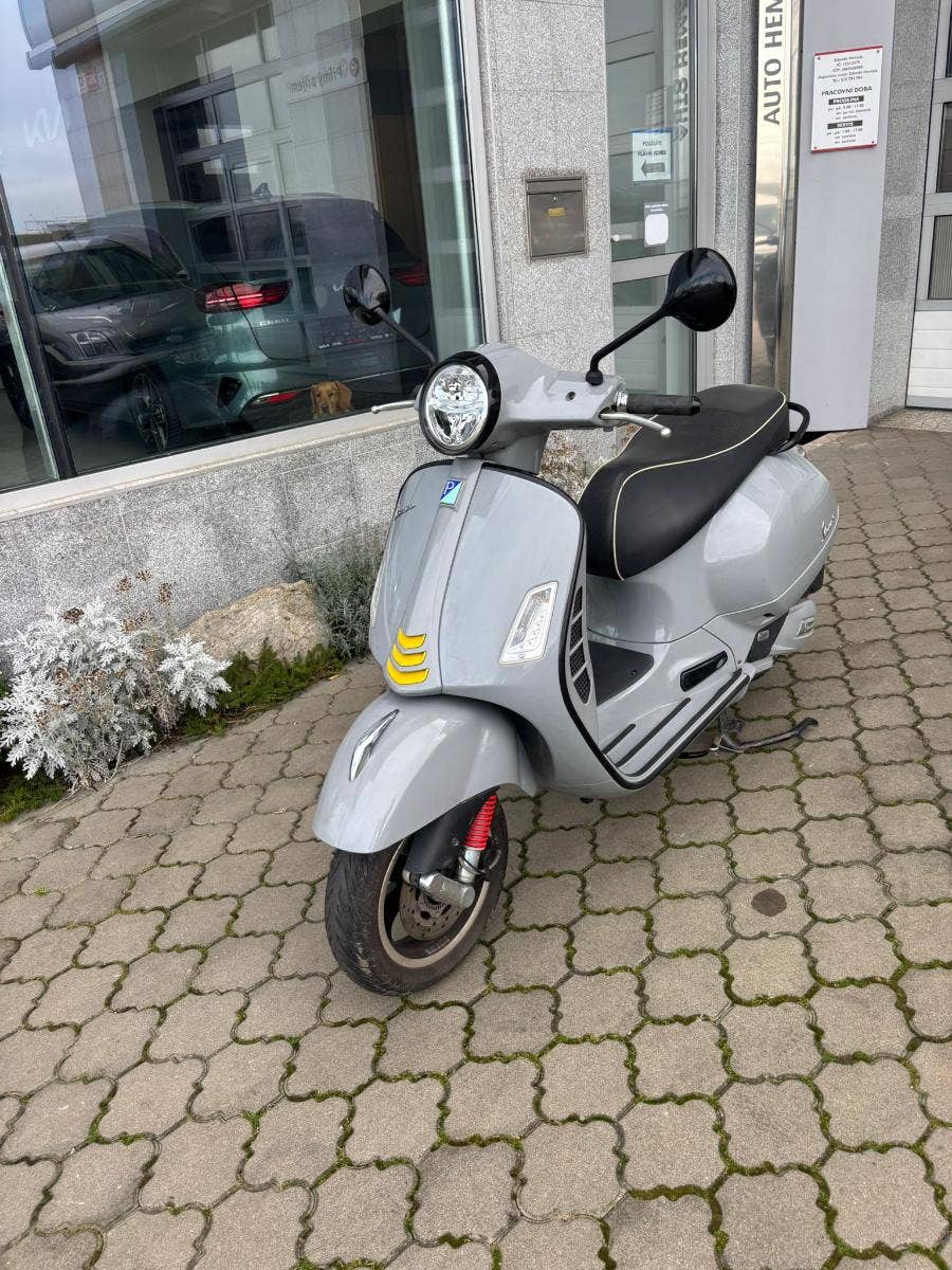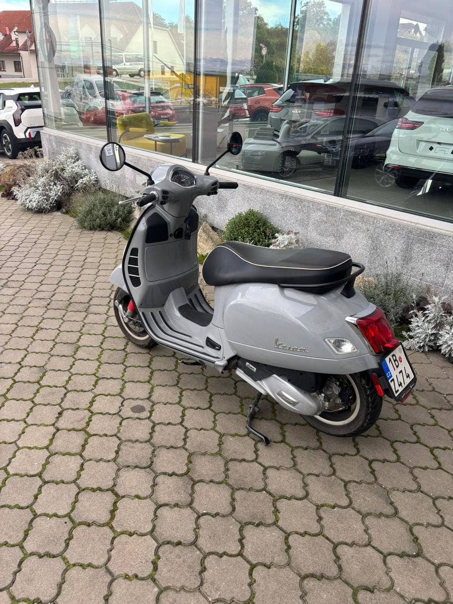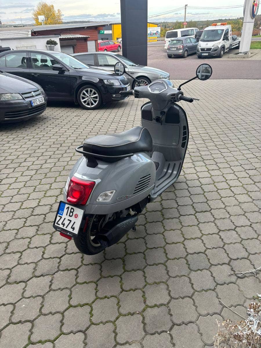 Ojetý skútr Vespa GTS 125 v pastelové šedé barvě GRIGIO MATERIA. Bez odpočtu DPH. Navíc černé lemy + výfuk REMUS.