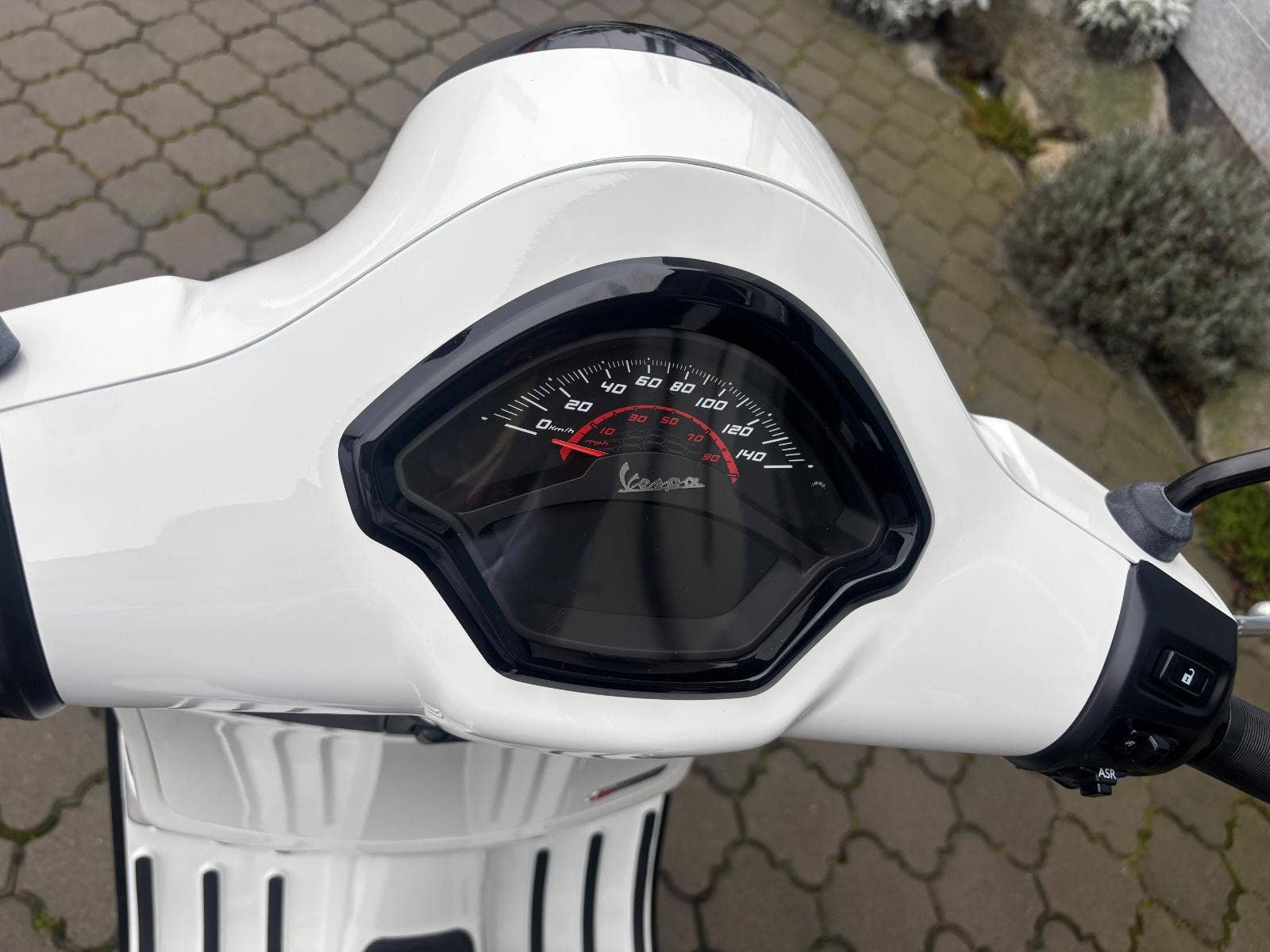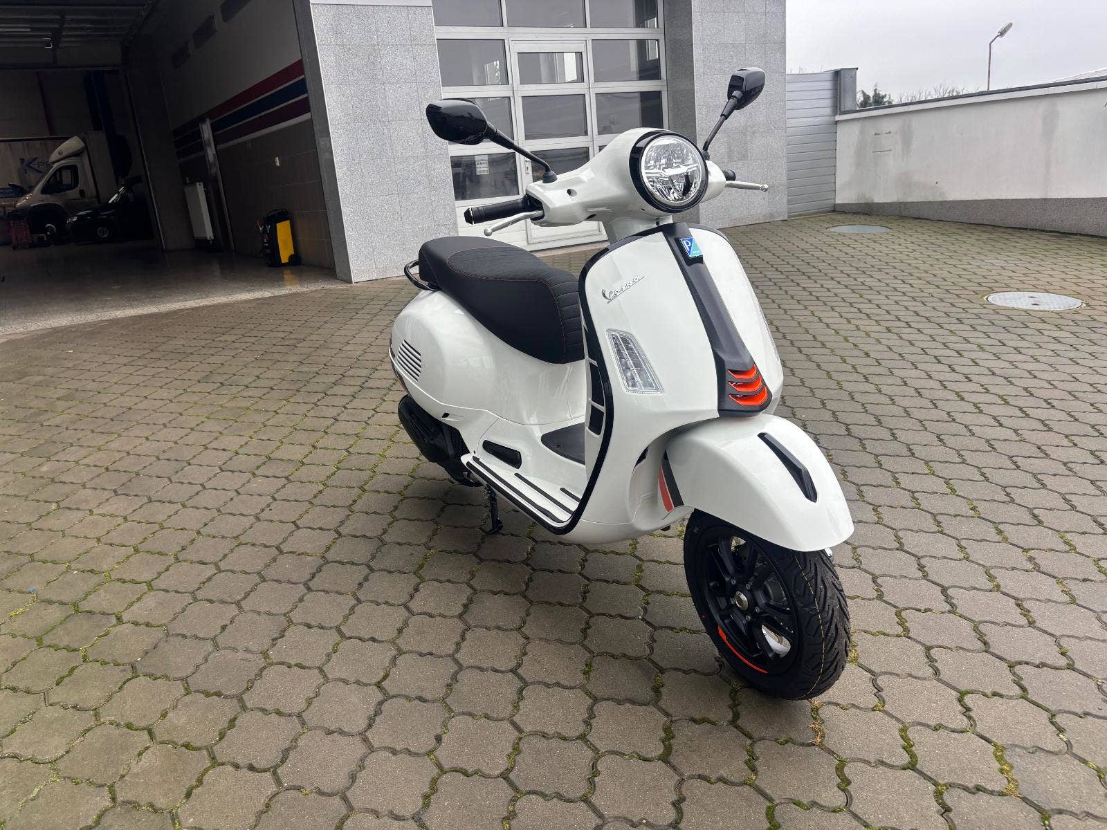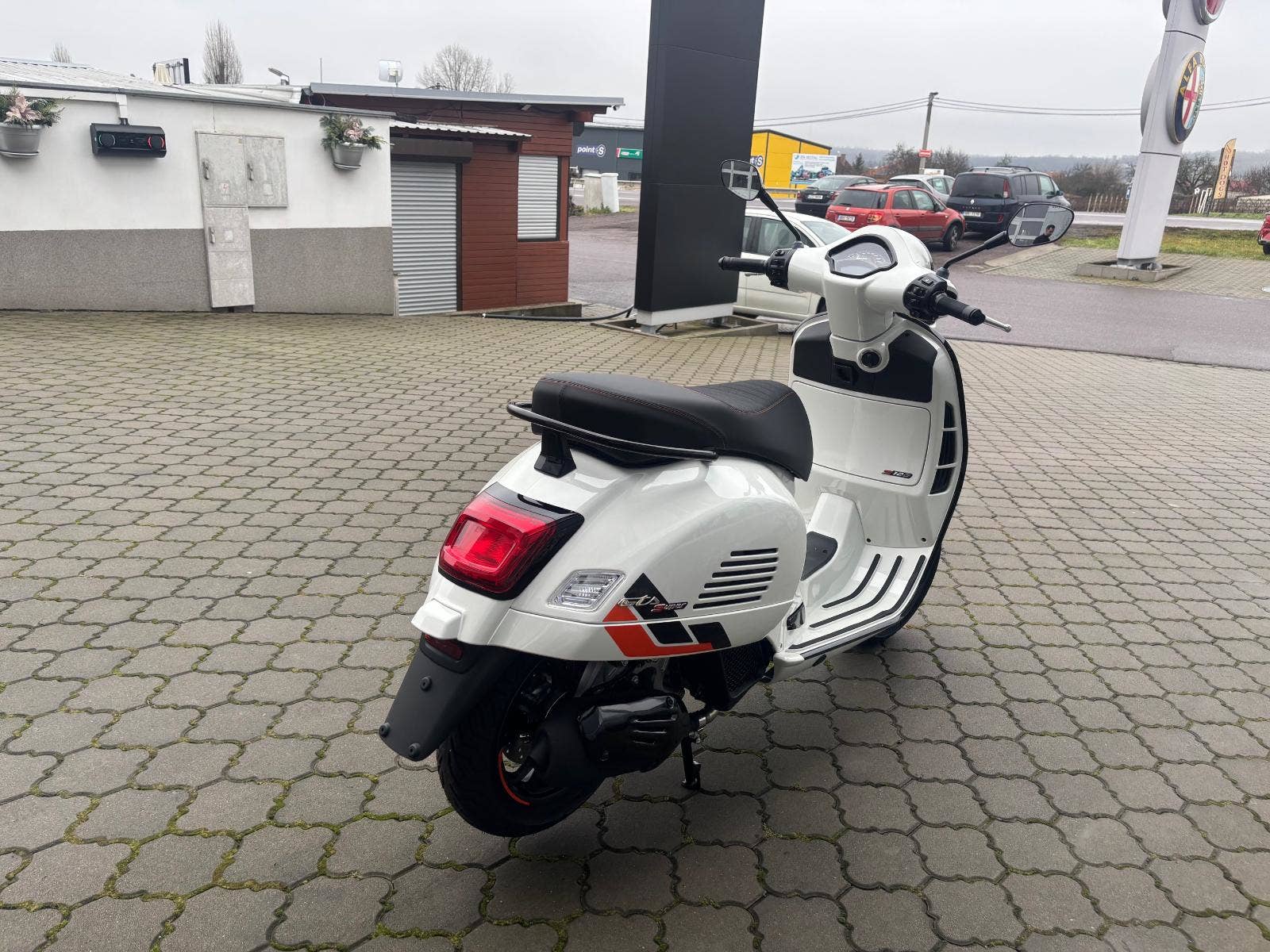 Nový skútr Vespa GTS ve verzi SuperSport v bílé barvě se sportovními nálepkami, černé lemy, černá kola, prošívané sedlo. Dodání skladem. Záruka 4 roky. Možnost financování s 0 navýášením.