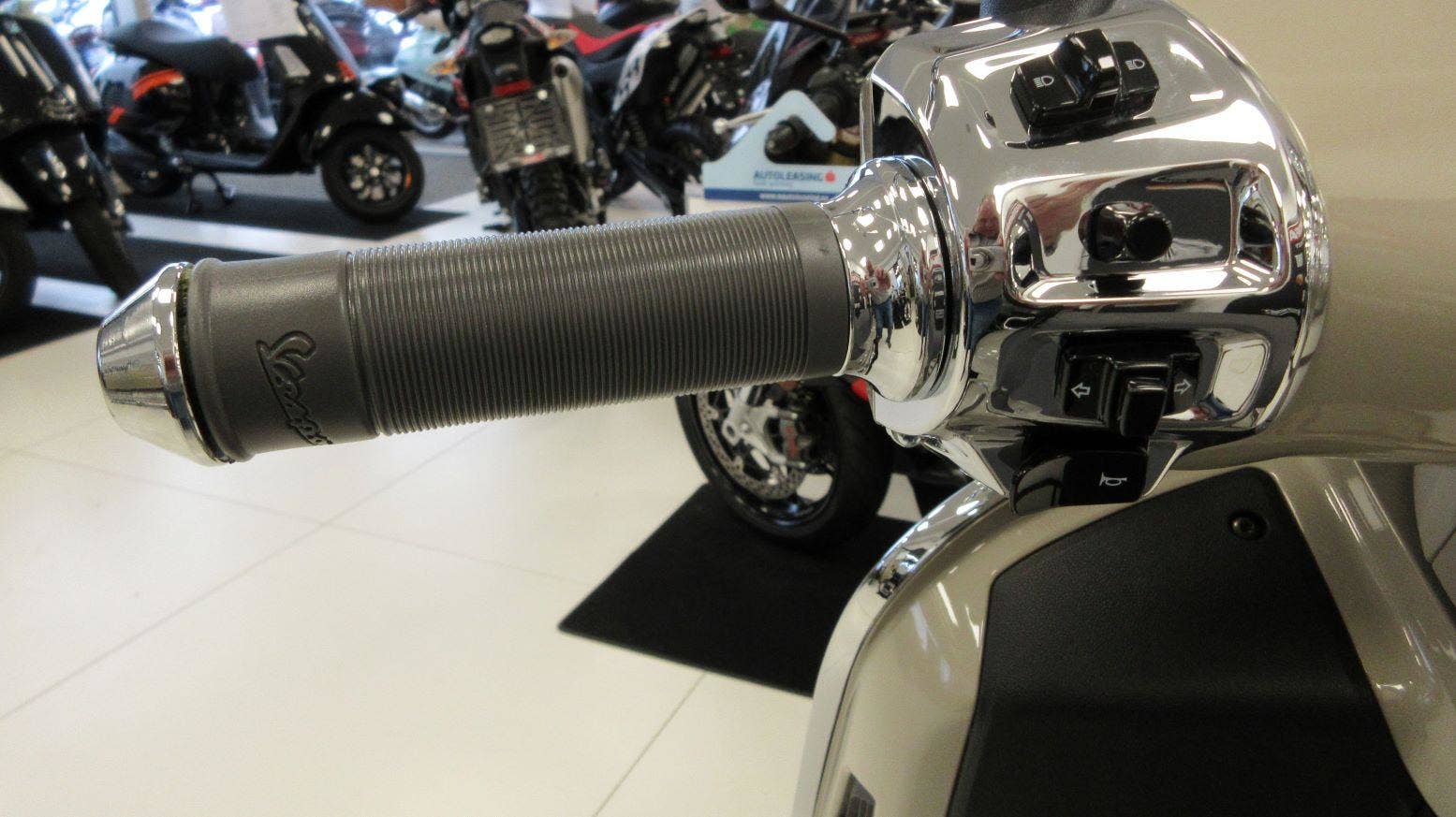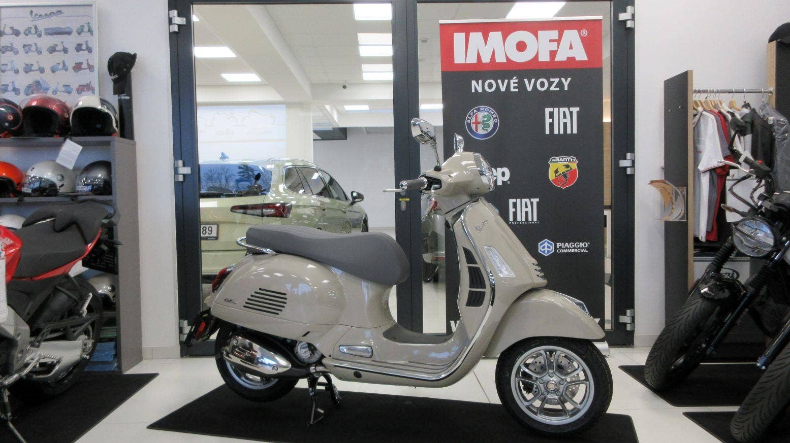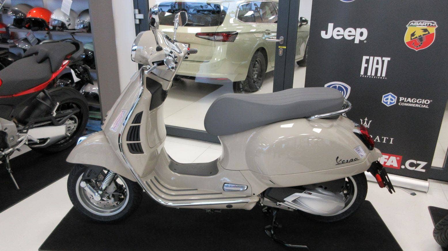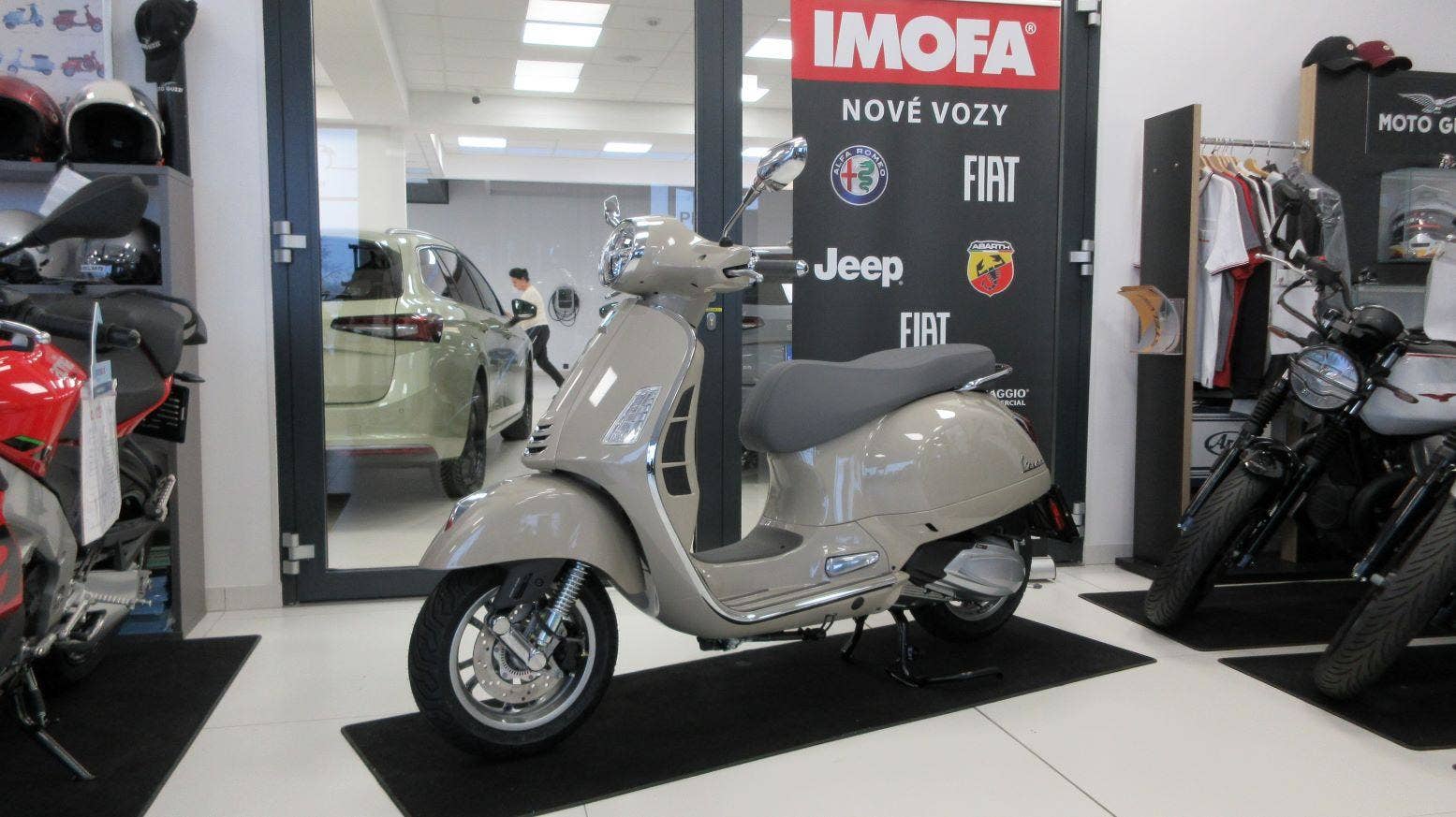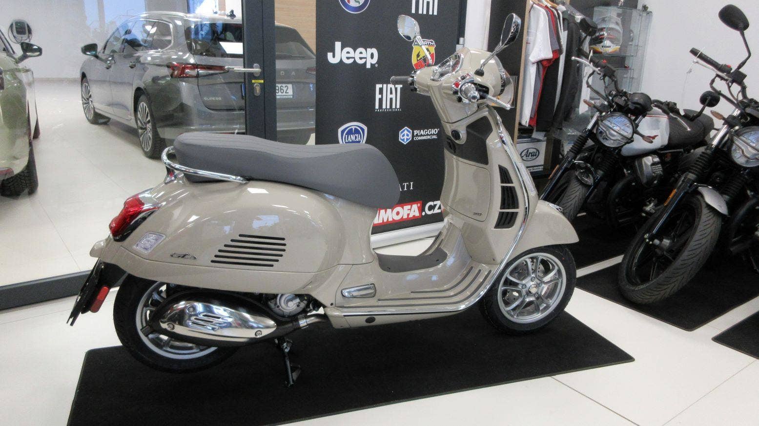 Silná GTS 310 v béžovém retrokabátě Beige Avvolgente - béžová perleťová metalíza a chromované detaily. Moderní GTS nepostrádá LED světla, bezklíčkové ovládání, ABS, palubní počítač, Bike Finder nebo USB konektor.
