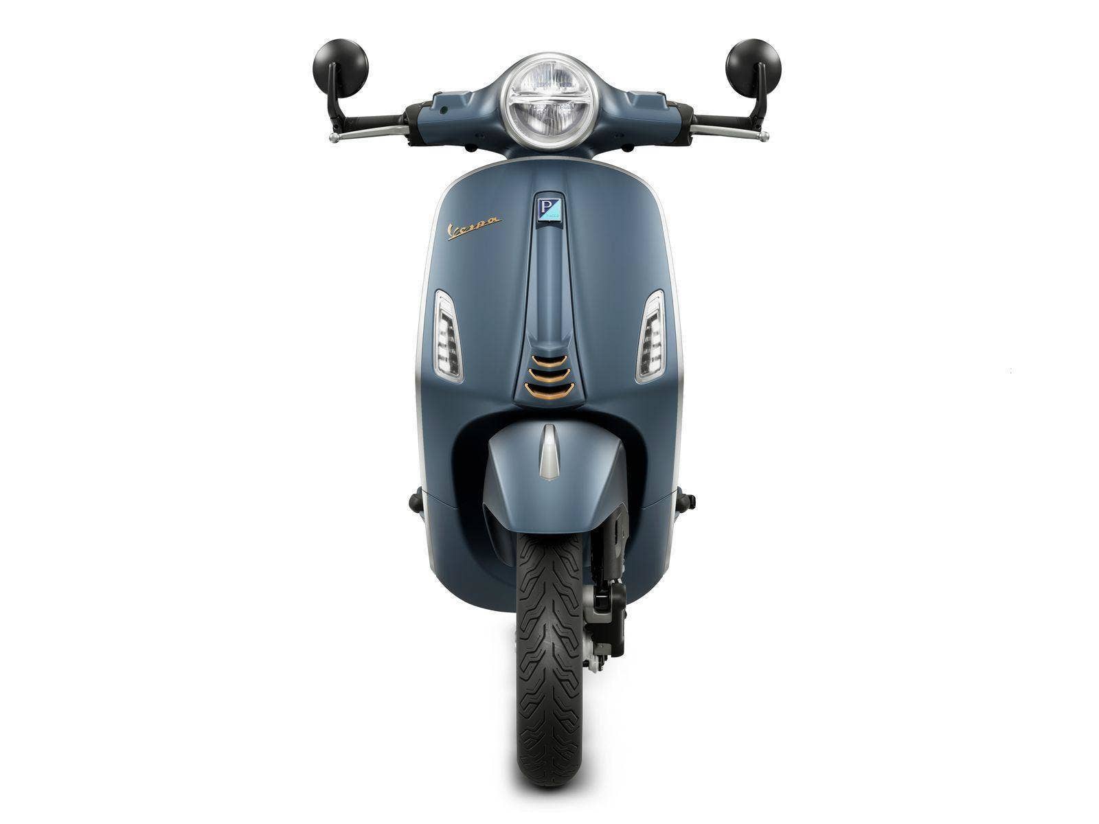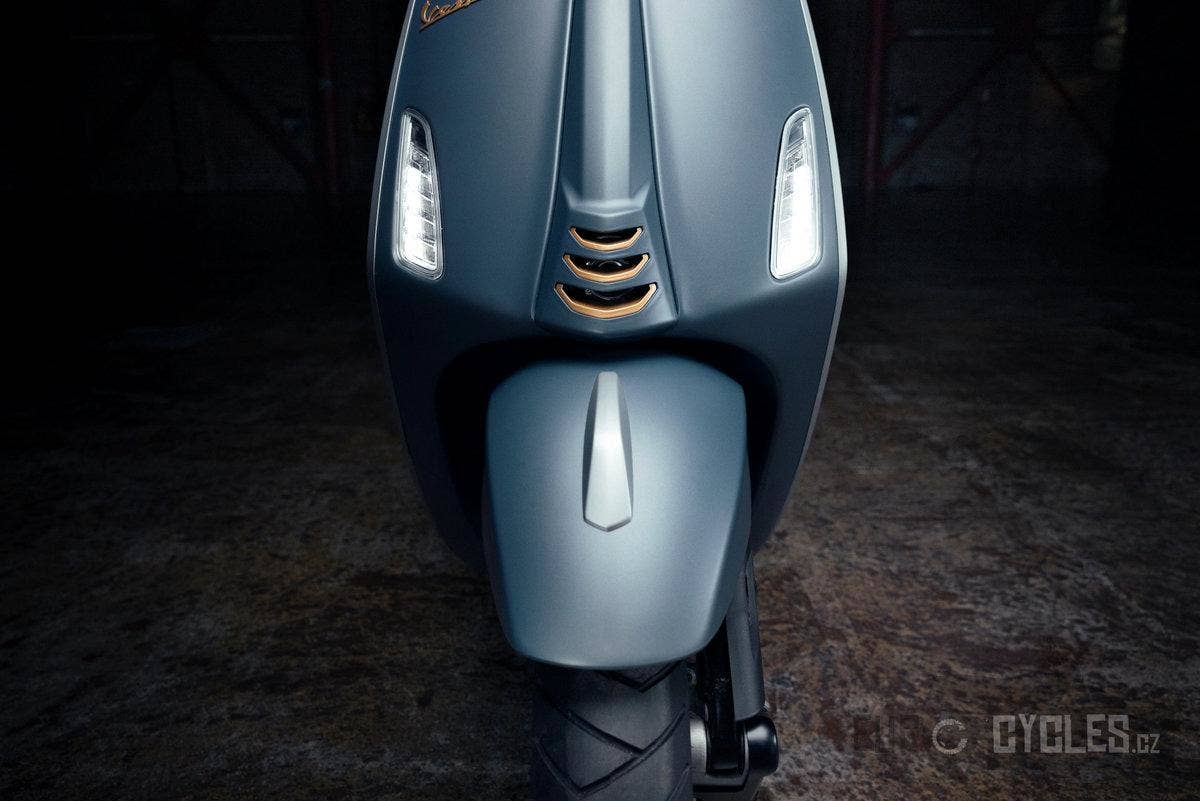 Speciální edice Officina 8, zaujme barvou Blu Officina 8. Vhodně sladěné jsou také mosazně zbarvená kola, výplně kaskády a loga na přední části a bocích skútru. Na bocích sedla najdeme také mosazné nýty. Na zadní straně přední části je umístěna plaketa s historickým logem Officina 8. Chromové lišty a prstenec světlometu mají vzhled broušeného hliníku. Na první pohled zaujmou i černá zpětná zrcátka na koncích řídítek – poprvé oficiálně použitá na Vespě.